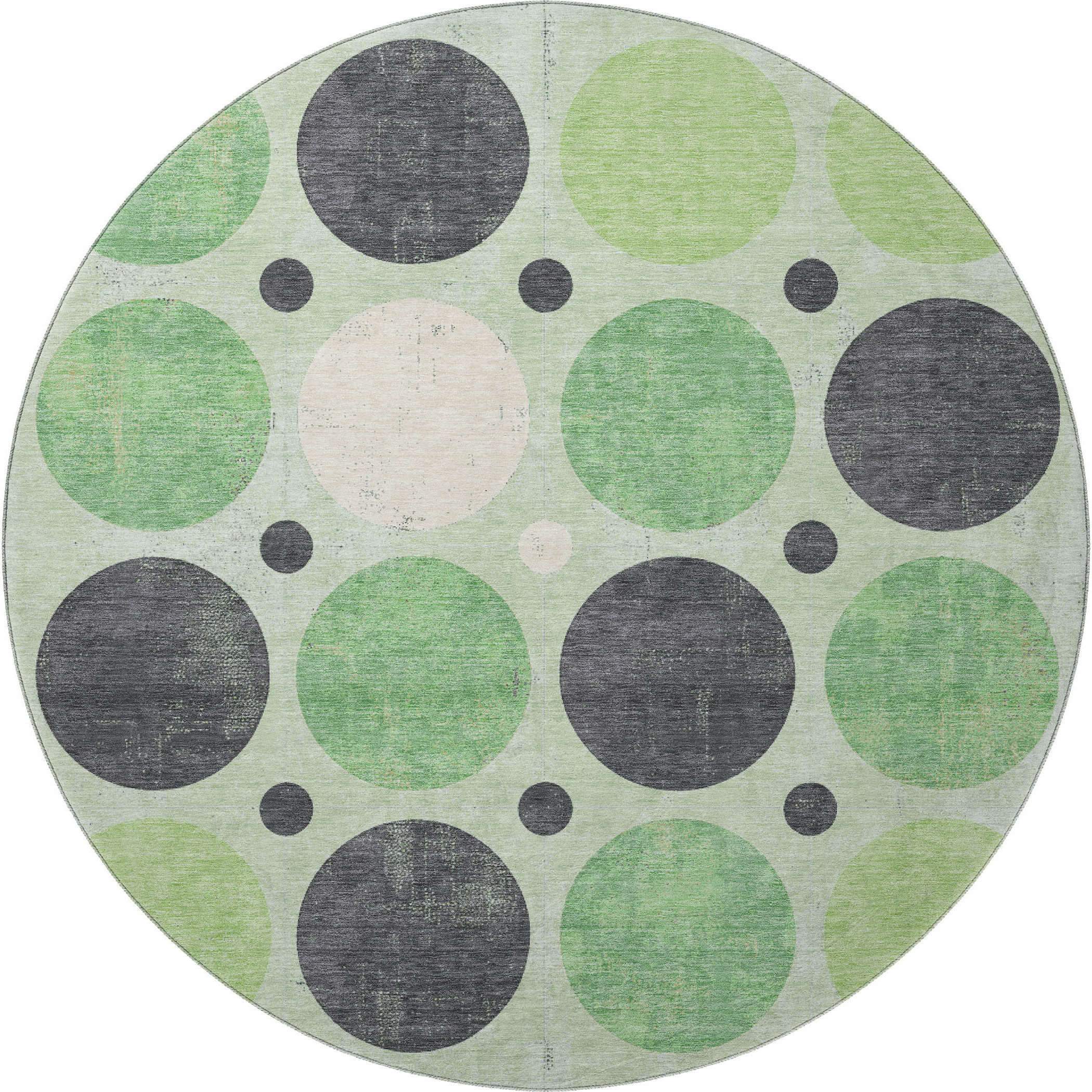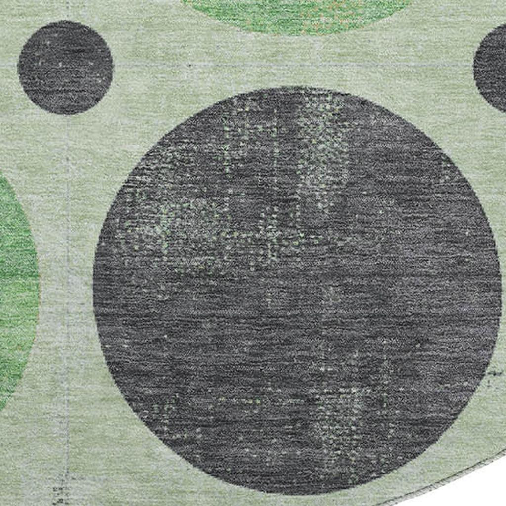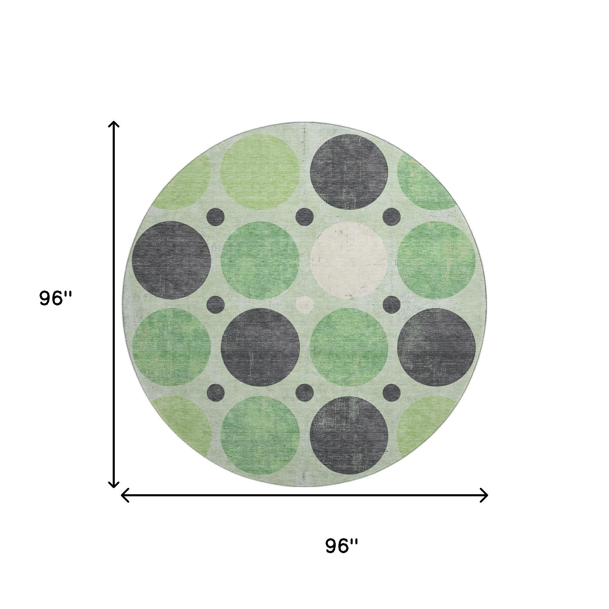 This 8-foot green ivory and charcoal geometric washable round rug with uv protection, is a great way to add warmth to a room. Ideal for spaces with kids and pets, this rug is stain resistant to help repel dirt and spilled liquids. Built to last, this rug crafted from polyester fibers is known for its durability and long lasting appeal. Rugs are a great way to showcase your style, hide imperfections, warm your home and reduce noise. This larger sized, transitional styled rug is ready to create a focal point or statement piece in your room. 96.00-inch h x 96.00-inch w x 0.39-inch d.
