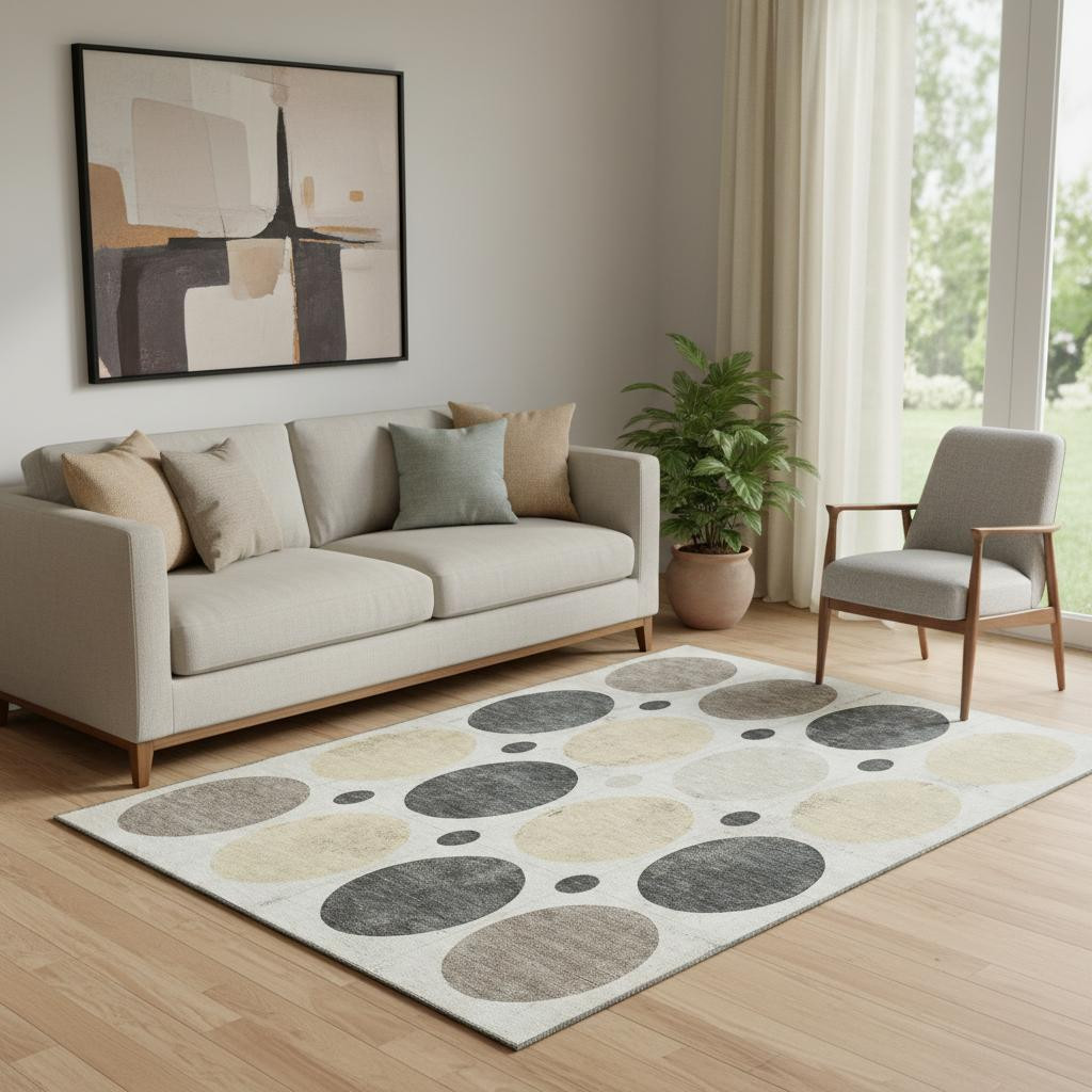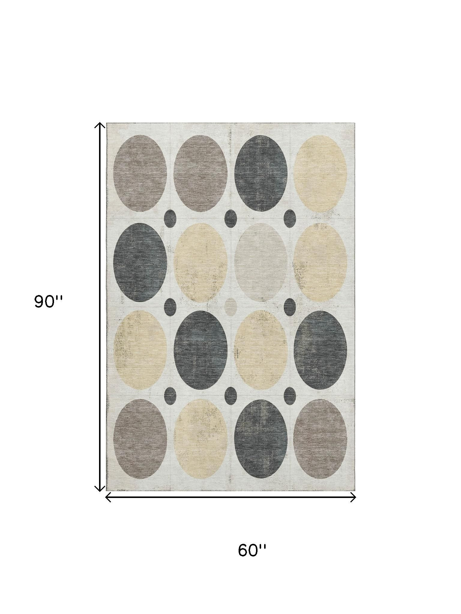 Add some artistry to your room with this 5-foot x 8-foot ivory charcoal and beige geometric washable area rug with uv protection. Ideal for spaces with kids and pets, this rug is stain resistant to help repel dirt and spilled liquids. Built to last, this rug crafted from polyester fibers is known for its durability and long lasting appeal. Rugs are a great way to showcase your style, hide imperfections, warm your home and reduce noise. This larger sized, transitional styled rug is ready to create a focal point or statement piece in your room. 60.00-inch h x 90.00-inch w x 0.39-inch d.