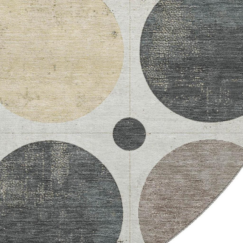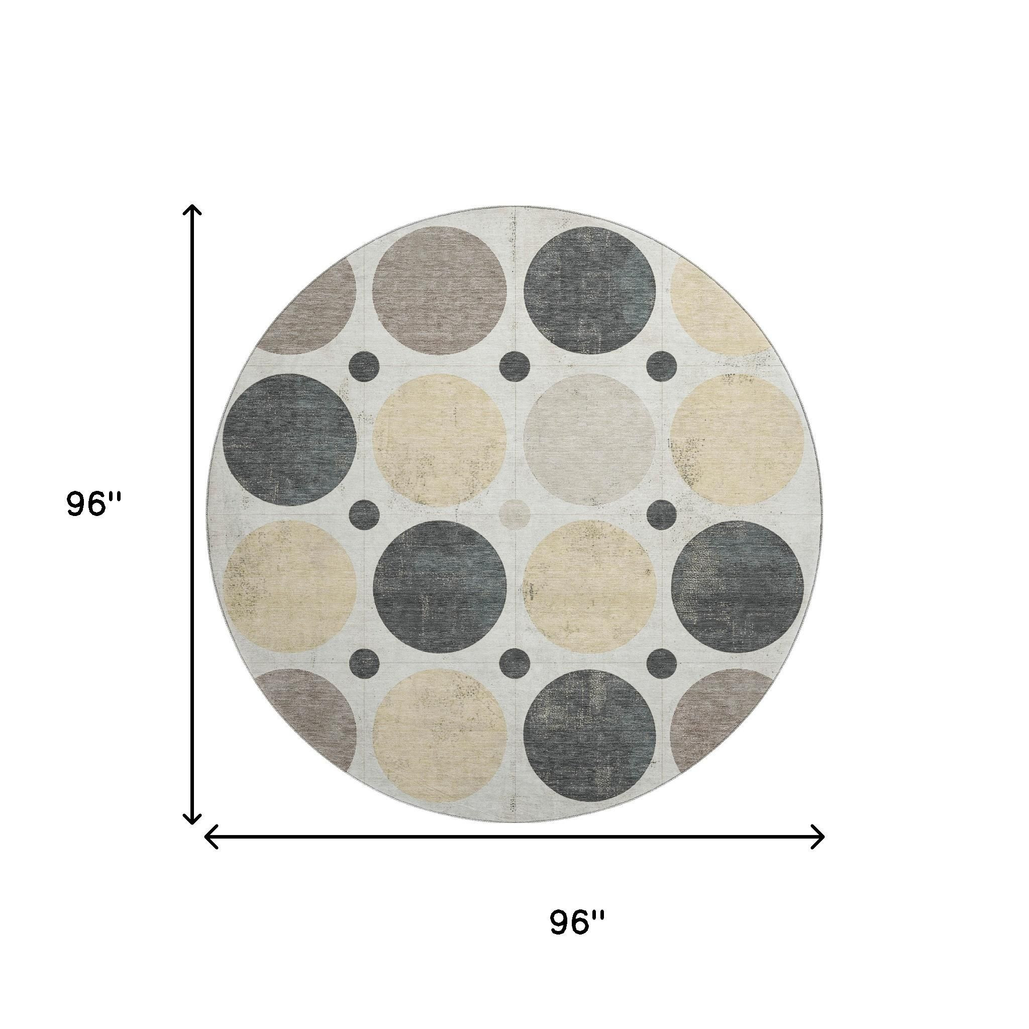 This 8-foot ivory charcoal and beige geometric washable round rug with uv protection, is a great way to add warmth to a room. Ideal for spaces with kids and pets, this rug is stain resistant to help repel dirt and spilled liquids. Built to last, this rug crafted from polyester fibers is known for its durability and long lasting appeal. Rugs are a great way to showcase your style, hide imperfections, warm your home and reduce noise. This larger sized, transitional styled rug is ready to create a focal point or statement piece in your room. 96.00-inch h x 96.00-inch w x 0.39-inch d.