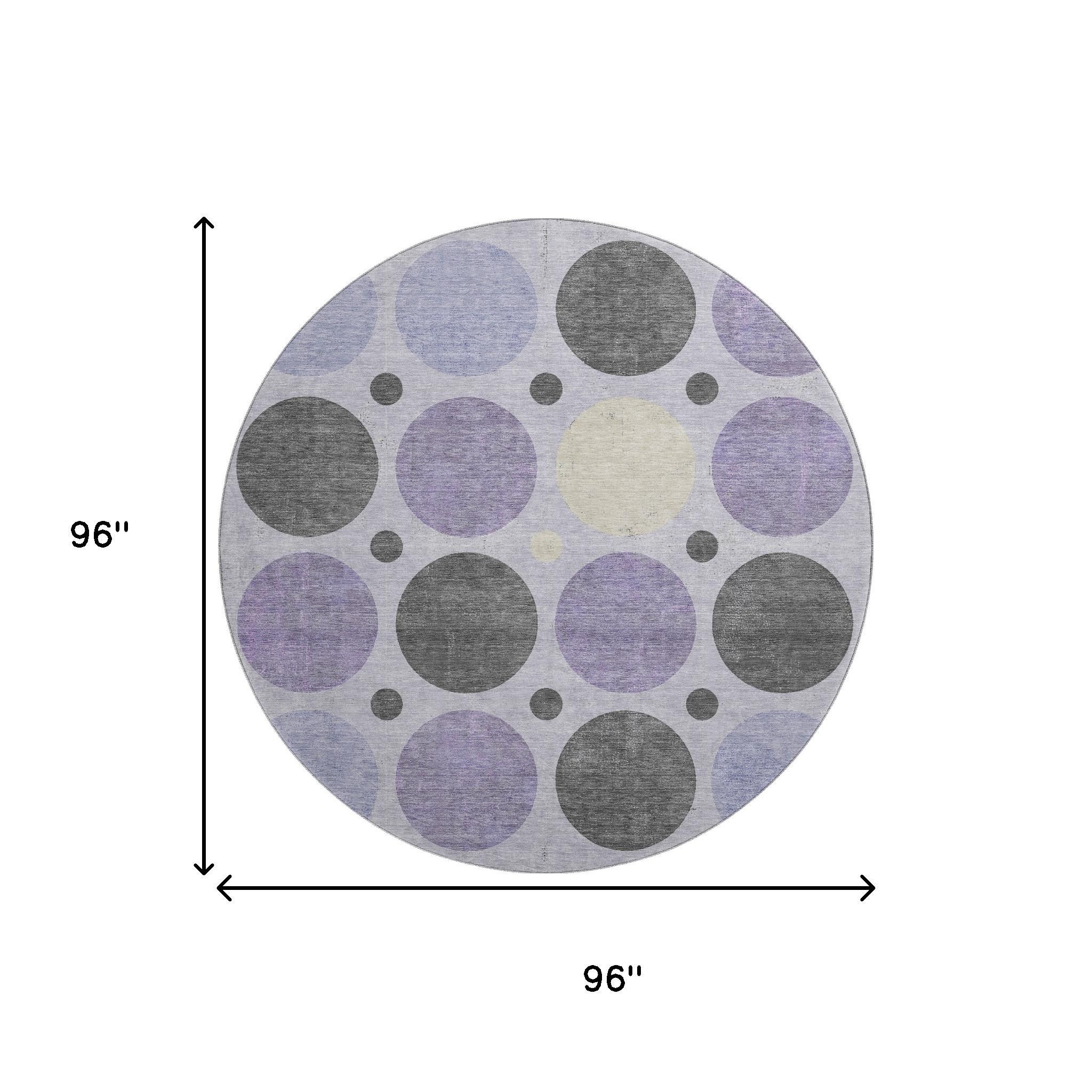 This 8-foot lavender charcoal and ivory geometric washable round rug with uv protection, is a great way to add warmth to a room. Ideal for spaces with kids and pets, this rug is stain resistant to help repel dirt and spilled liquids. Built to last, this rug crafted from polyester fibers is known for its durability and long lasting appeal. Rugs are a great way to showcase your style, hide imperfections, warm your home and reduce noise. This larger sized, transitional styled rug is ready to create a focal point or statement piece in your room. 96.00-inch h x 96.00-inch w x 0.39-inch d.