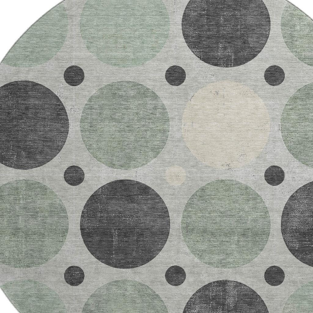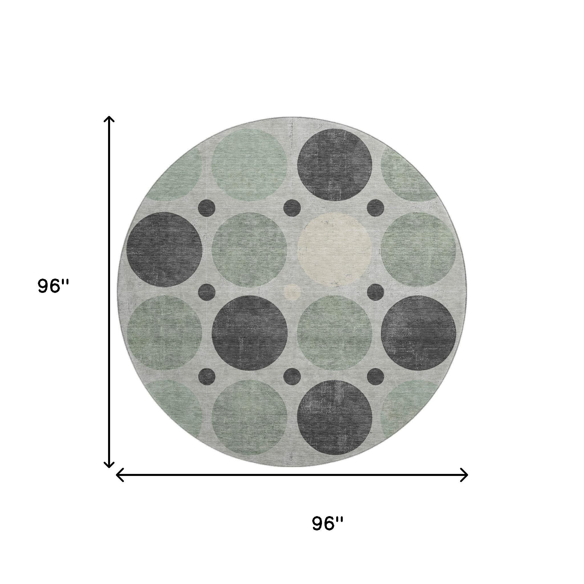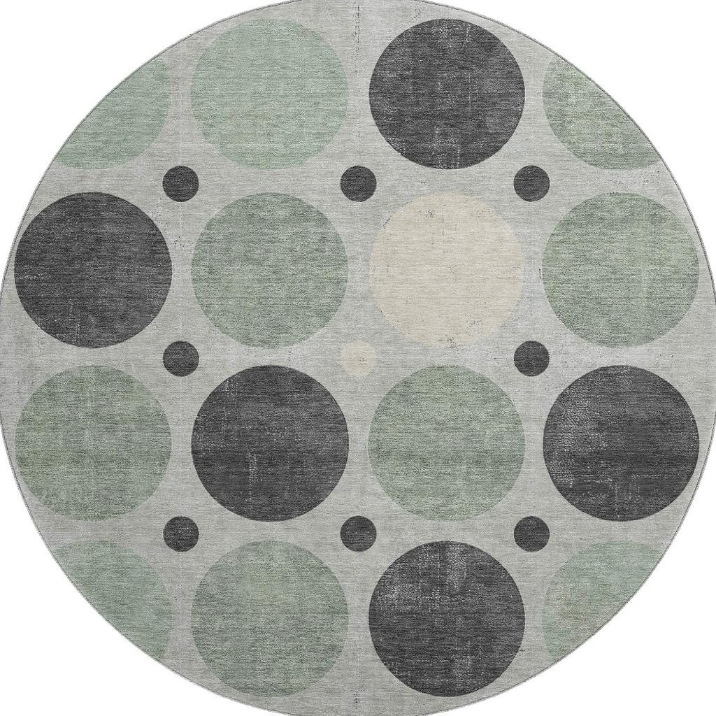 This 8-foot sage charcoal and ivory geometric washable round rug with uv protection, is a great way to add warmth to a room. Ideal for spaces with kids and pets, this rug is stain resistant to help repel dirt and spilled liquids. Built to last, this rug crafted from polyester fibers is known for its durability and long lasting appeal. Rugs are a great way to showcase your style, hide imperfections, warm your home and reduce noise. This larger sized, transitional styled rug is ready to create a focal point or statement piece in your room. 96.00-inch h x 96.00-inch w x 0.39-inch d.
