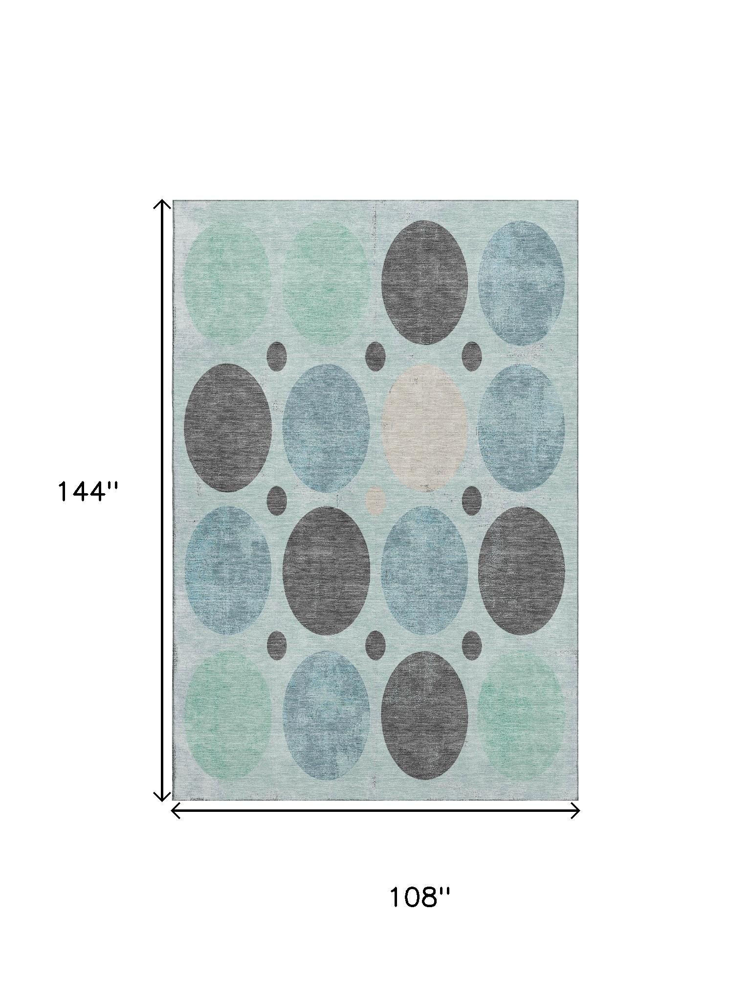 This 9-foot x 12-foot teal charcoal and beige geometric washable area rug with uv protection, is a great way to add warmth to a room. Ideal for spaces with kids and pets, this rug is stain resistant to help repel dirt and spilled liquids. Built to last, this rug crafted from polyester fibers is known for its durability and long lasting appeal. Rugs are a great way to showcase your style, hide imperfections, warm your home and reduce noise. This larger sized, transitional styled rug is ready to create a focal point or statement piece in your room. 108.00-inch h x 144.00-inch w x 0.39-inch d.