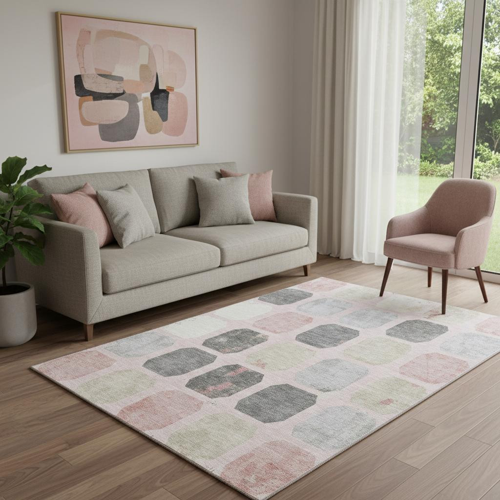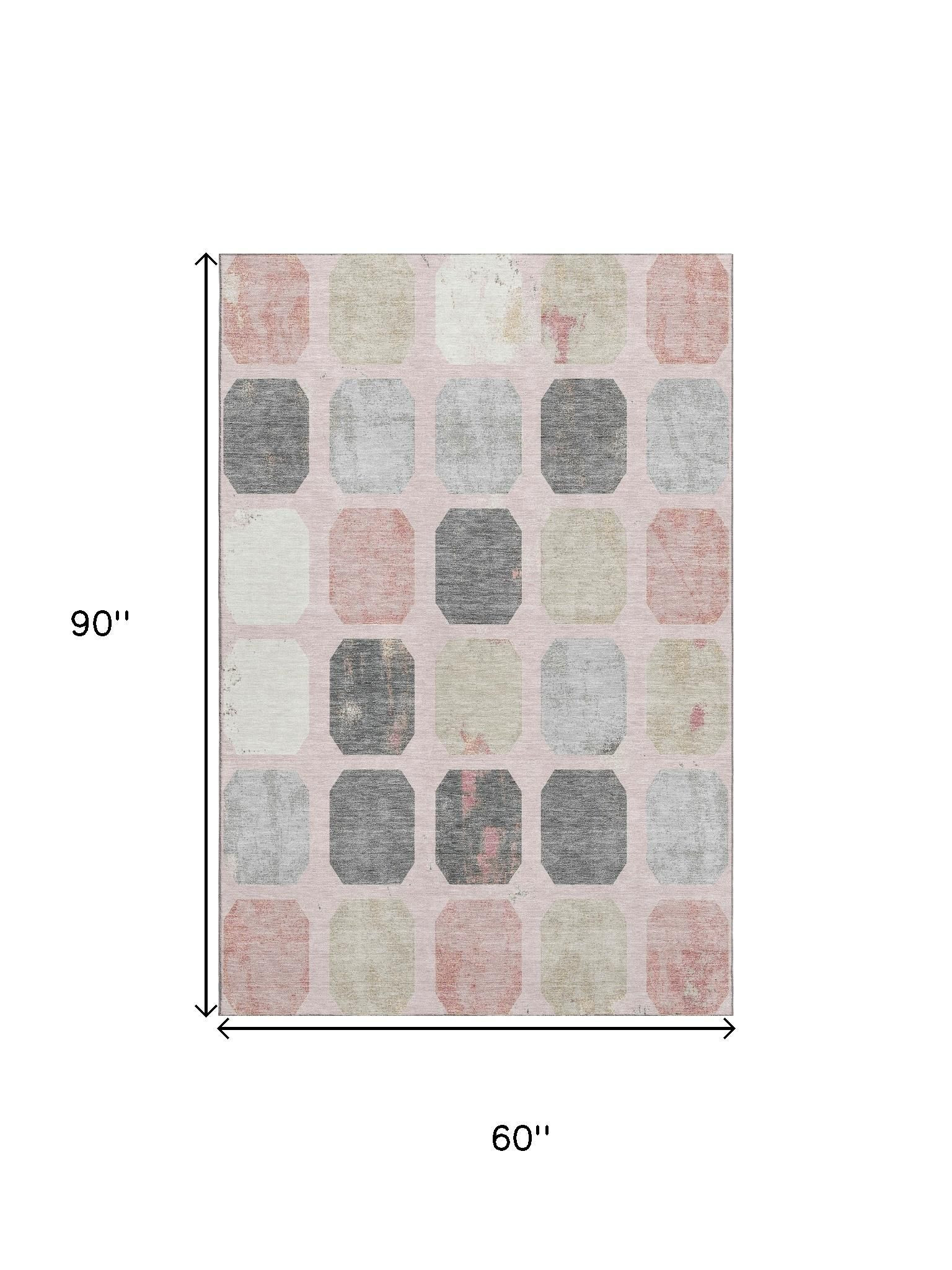 Set an inviting tone in your space with this 5-foot x 8-foot blush charcoal and ivory geometric washable area rug with uv protection. Ideal for spaces with kids and pets, this rug is stain resistant to help repel dirt and spilled liquids. Built to last, this rug crafted from polyester fibers is known for its durability and long lasting appeal. Rugs are a great way to showcase your style, hide imperfections, warm your home and reduce noise. This larger sized, transitional styled rug is ready to create a focal point or statement piece in your room. 60.00-inch h x 90.00-inch w x 0.39-inch d.