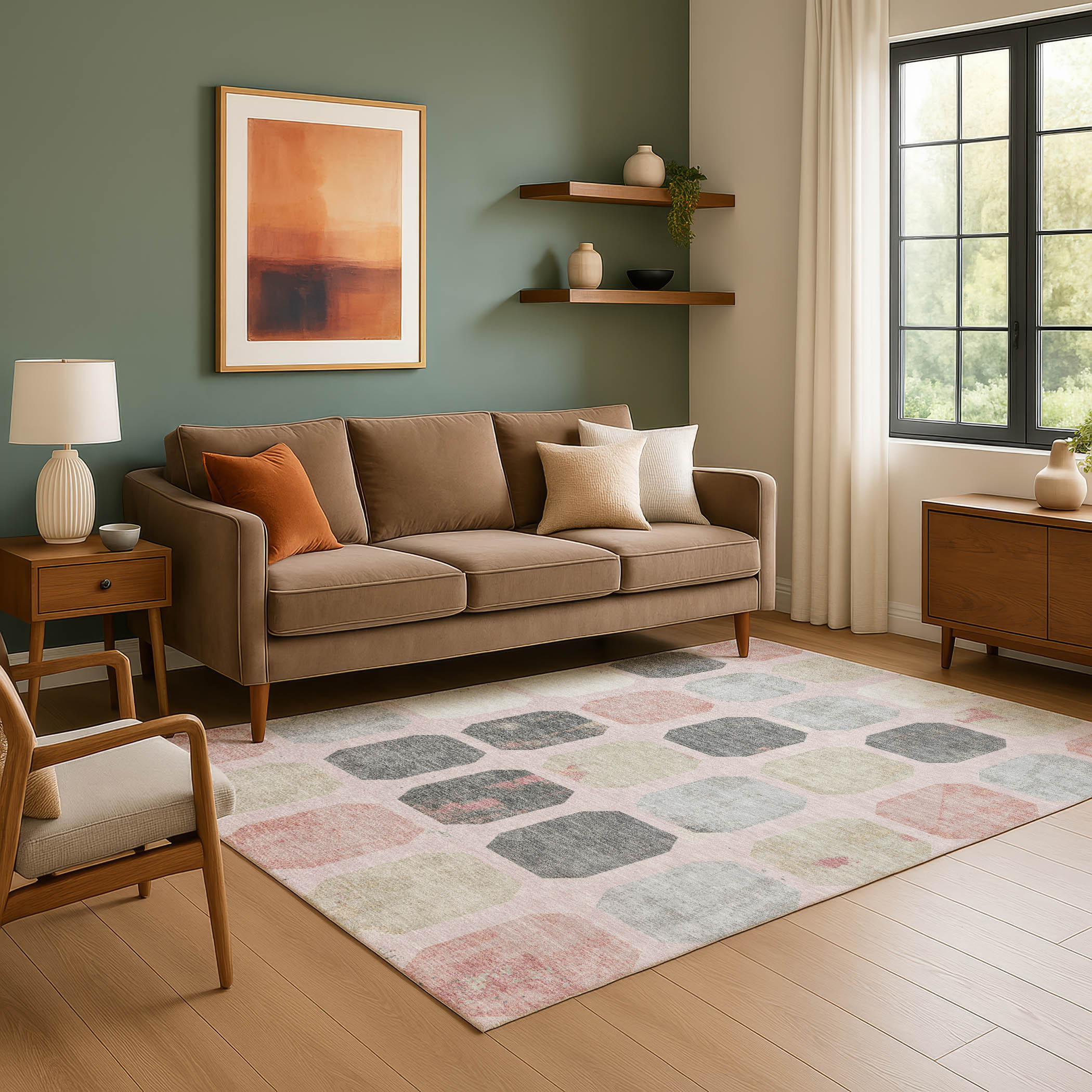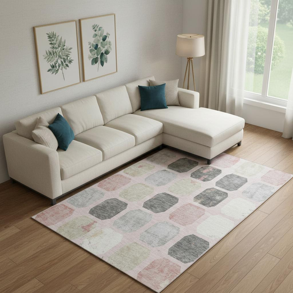 Add some artistry to your room with this 9-foot x 12-foot blush charcoal and ivory geometric washable area rug with uv protection. Ideal for spaces with kids and pets, this rug is stain resistant to help repel dirt and spilled liquids. Built to last, this rug crafted from polyester fibers is known for its durability and long lasting appeal. Rugs are a great way to showcase your style, hide imperfections, warm your home and reduce noise. This larger sized, transitional styled rug is ready to create a focal point or statement piece in your room. 108.00-inch h x 144.00-inch w x 0.39-inch d.