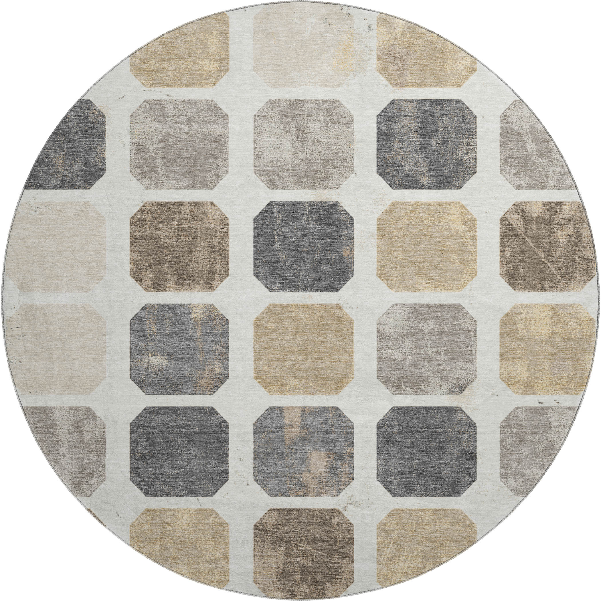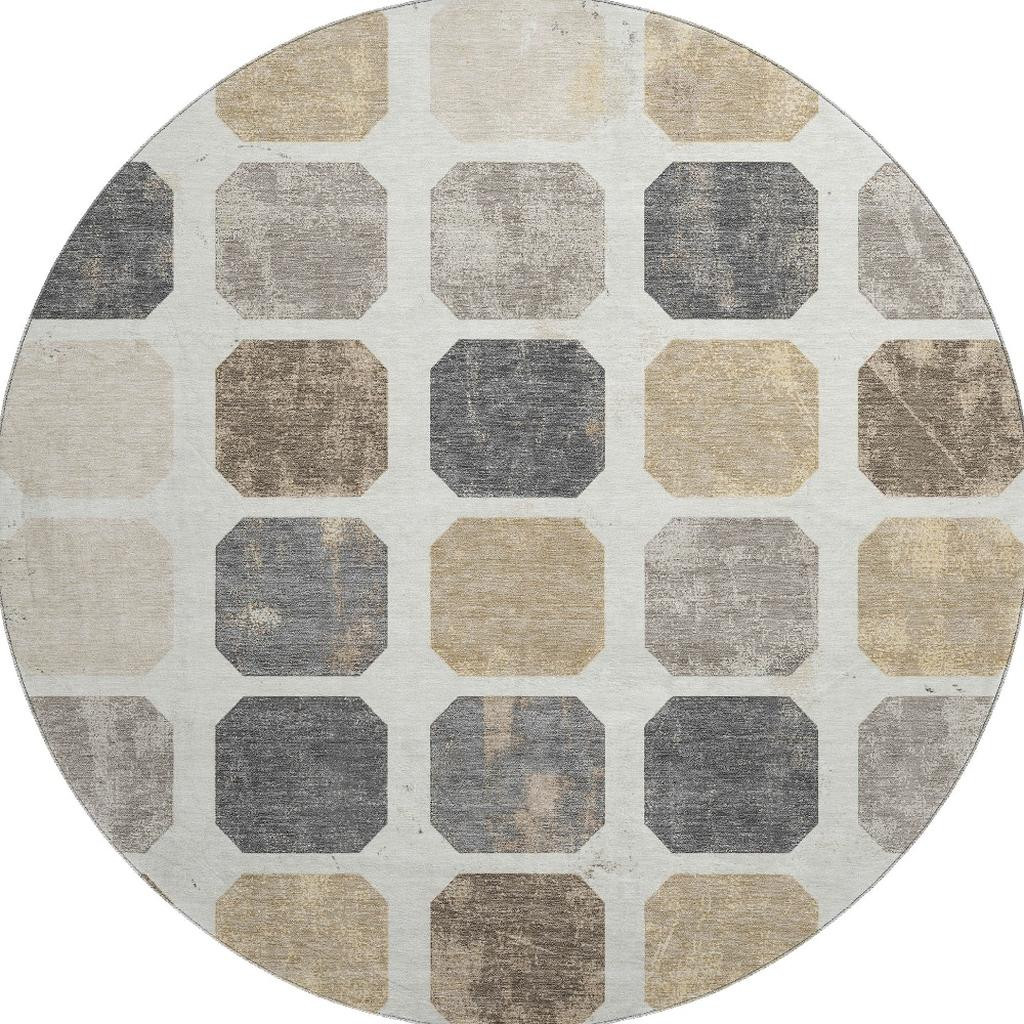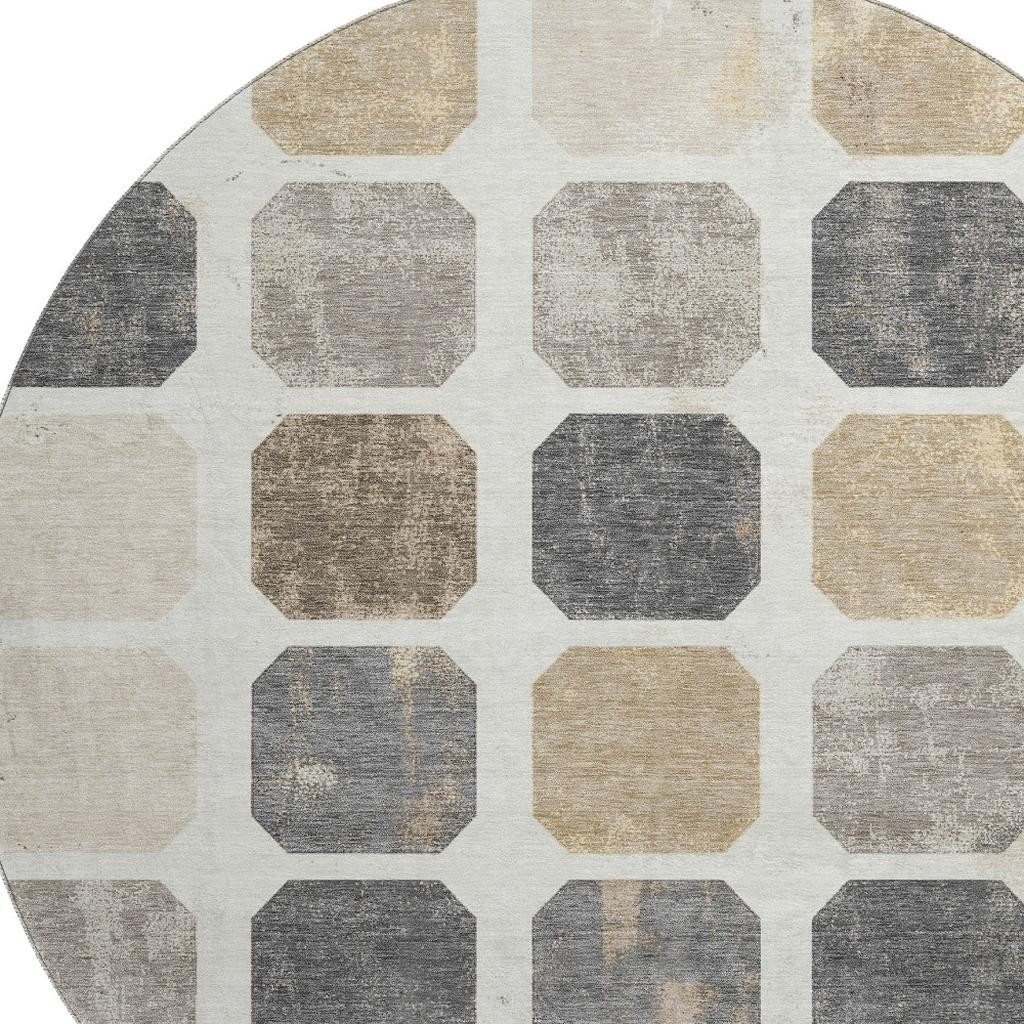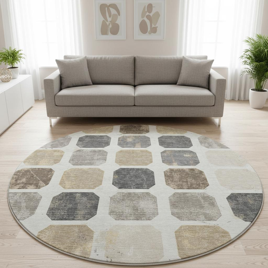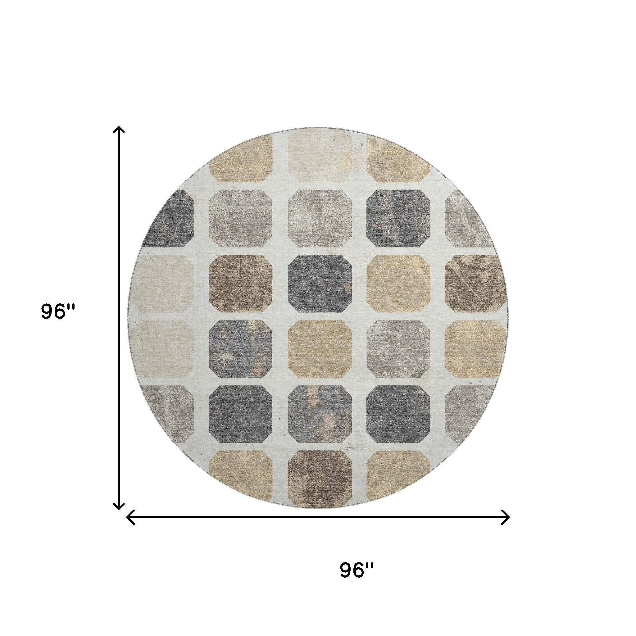 This 8-foot ivory beige and gray geometric washable round rug with uv protection, is a great way to add warmth to a room. Ideal for spaces with kids and pets, this rug is stain resistant to help repel dirt and spilled liquids. Built to last, this rug crafted from polyester fibers is known for its durability and long lasting appeal. Rugs are a great way to showcase your style, hide imperfections, warm your home and reduce noise. This larger sized, transitional styled rug is ready to create a focal point or statement piece in your room. 96.00-inch h x 96.00-inch w x 0.39-inch d.
