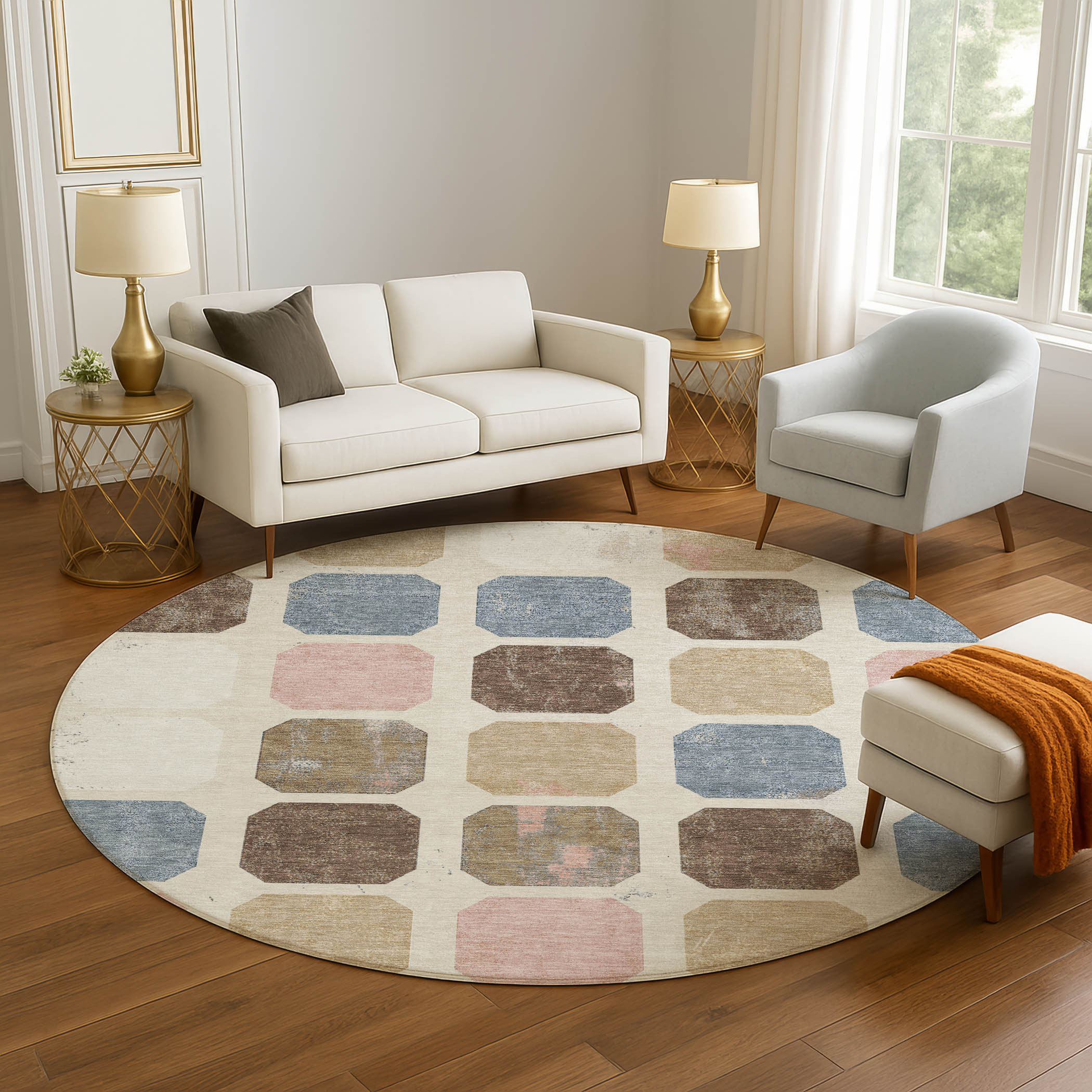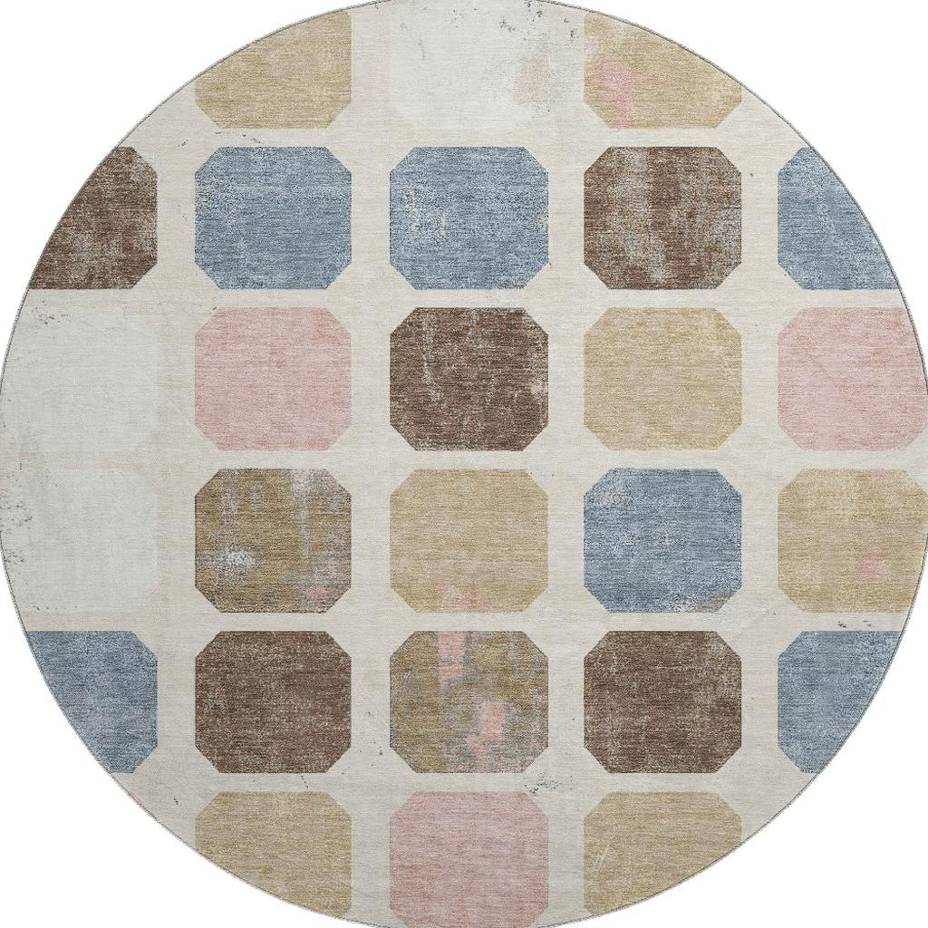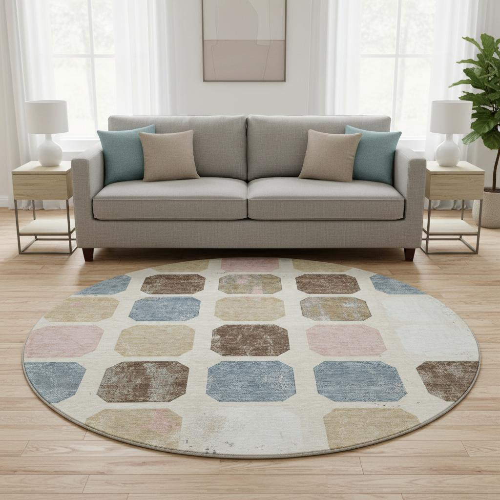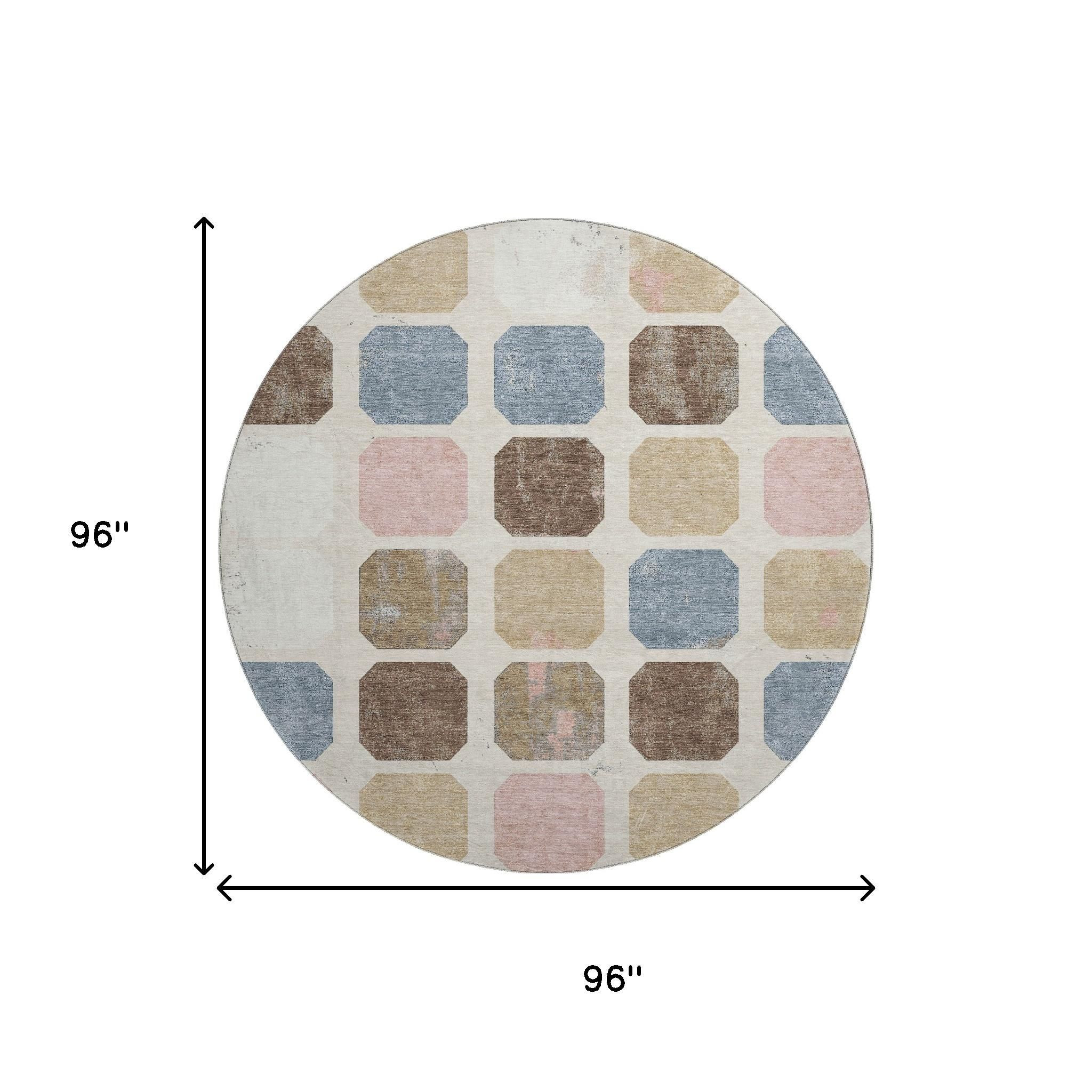 This 8-foot linen ivory and brown geometric washable round rug with uv protection, is a great way to add warmth to a room. Ideal for spaces with kids and pets, this rug is stain resistant to help repel dirt and spilled liquids. Built to last, this rug crafted from polyester fibers is known for its durability and long lasting appeal. Rugs are a great way to showcase your style, hide imperfections, warm your home and reduce noise. This larger sized, transitional styled rug is ready to create a focal point or statement piece in your room. 96.00-inch h x 96.00-inch w x 0.39-inch d.