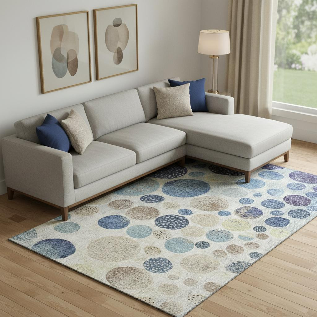 Add some artistry to your room with this 9-foot x 12-foot navy blue ivory and taupe geometric washable area rug with uv protection. Ideal for spaces with kids and pets, this rug is stain resistant to help repel dirt and spilled liquids. Built to last, this rug crafted from polyester fibers is known for its durability and long lasting appeal. Rugs are a great way to showcase your style, hide imperfections, warm your home and reduce noise. This larger sized, transitional styled rug is ready to create a focal point or statement piece in your room. 108.00-inch h x 144.00-inch w x 0.39-inch d.