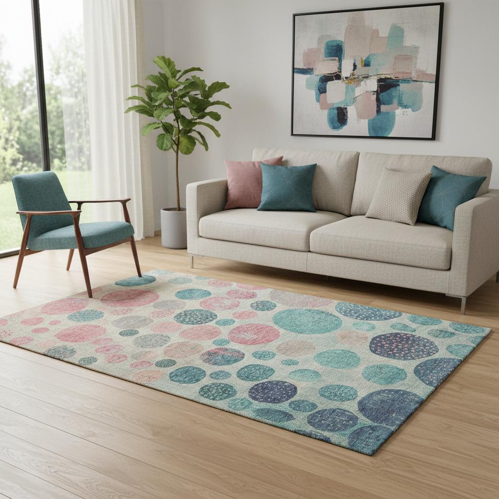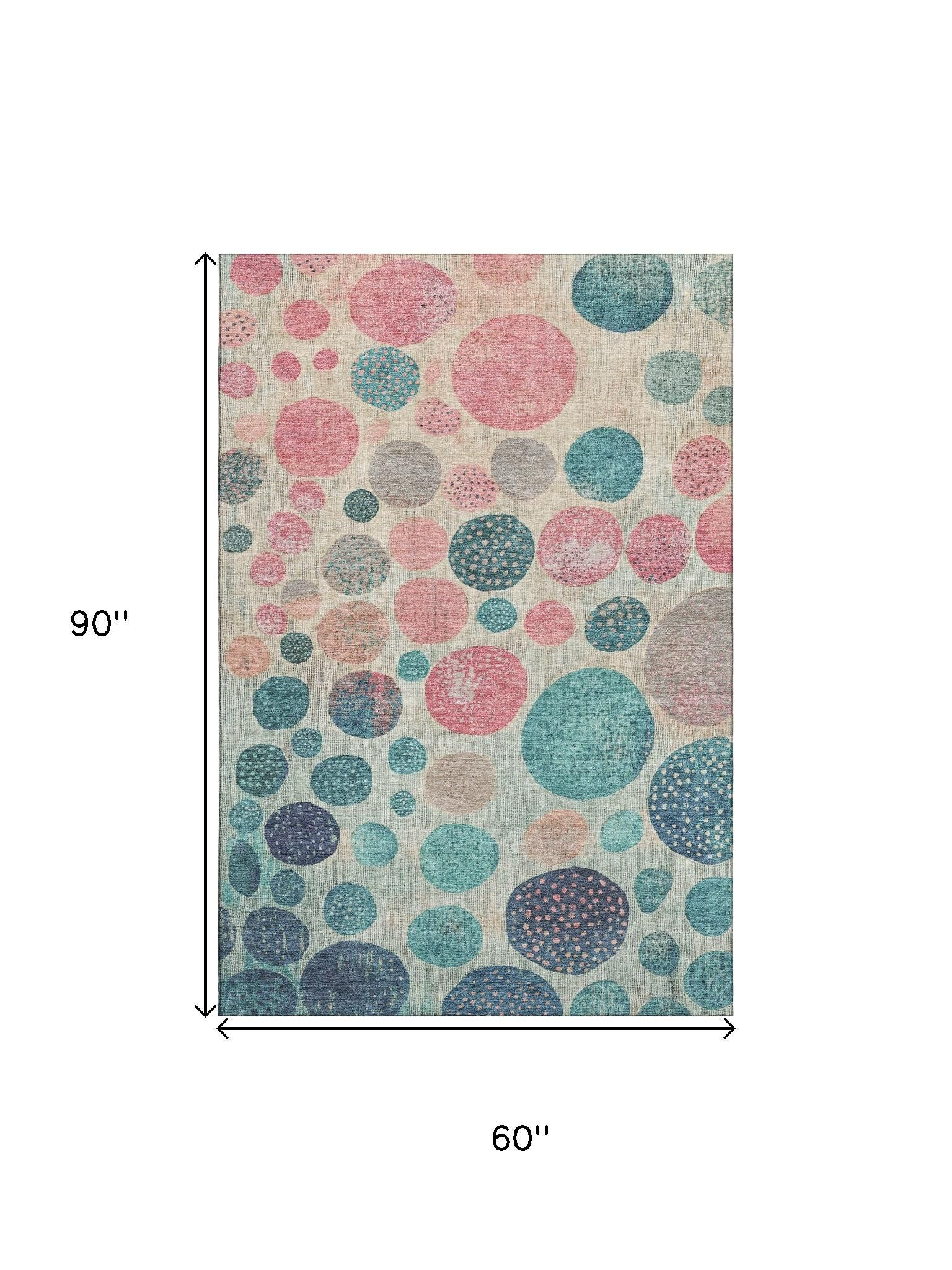 Add some artistry to your room with this 5-foot x 8-foot teal pink and beige geometric washable area rug with uv protection. Ideal for spaces with kids and pets, this rug is stain resistant to help repel dirt and spilled liquids. Built to last, this rug crafted from polyester fibers is known for its durability and long lasting appeal. Rugs are a great way to showcase your style, hide imperfections, warm your home and reduce noise. This larger sized, transitional styled rug is ready to create a focal point or statement piece in your room. 60.00-inch h x 90.00-inch w x 0.39-inch d.