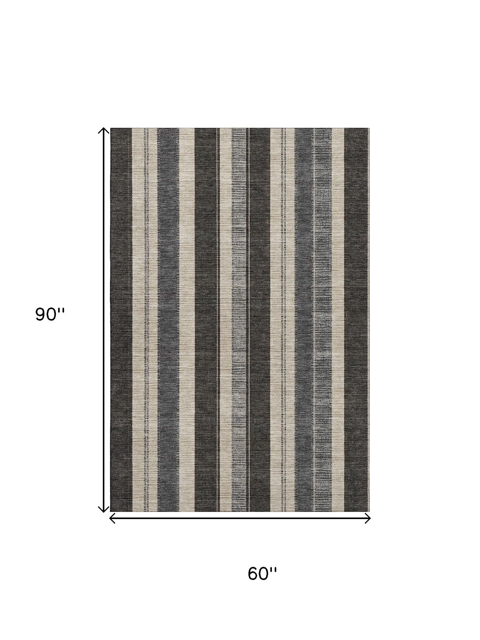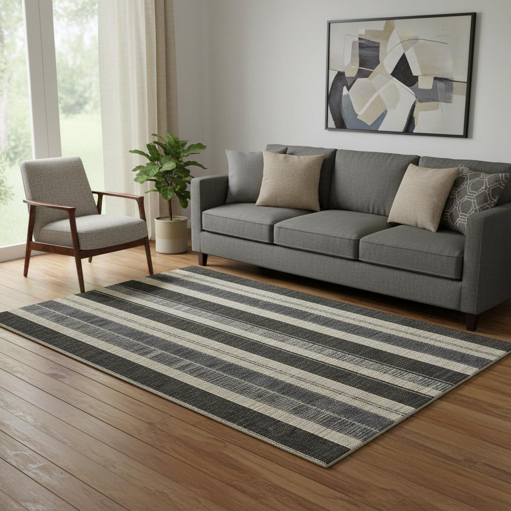 Set an inviting tone in your space with this 5-foot x 8-foot black ivory and gray striped washable area rug with uv protection. Ideal for spaces with kids and pets, this rug is stain resistant to help repel dirt and spilled liquids. Built to last, this rug crafted from polyester fibers is known for its durability and long lasting appeal. Rugs are a great way to showcase your style, hide imperfections, warm your home and reduce noise. This larger sized, transitional styled rug is ready to create a focal point or statement piece in your room. 60.00-inch h x 90.00-inch w x 0.39-inch d.