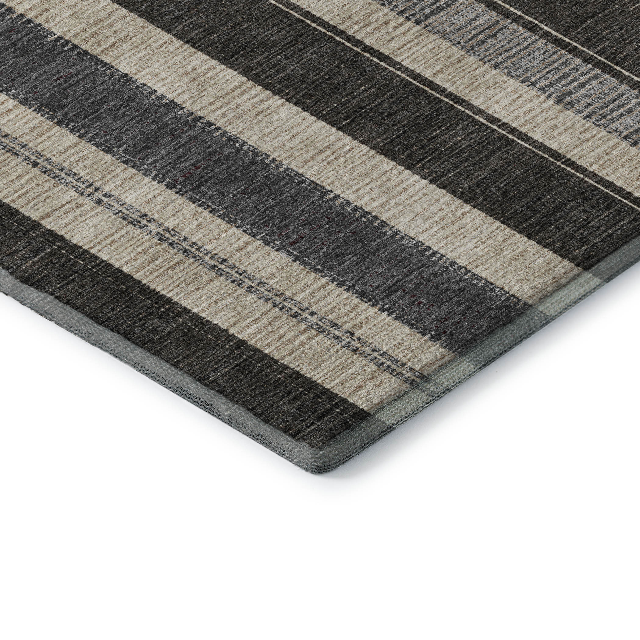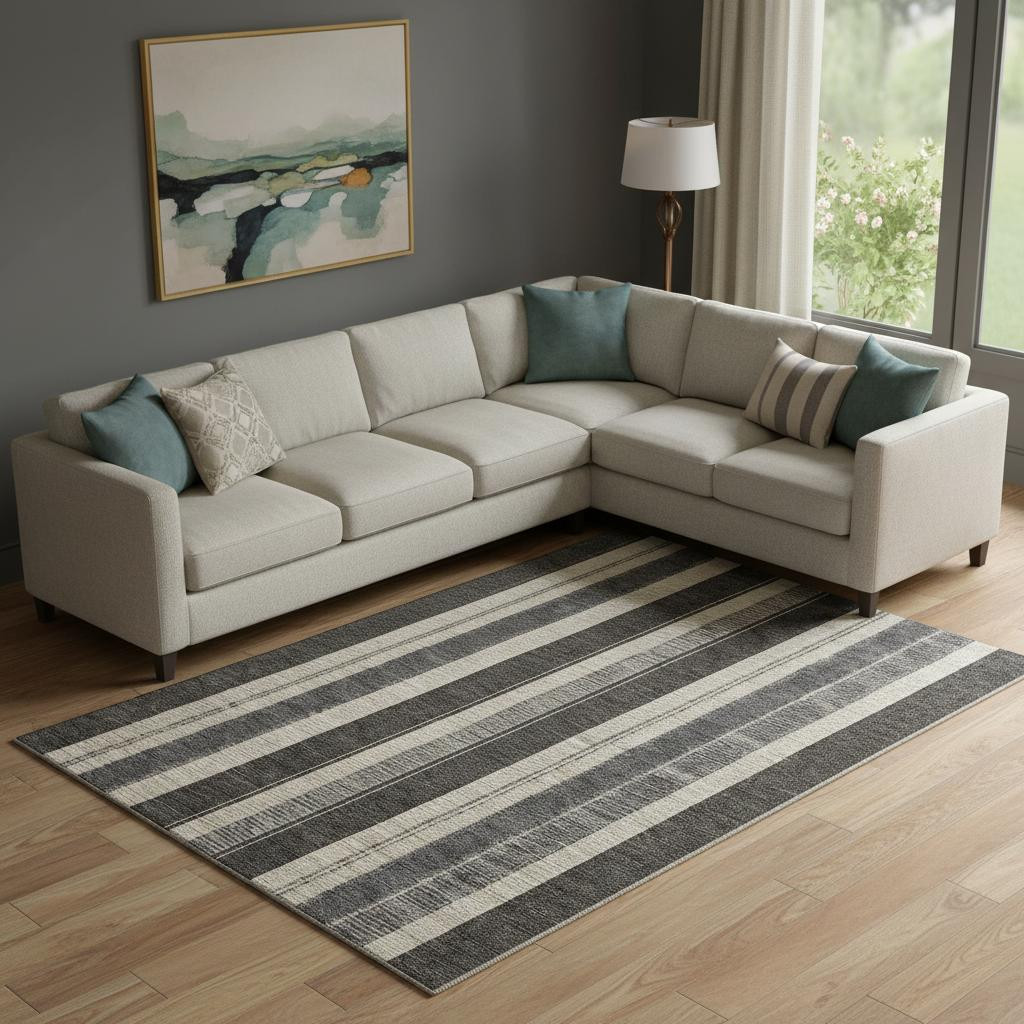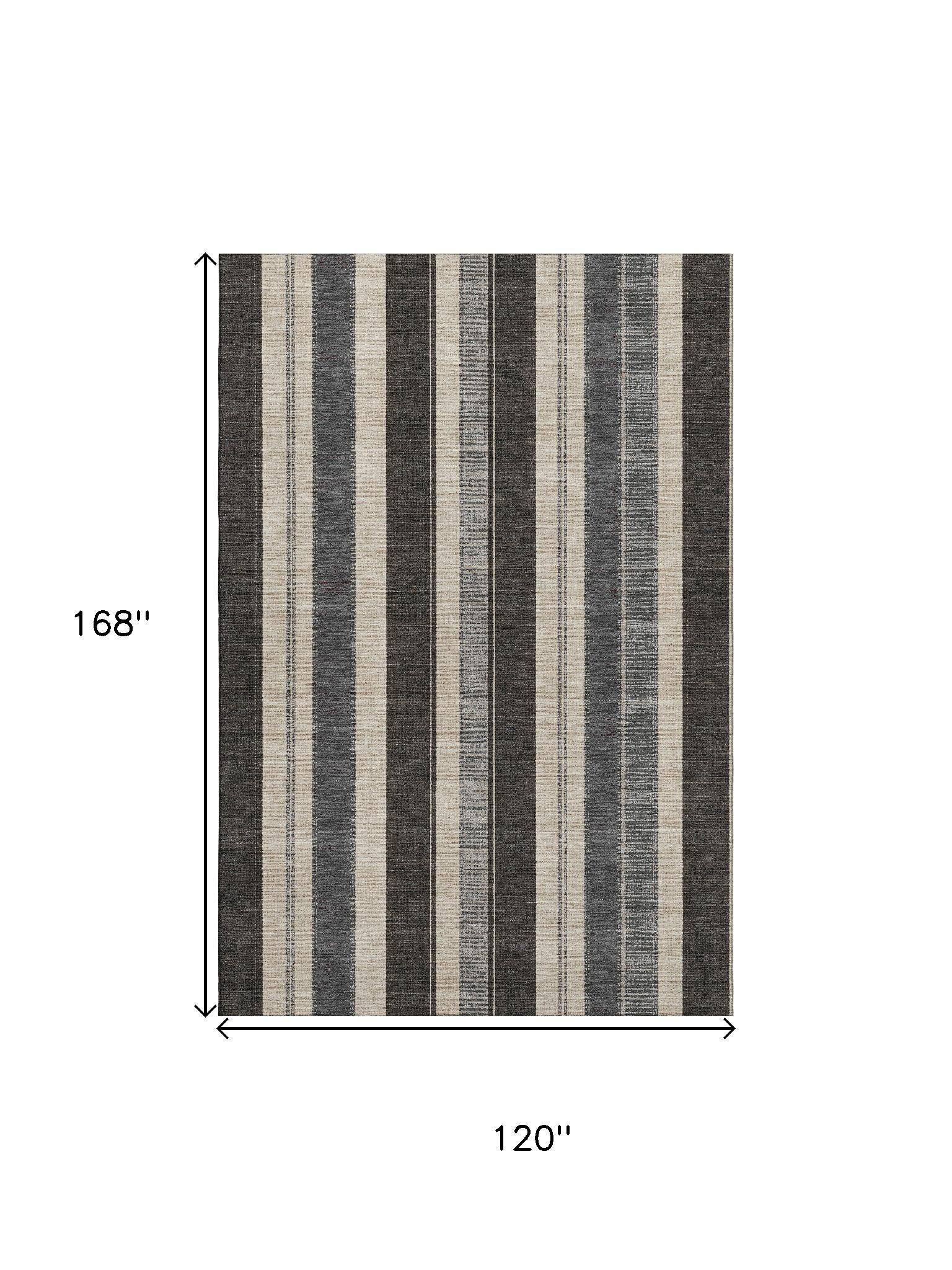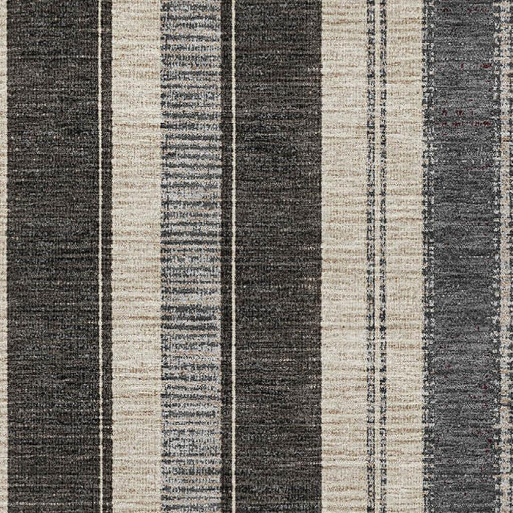 Add some artistry to your room with this 10-foot x 14-foot black ivory and gray striped washable area rug with uv protection. Ideal for spaces with kids and pets, this rug is stain resistant to help repel dirt and spilled liquids. Built to last, this rug crafted from polyester fibers is known for its durability and long lasting appeal. Rugs are a great way to showcase your style, hide imperfections, warm your home and reduce noise. This larger sized, transitional styled rug is ready to create a focal point or statement piece in your room. 120.00-inch h x 168.00-inch w x 0.39-inch d.