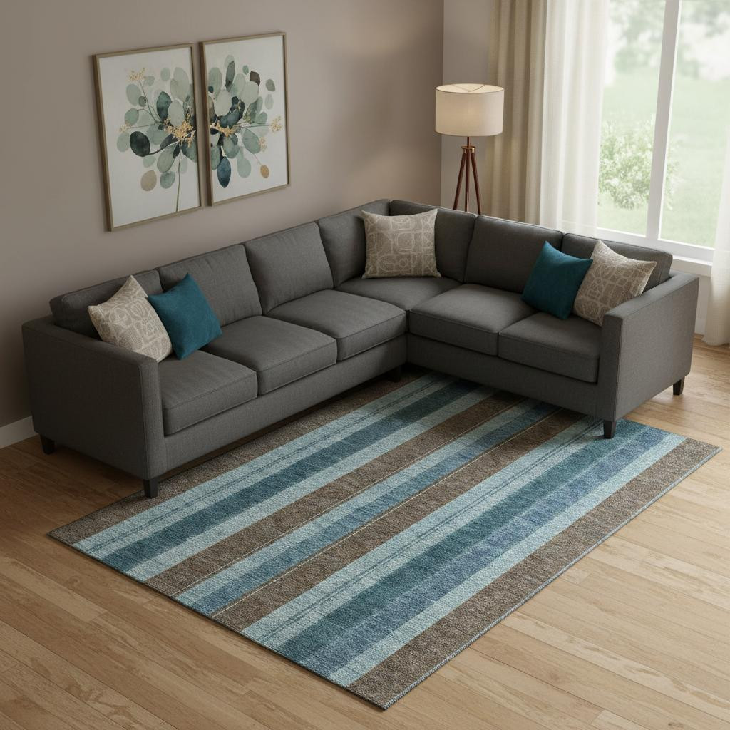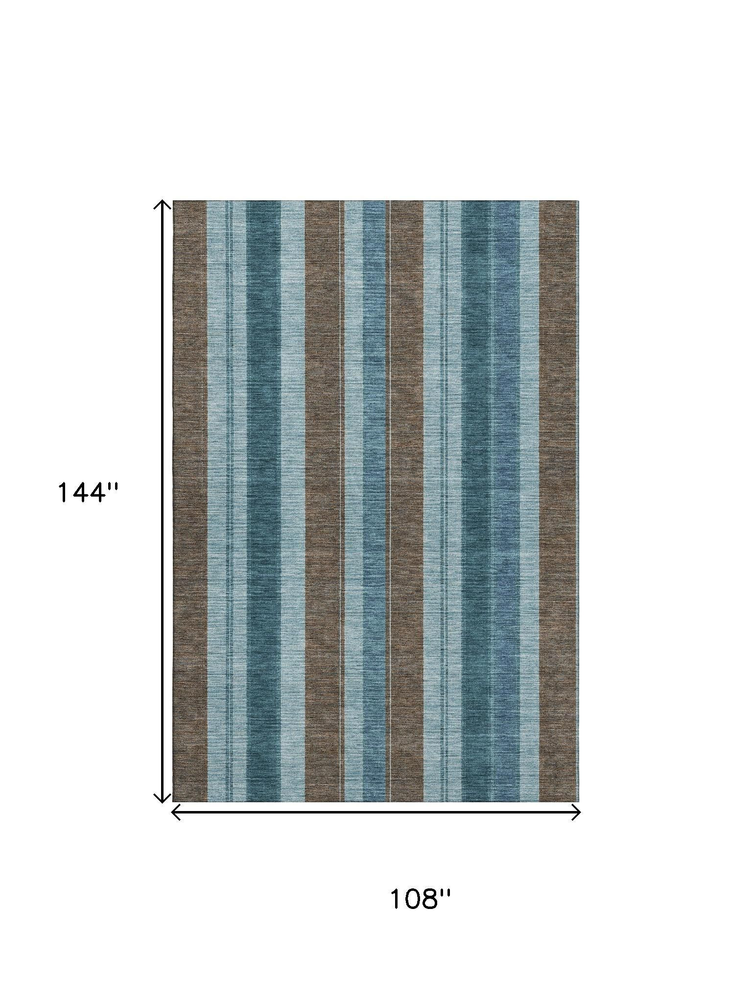 Add great coloration and comfortable texture to your space with this 9-foot x 12-foot teal and brown striped washable area rug with uv protection. Ideal for spaces with kids and pets, this rug is stain resistant to help repel dirt and spilled liquids. Built to last, this rug crafted from polyester fibers is known for its durability and long lasting appeal. Rugs are a great way to showcase your style, hide imperfections, warm your home and reduce noise. This larger sized, transitional styled rug is ready to create a focal point or statement piece in your room. 108.00-inch h x 144.00-inch w x 0.39-inch d.