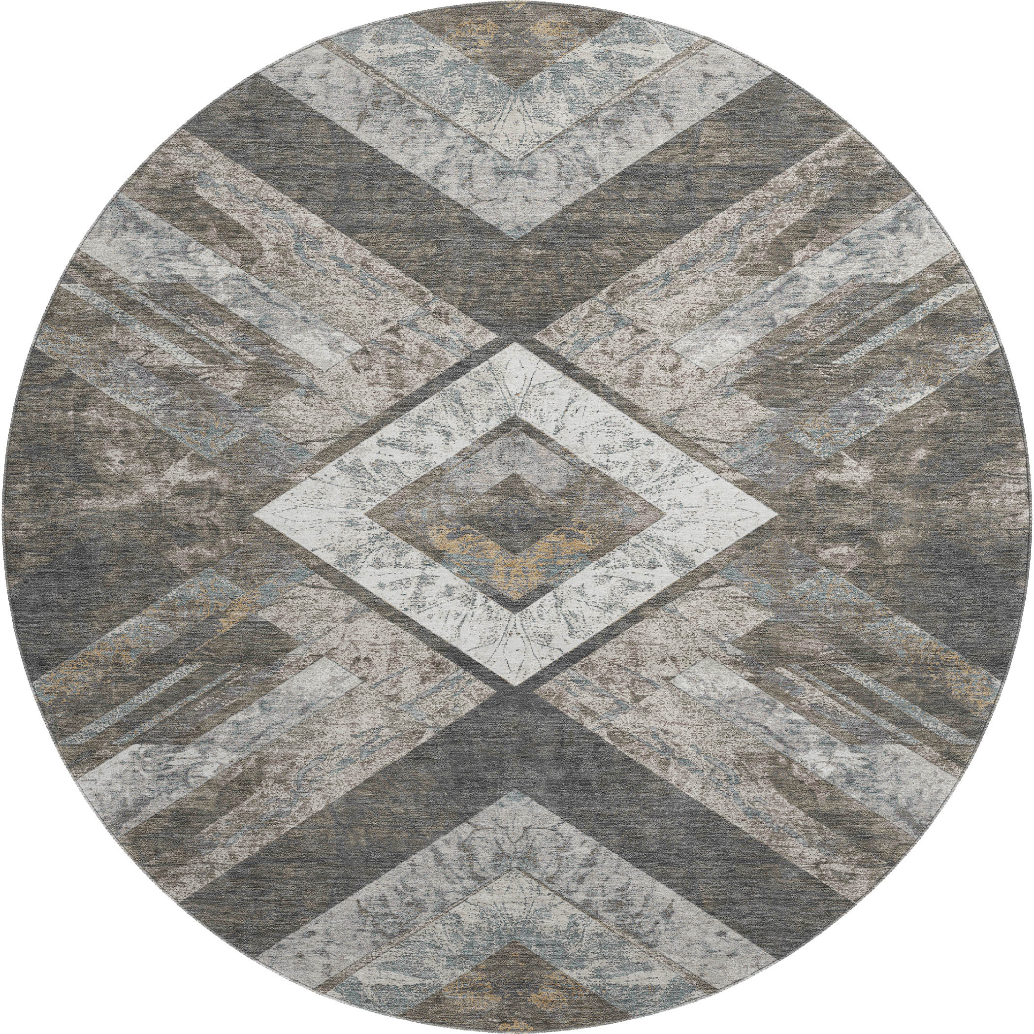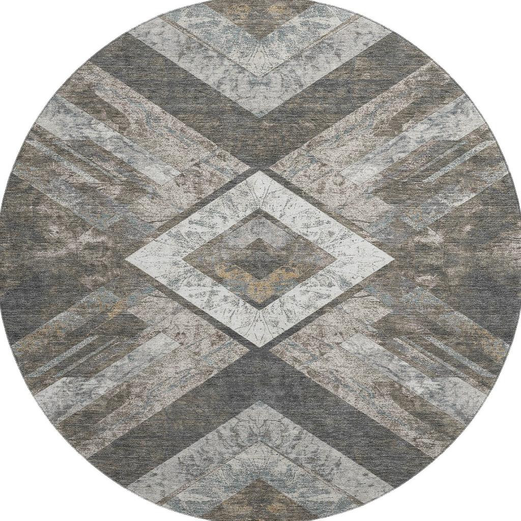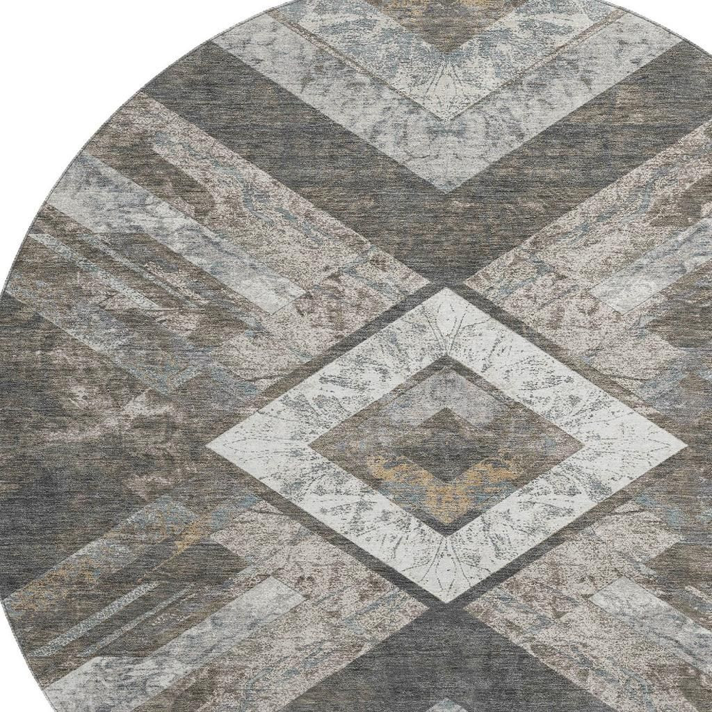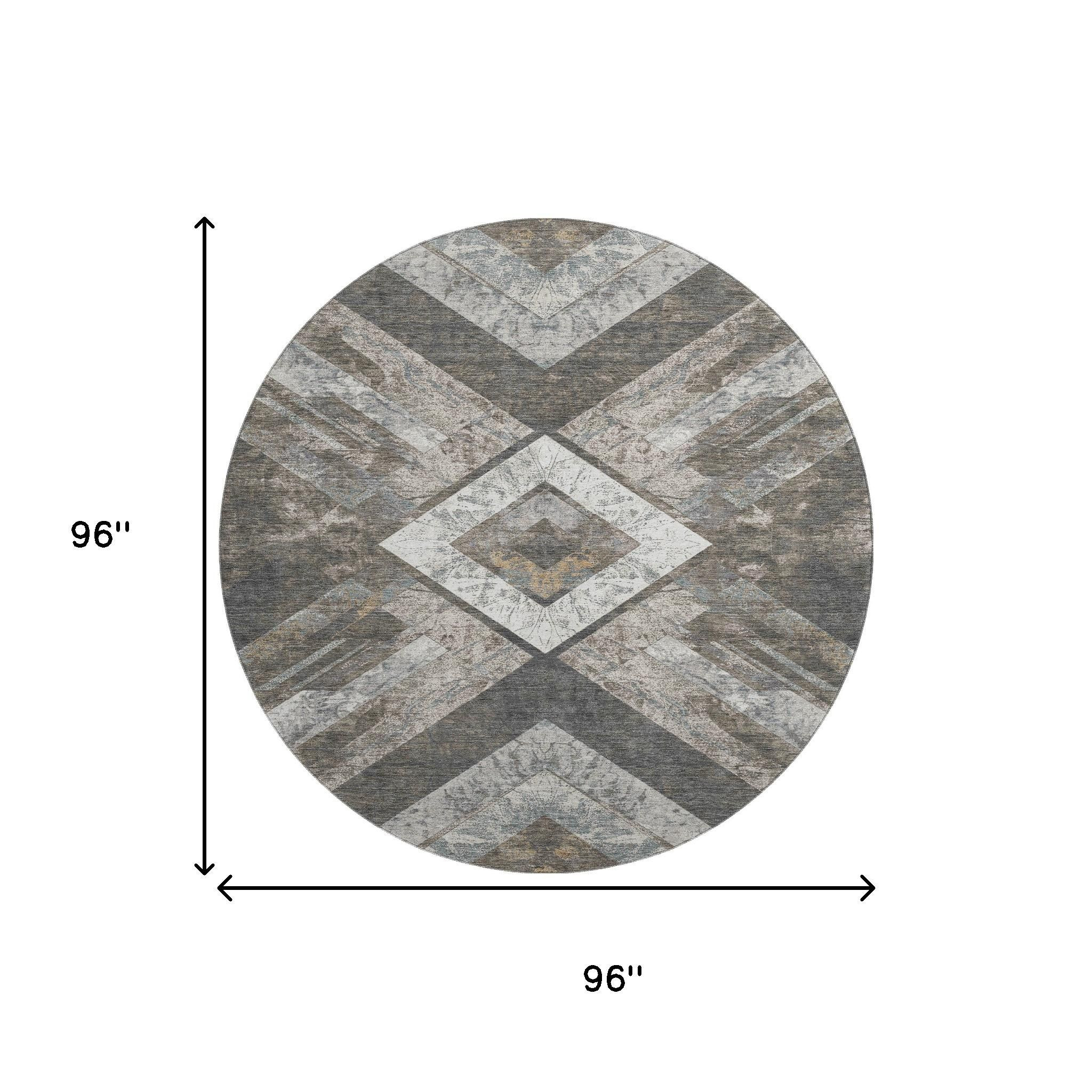 Add some artistry to your room with this 8-foot brown gray and ivory geometric washable round rug with uv protection. Ideal for spaces with kids and pets, this rug is stain resistant to help repel dirt and spilled liquids. Built to last, this rug crafted from polyester fibers is known for its durability and long lasting appeal. Rugs are a great way to showcase your style, hide imperfections, warm your home and reduce noise. This larger sized, transitional styled rug is ready to create a focal point or statement piece in your room. 96.00-inch h x 96.00-inch w x 0.39-inch d.