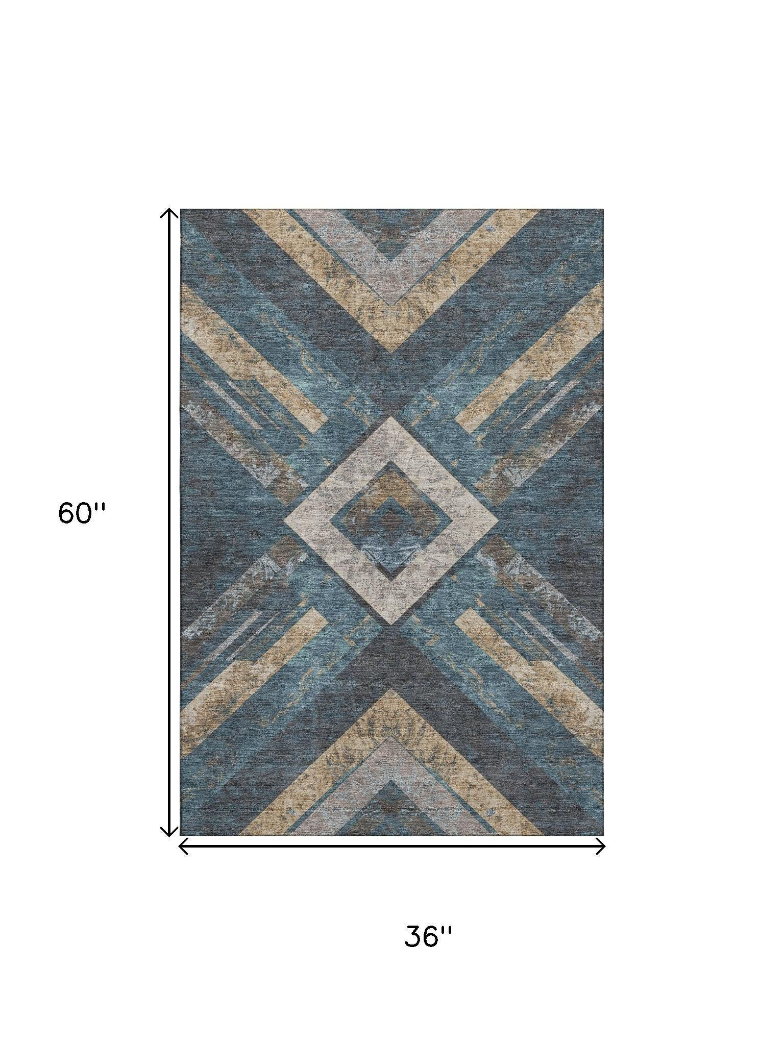 This 3-foot x 5-foot navy blue brown and beige geometric washable area rug with uv protection, is a great way to add warmth to a room. Ideal for spaces with kids and pets, this rug is stain resistant to help repel dirt and spilled liquids. Built to last, this rug crafted from polyester fibers is known for its durability and long lasting appeal. Rugs are a great way to showcase your style, hide imperfections, warm your home and reduce noise. This smaller sized, transitional styled rug is just what you need for your walkway, bedside, in front of door, cabinet, refrigerator, or chair. 36.00-inch h x 60.00-inch w x 0.39-inch d.