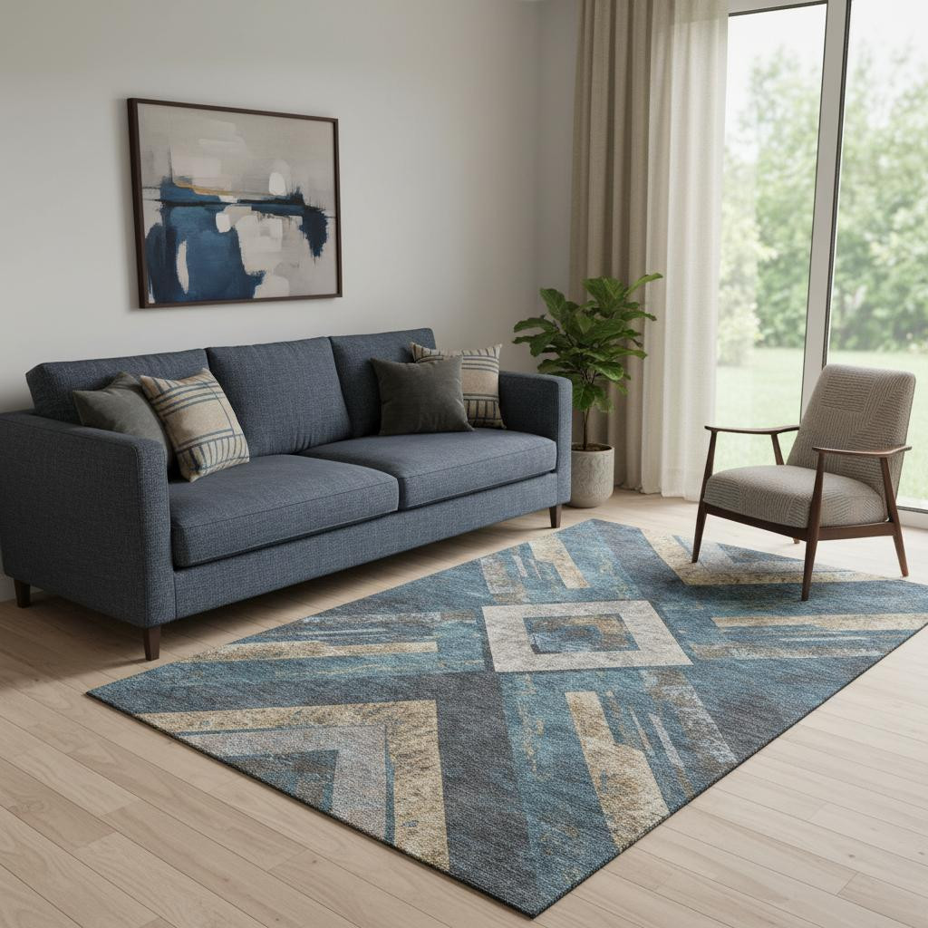 This 5-foot x 8-foot navy blue brown and beige geometric washable area rug with uv protection, is a great way to add warmth to a room. Ideal for spaces with kids and pets, this rug is stain resistant to help repel dirt and spilled liquids. Built to last, this rug crafted from polyester fibers is known for its durability and long lasting appeal. Rugs are a great way to showcase your style, hide imperfections, warm your home and reduce noise. This larger sized, transitional styled rug is ready to create a focal point or statement piece in your room. 60.00-inch h x 90.00-inch w x 0.39-inch d.