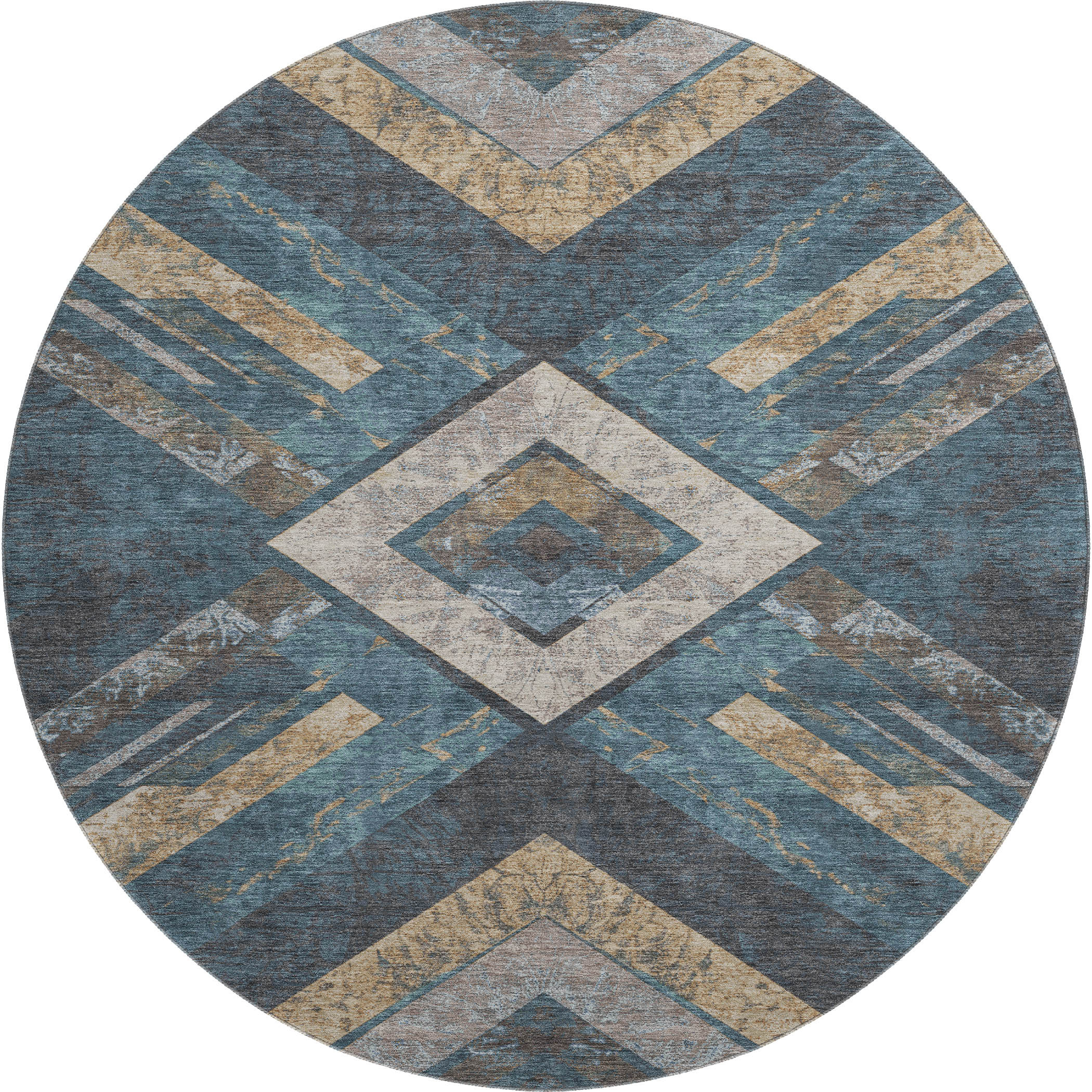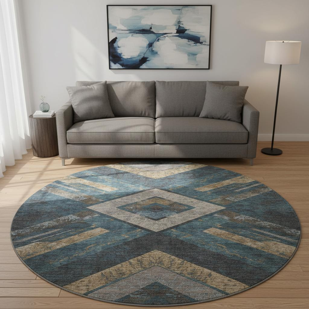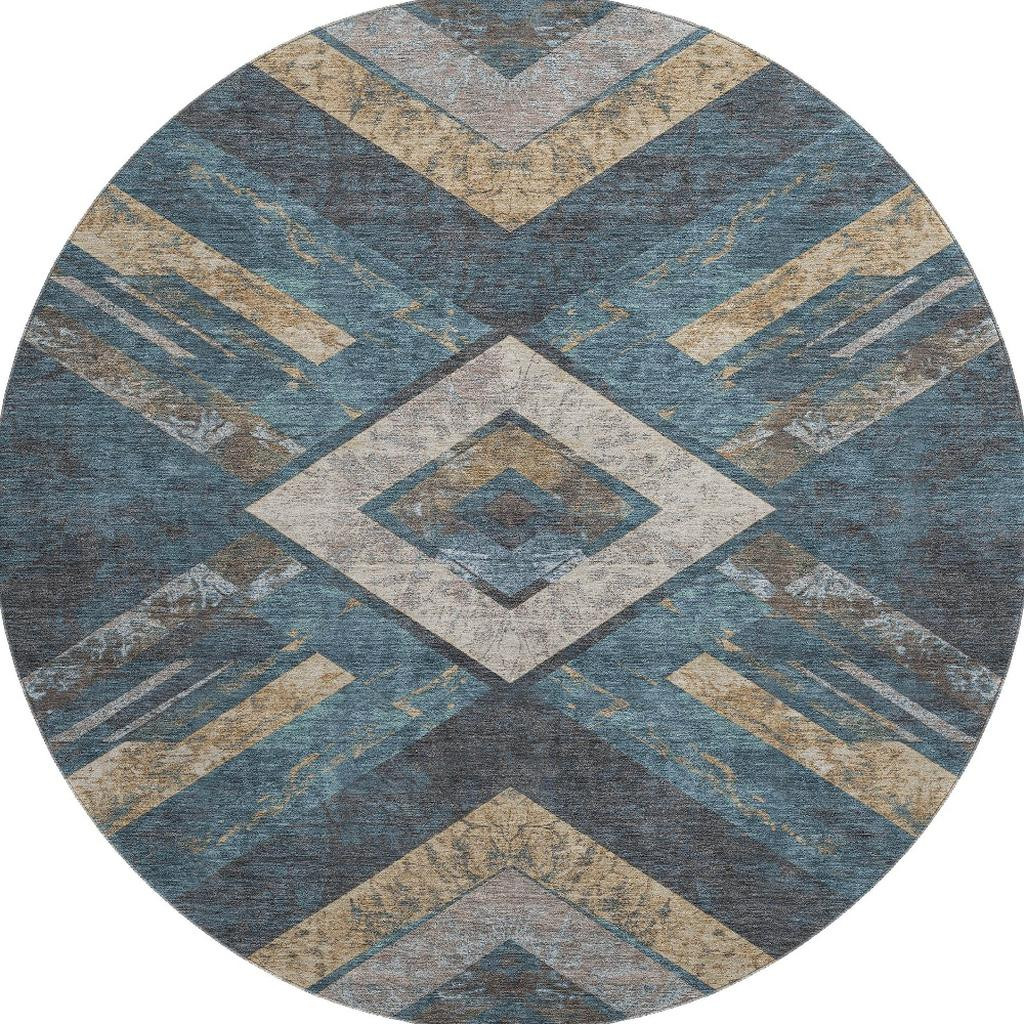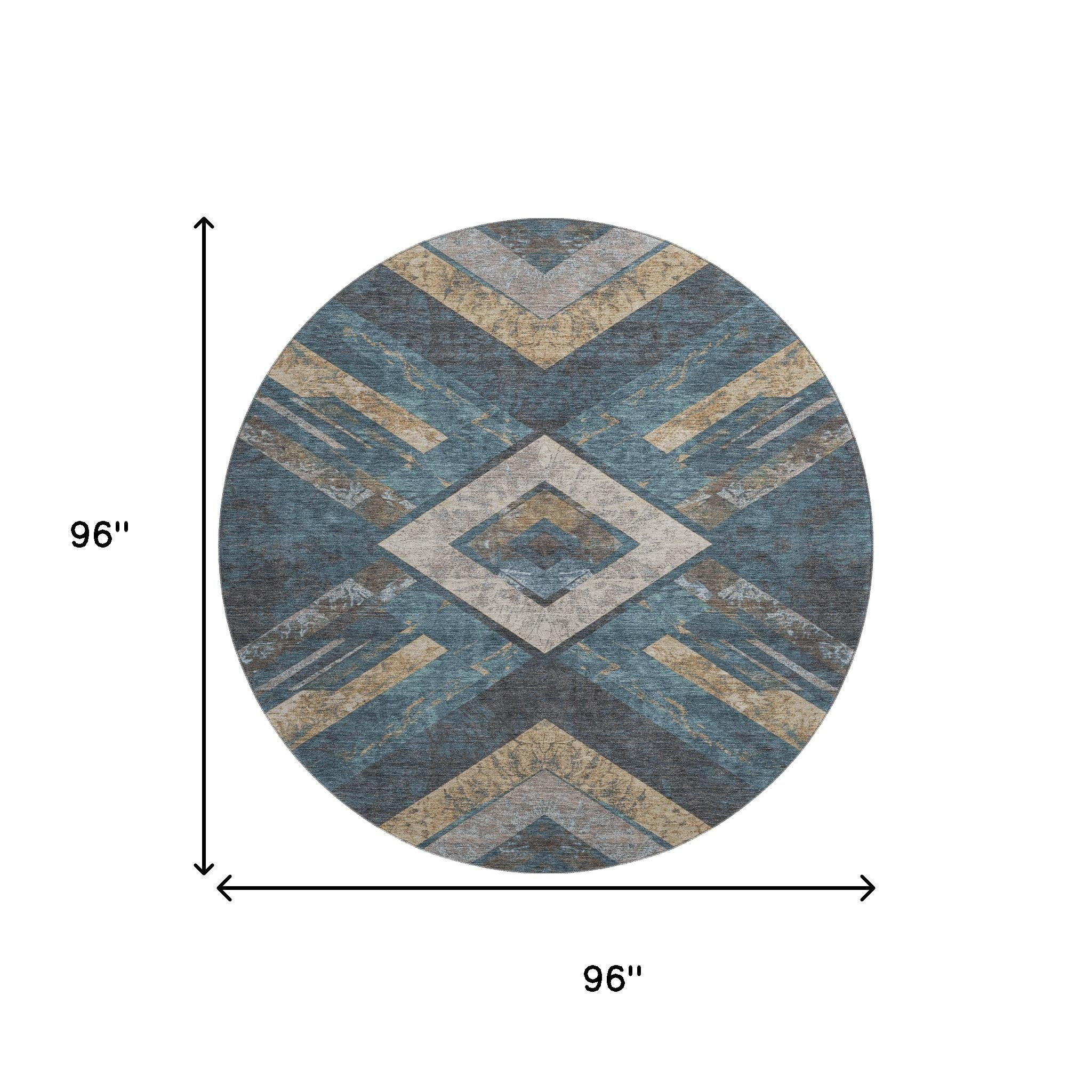 This 8-foot navy blue brown and beige geometric washable round rug with uv protection, is a great way to add warmth to a room. Ideal for spaces with kids and pets, this rug is stain resistant to help repel dirt and spilled liquids. Built to last, this rug crafted from polyester fibers is known for its durability and long lasting appeal. Rugs are a great way to showcase your style, hide imperfections, warm your home and reduce noise. This larger sized, transitional styled rug is ready to create a focal point or statement piece in your room. 96.00-inch h x 96.00-inch w x 0.39-inch d.