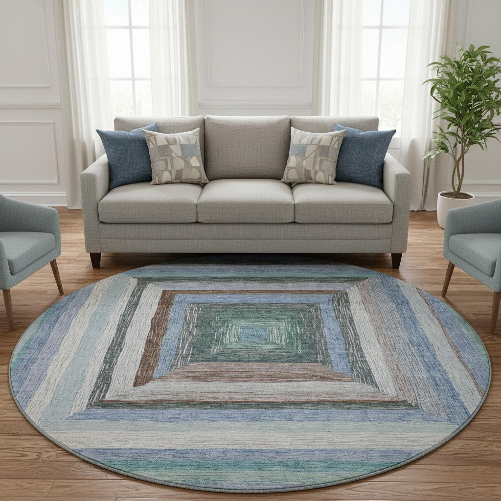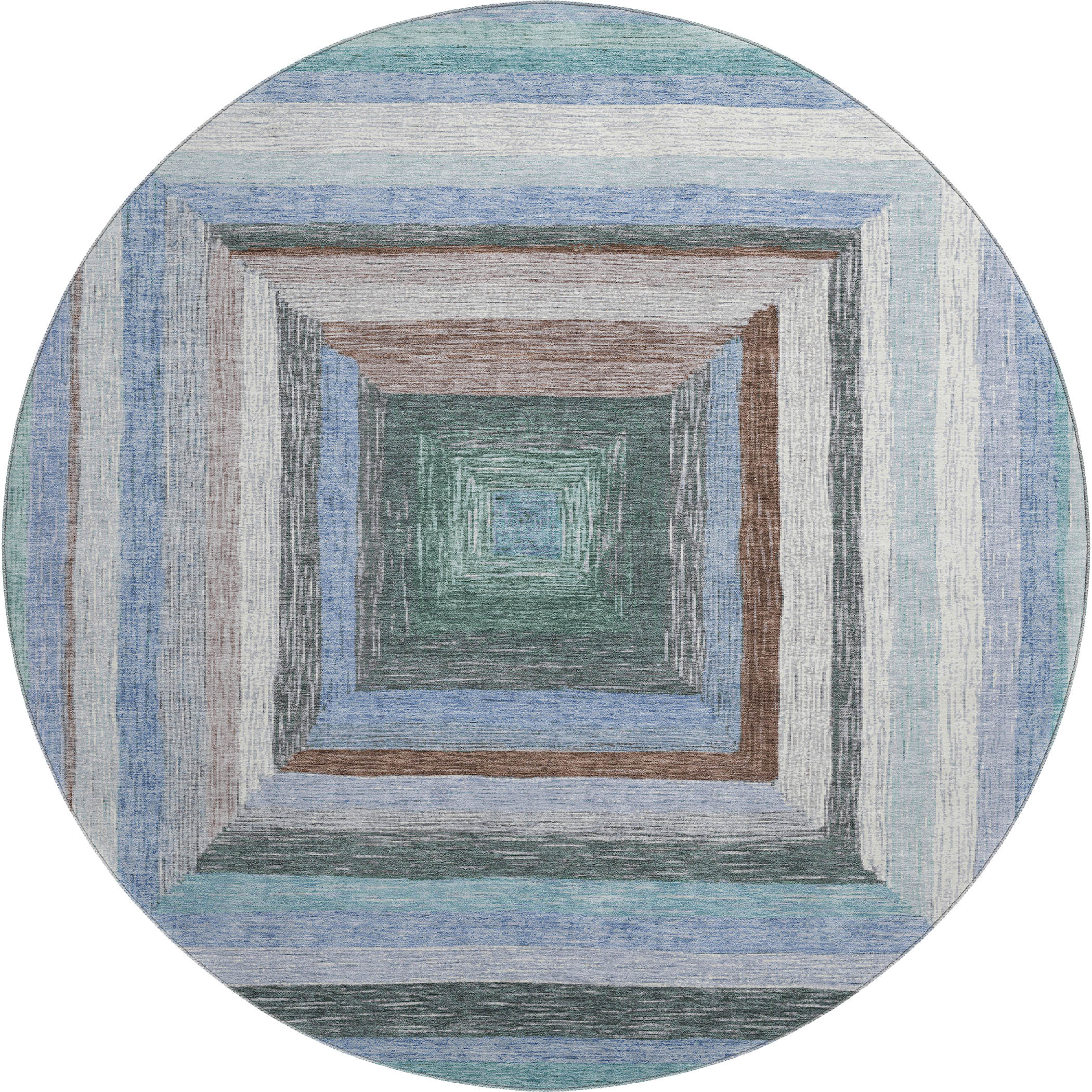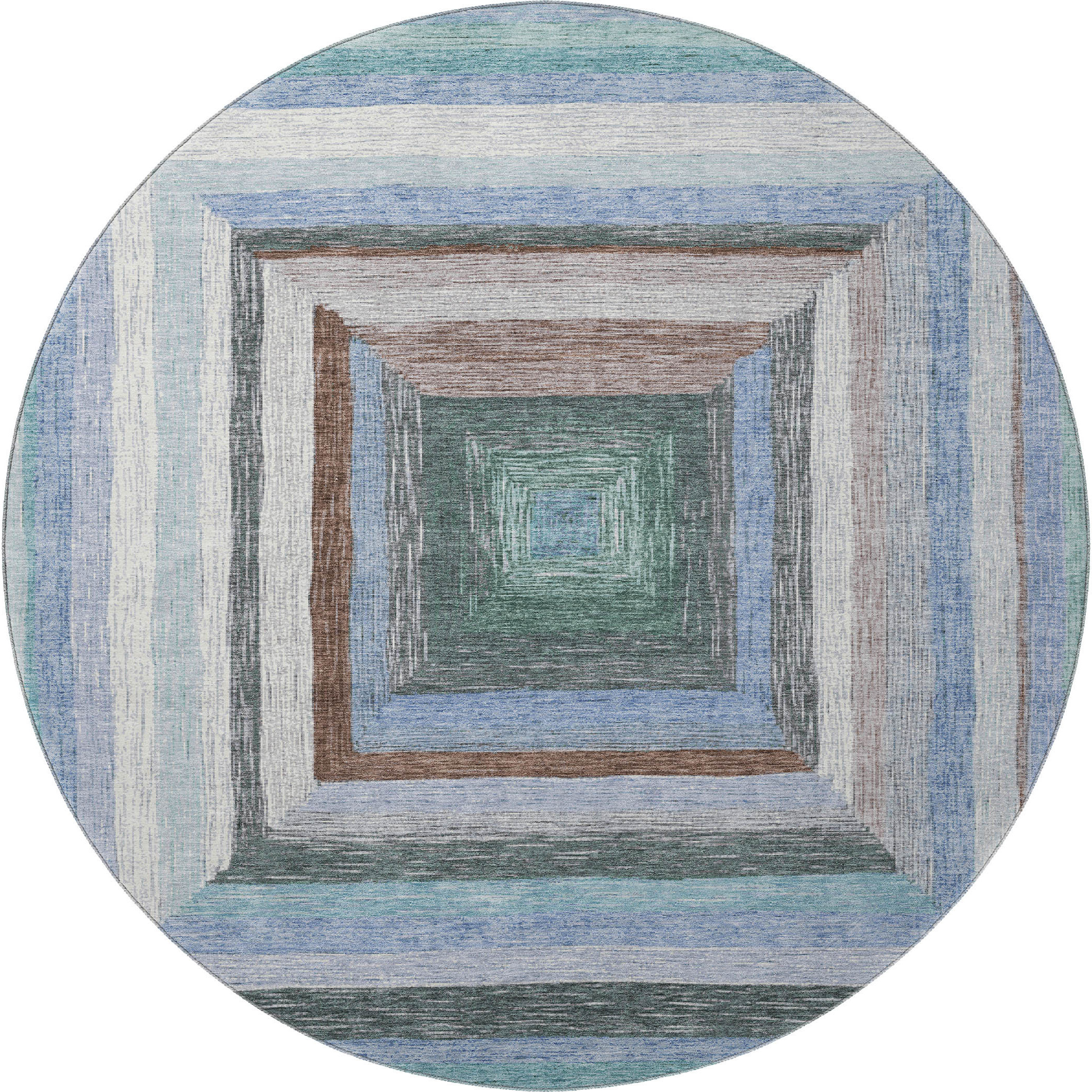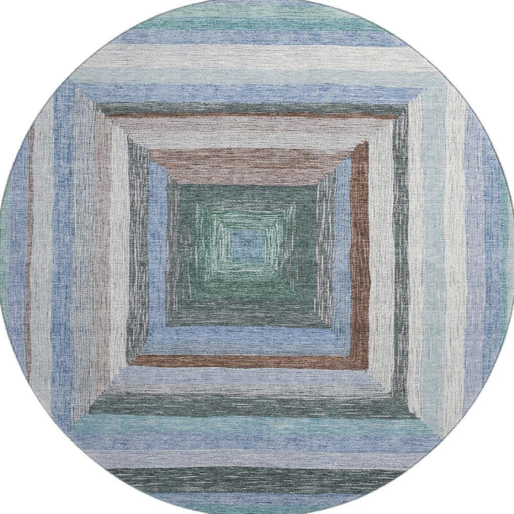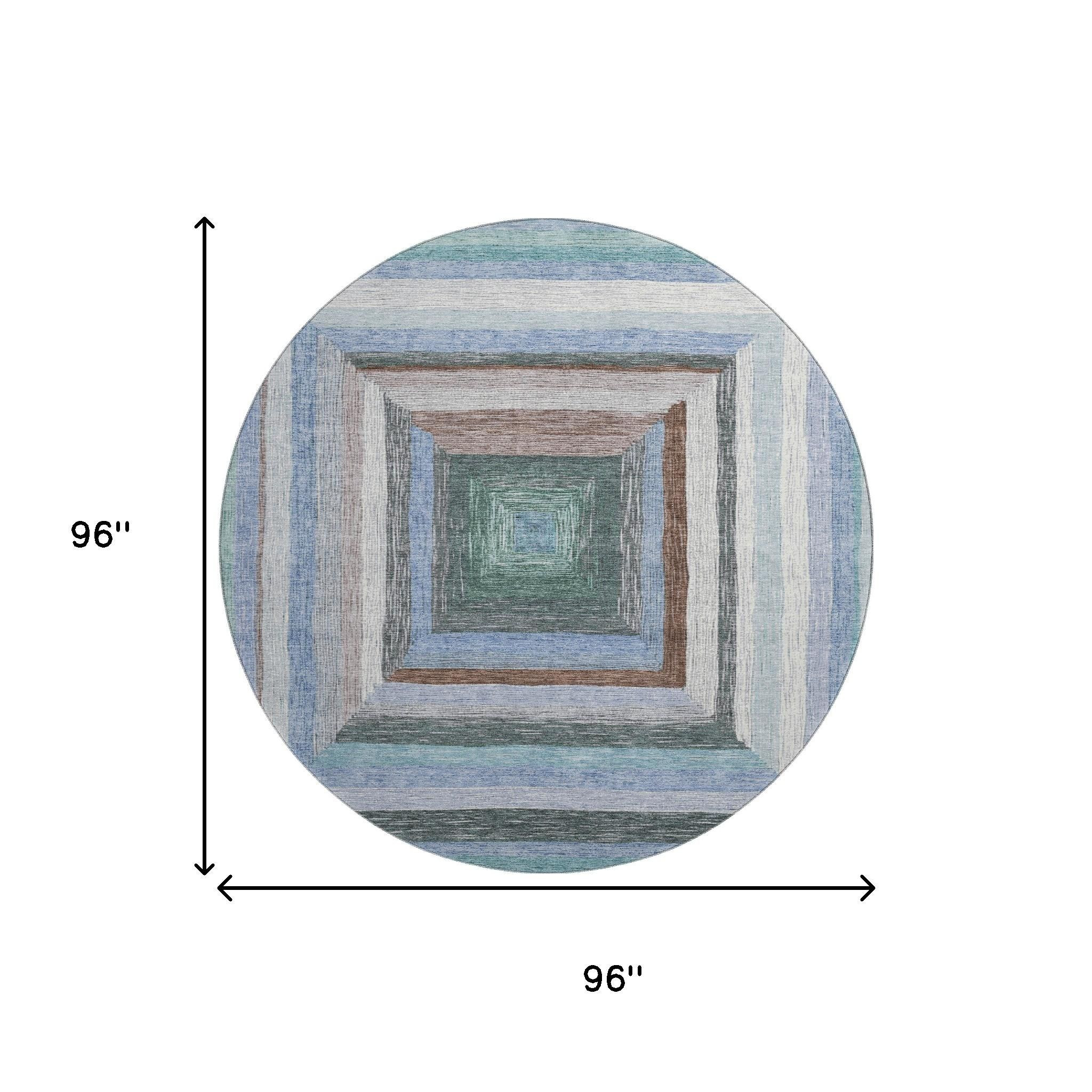 Add great coloration and comfortable texture to your space with this 8-foot denim blue ivory and brown geometric washable round rug with uv protection. Ideal for spaces with kids and pets, this rug is stain resistant to help repel dirt and spilled liquids. Built to last, this rug crafted from polyester fibers is known for its durability and long lasting appeal. Rugs are a great way to showcase your style, hide imperfections, warm your home and reduce noise. This larger sized, transitional styled rug is ready to create a focal point or statement piece in your room. 96.00-inch h x 96.00-inch w x 0.39-inch d.