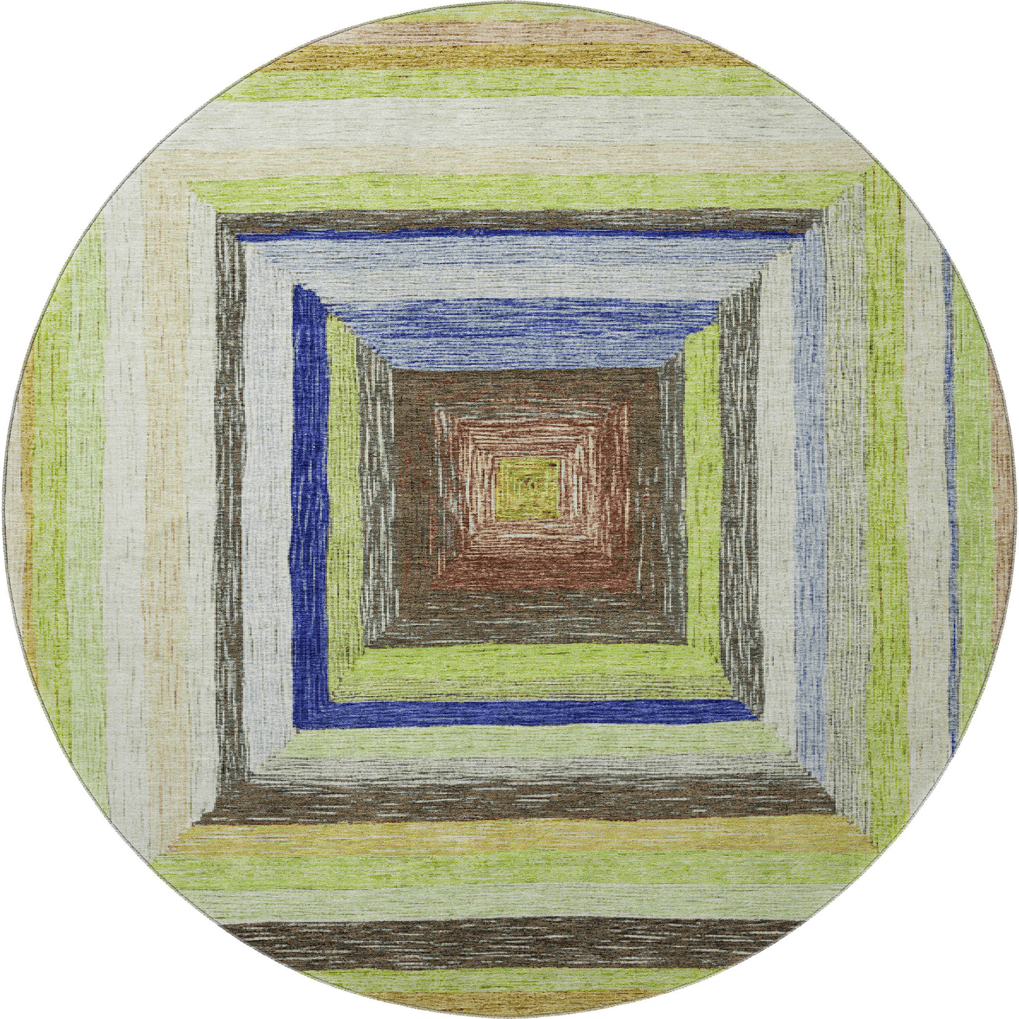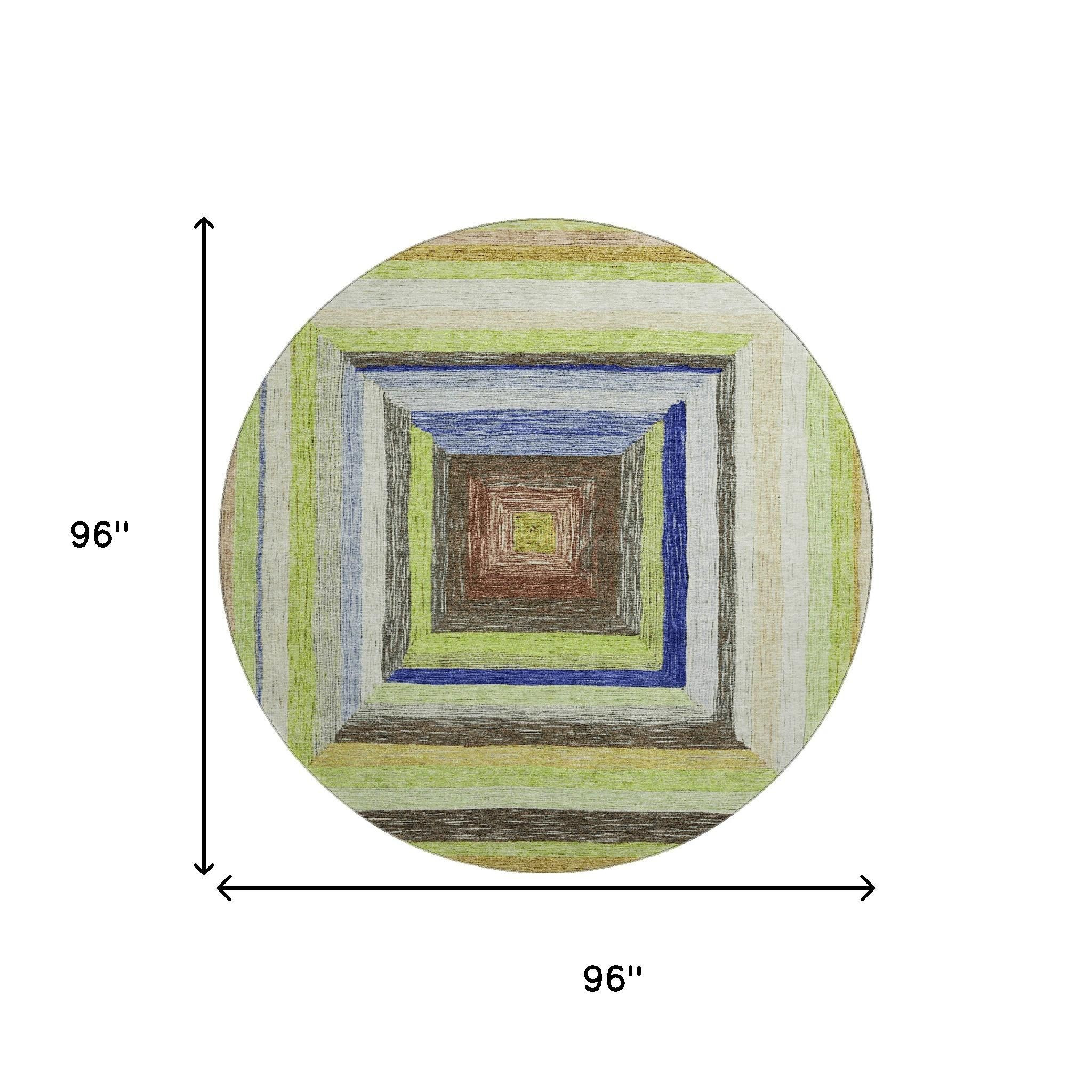 Set an inviting tone in your space with this 8-foot lime green blue and brown geometric washable round rug with uv protection. Ideal for spaces with kids and pets, this rug is stain resistant to help repel dirt and spilled liquids. Built to last, this rug crafted from polyester fibers is known for its durability and long lasting appeal. Rugs are a great way to showcase your style, hide imperfections, warm your home and reduce noise. This larger sized, transitional styled rug is ready to create a focal point or statement piece in your room. 96.00-inch h x 96.00-inch w x 0.39-inch d.