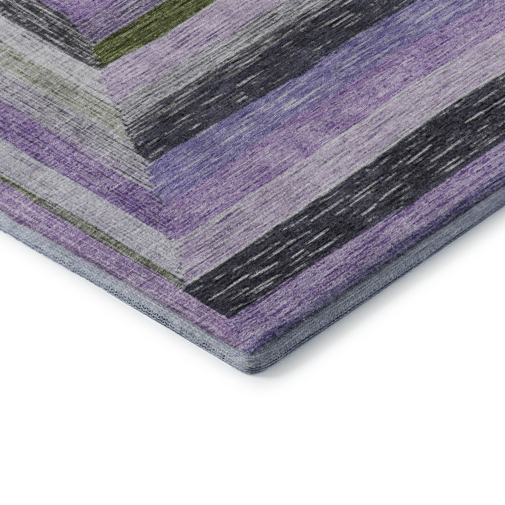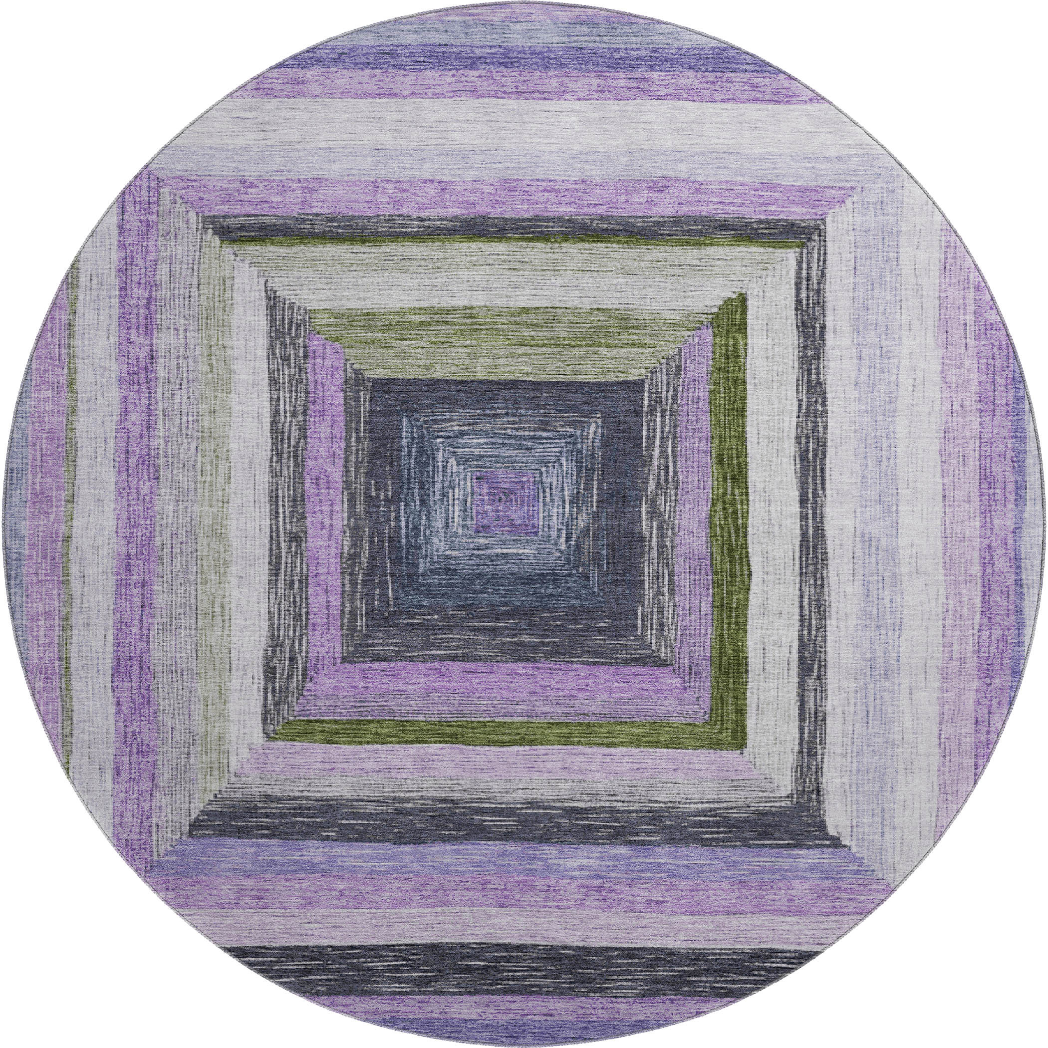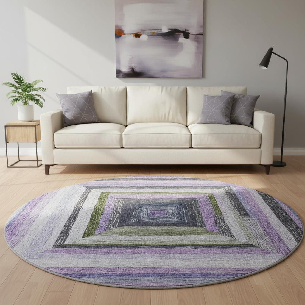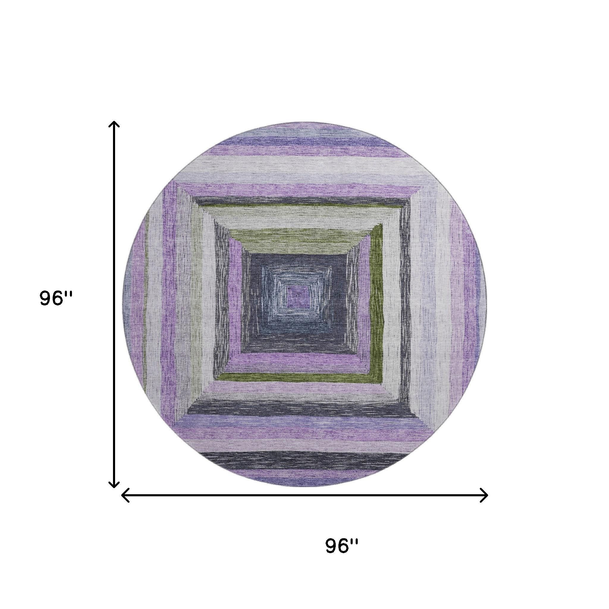 Add some artistry to your room with this 8-foot lavender ivory and charcoal geometric washable round rug with uv protection. Ideal for spaces with kids and pets, this rug is stain resistant to help repel dirt and spilled liquids. Built to last, this rug crafted from polyester fibers is known for its durability and long lasting appeal. Rugs are a great way to showcase your style, hide imperfections, warm your home and reduce noise. This larger sized, transitional styled rug is ready to create a focal point or statement piece in your room. 96.00-inch h x 96.00-inch w x 0.39-inch d.