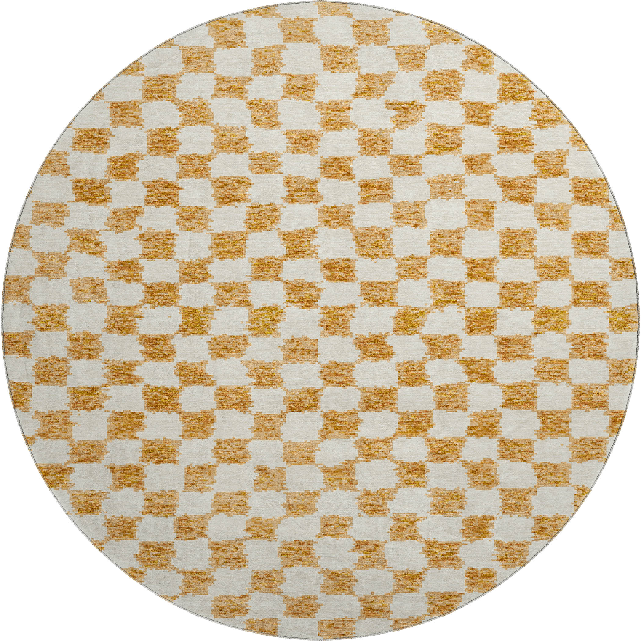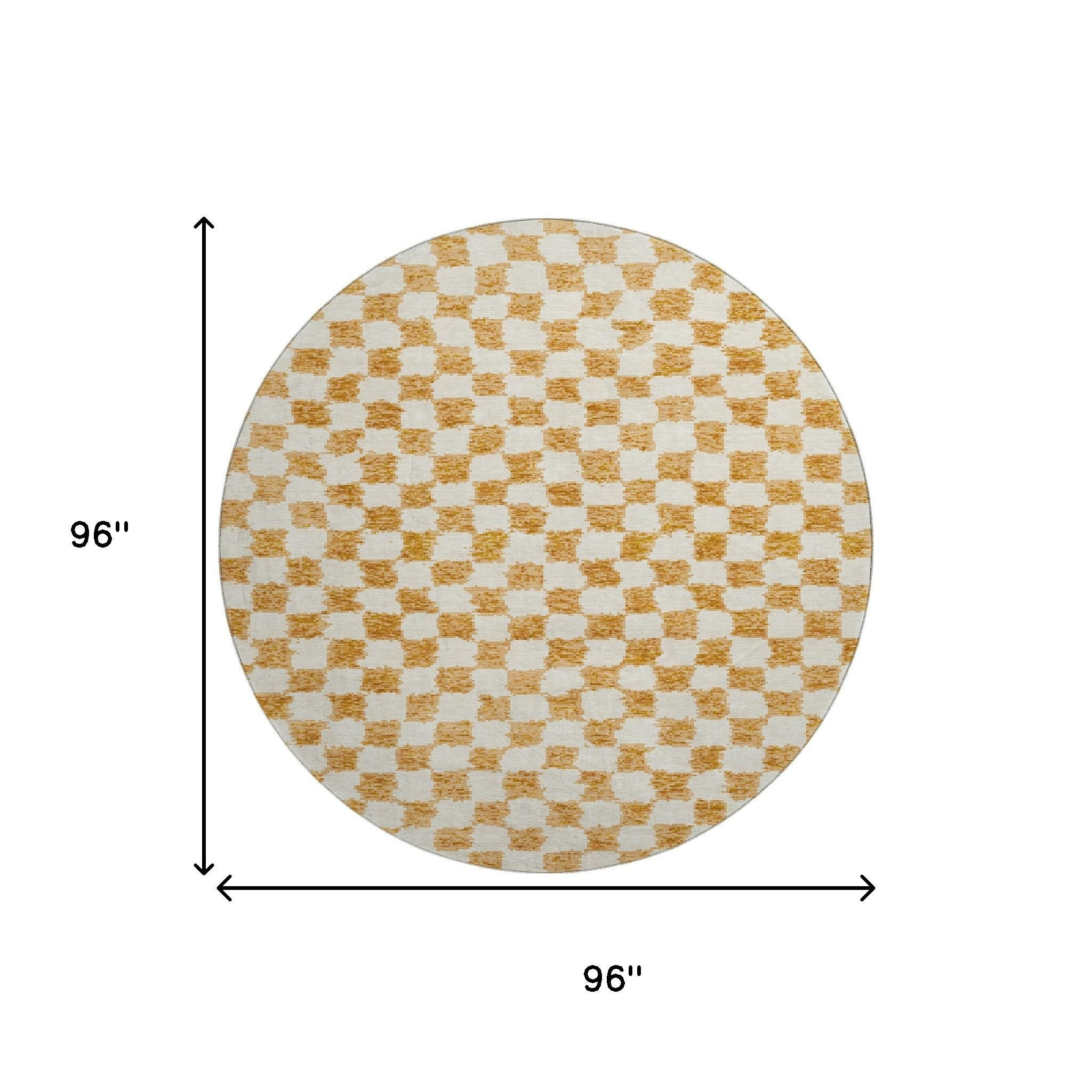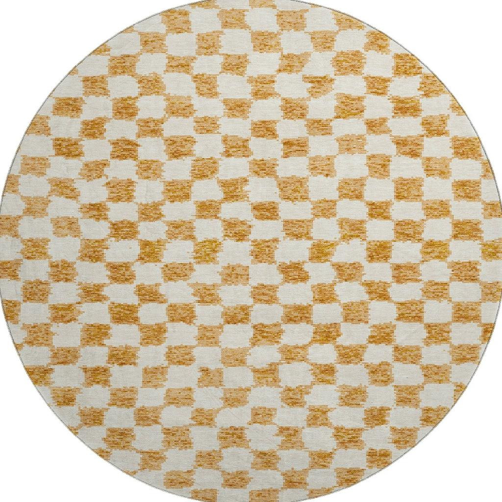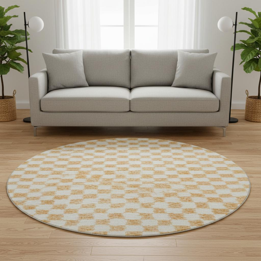 Add some artistry to your room with this 8-foot orange and ivory geometric washable round rug with uv protection. Ideal for spaces with kids and pets, this rug is stain resistant to help repel dirt and spilled liquids. Built to last, this rug crafted from polyester fibers is known for its durability and long lasting appeal. Rugs are a great way to showcase your style, hide imperfections, warm your home and reduce noise. This larger sized, transitional styled rug is ready to create a focal point or statement piece in your room. 96.00-inch h x 96.00-inch w x 0.39-inch d.