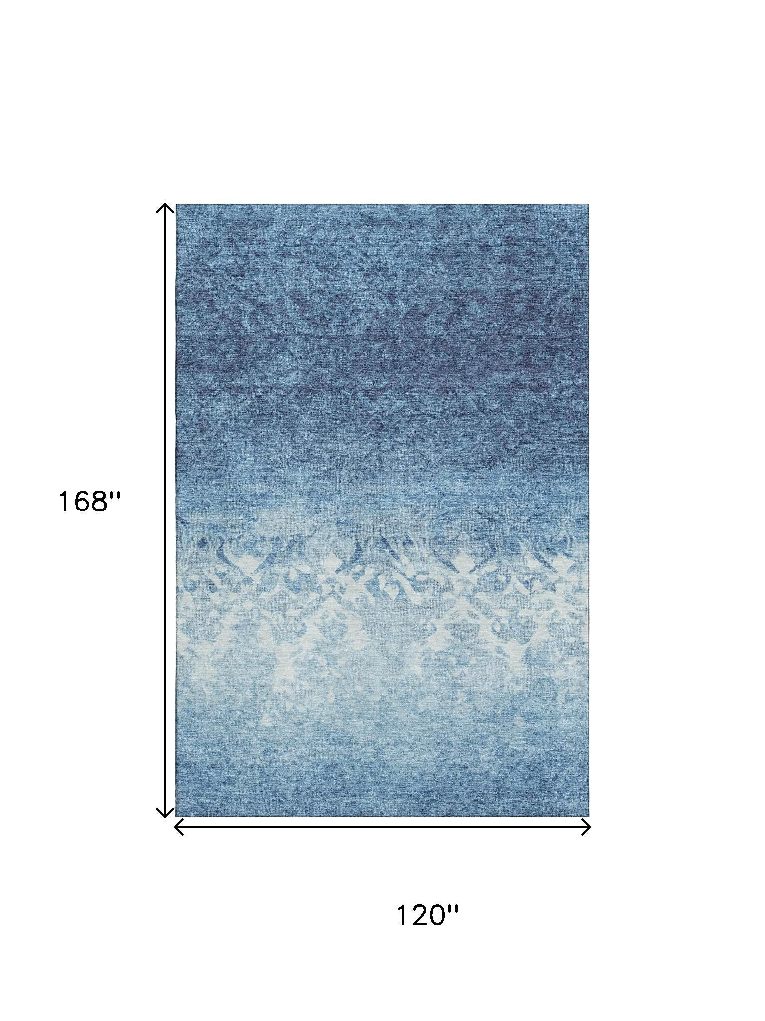 Add great coloration and comfortable texture to your space with this 10-foot x 14-foot denim blue and ivory damask washable area rug with uv protection. Ideal for spaces with kids and pets, this rug is stain resistant to help repel dirt and spilled liquids. Built to last, this rug crafted from polyester fibers is known for its durability and long lasting appeal. Rugs are a great way to showcase your style, hide imperfections, warm your home and reduce noise. This larger sized, transitional styled rug is ready to create a focal point or statement piece in your room. 120.00-inch h x 168.00-inch w x 0.39-inch d.