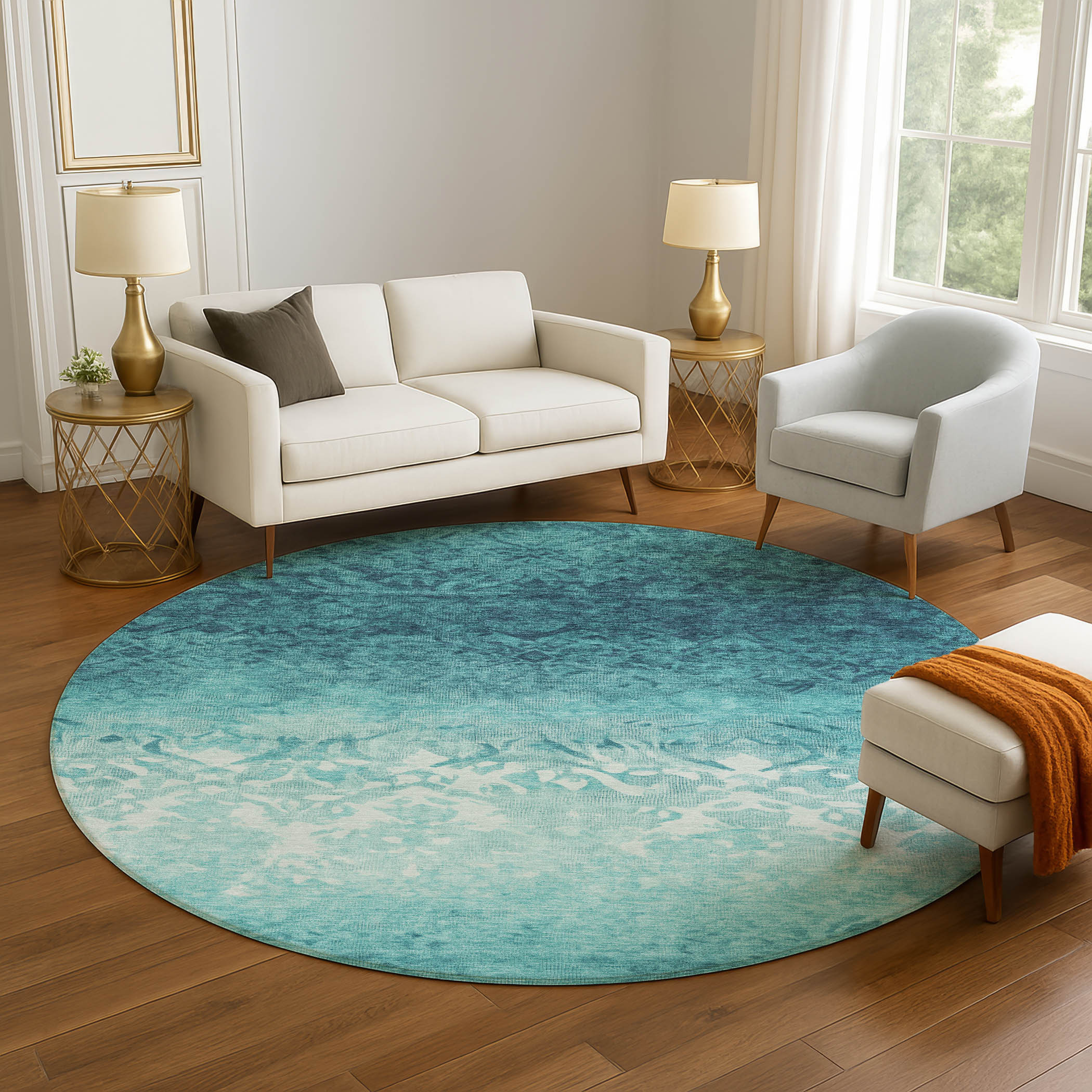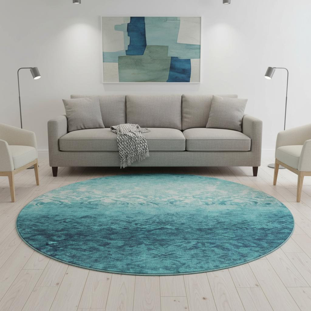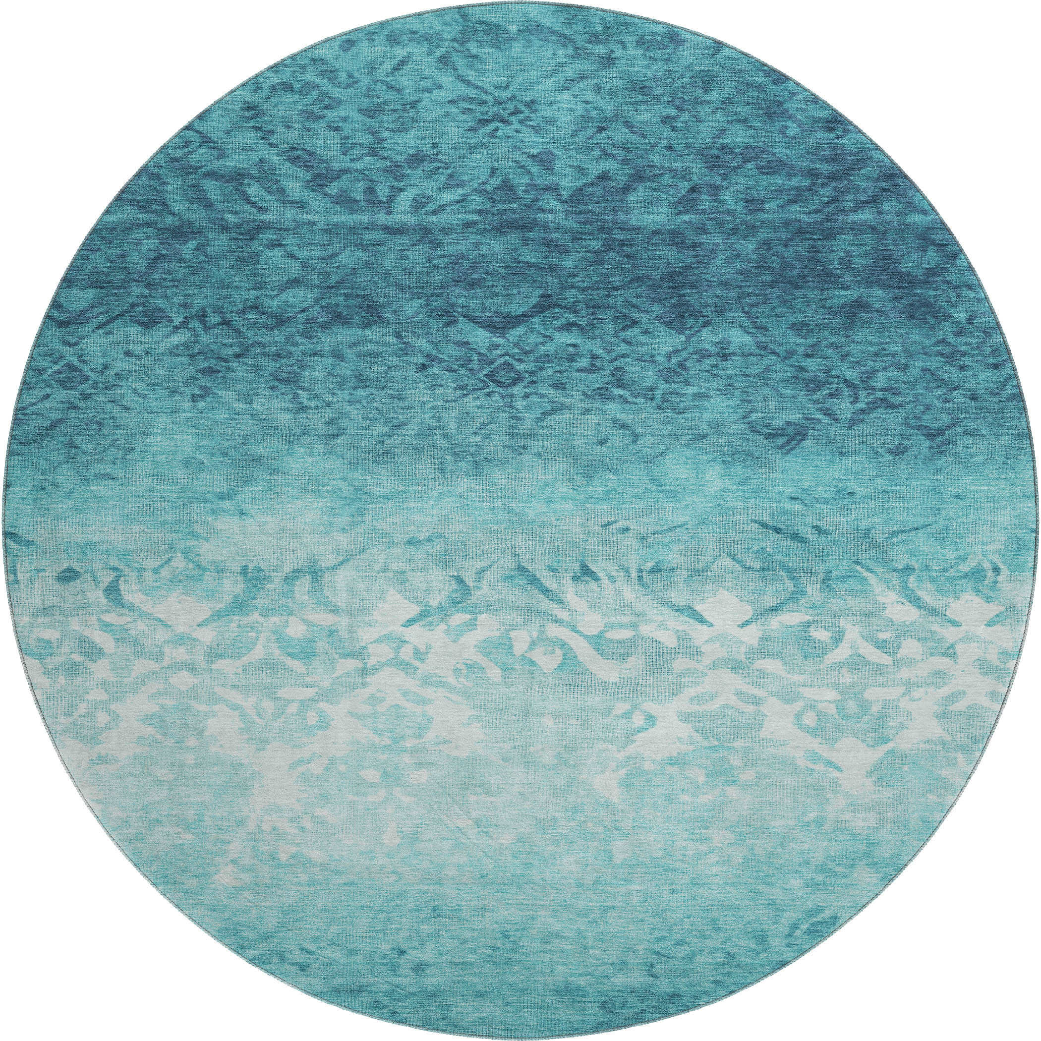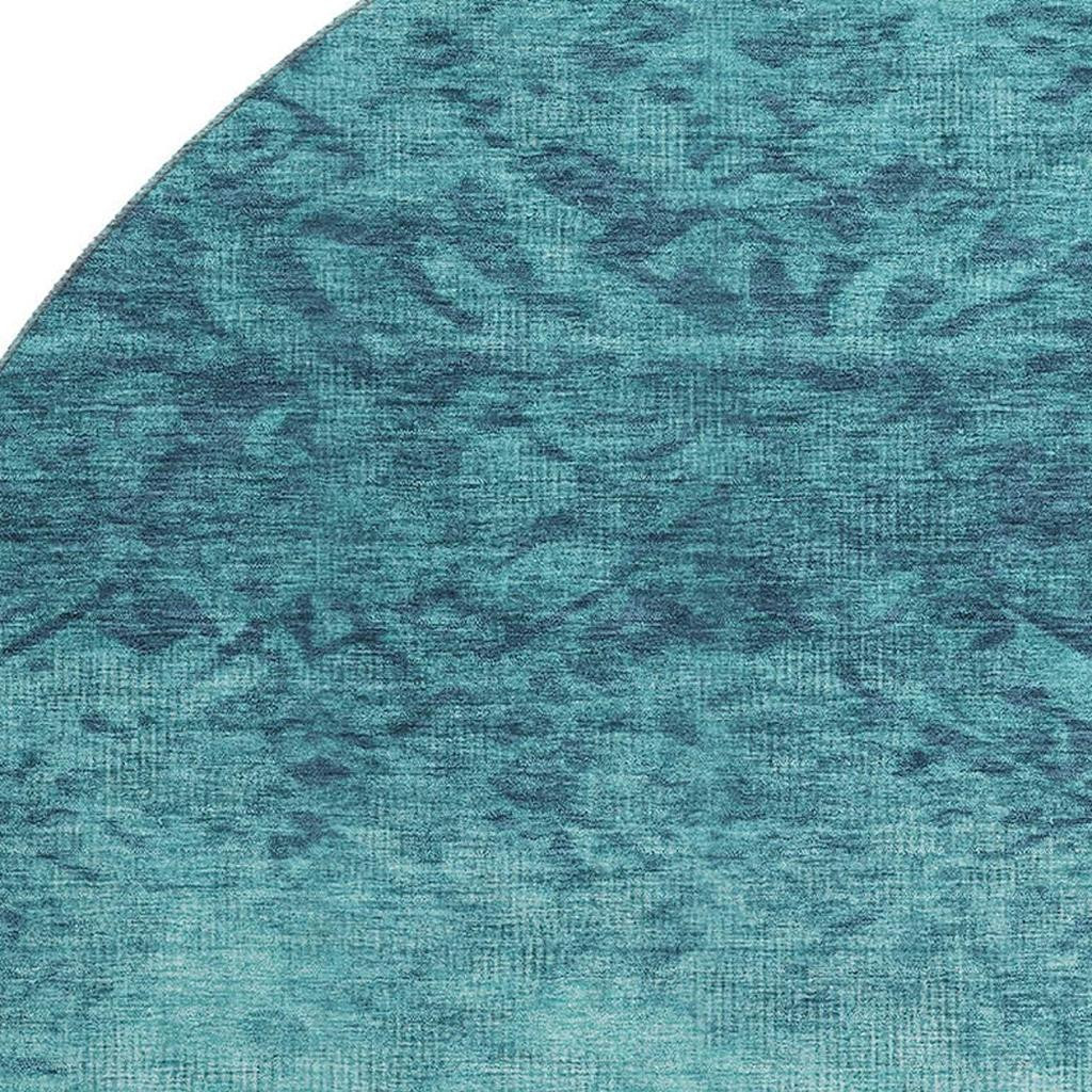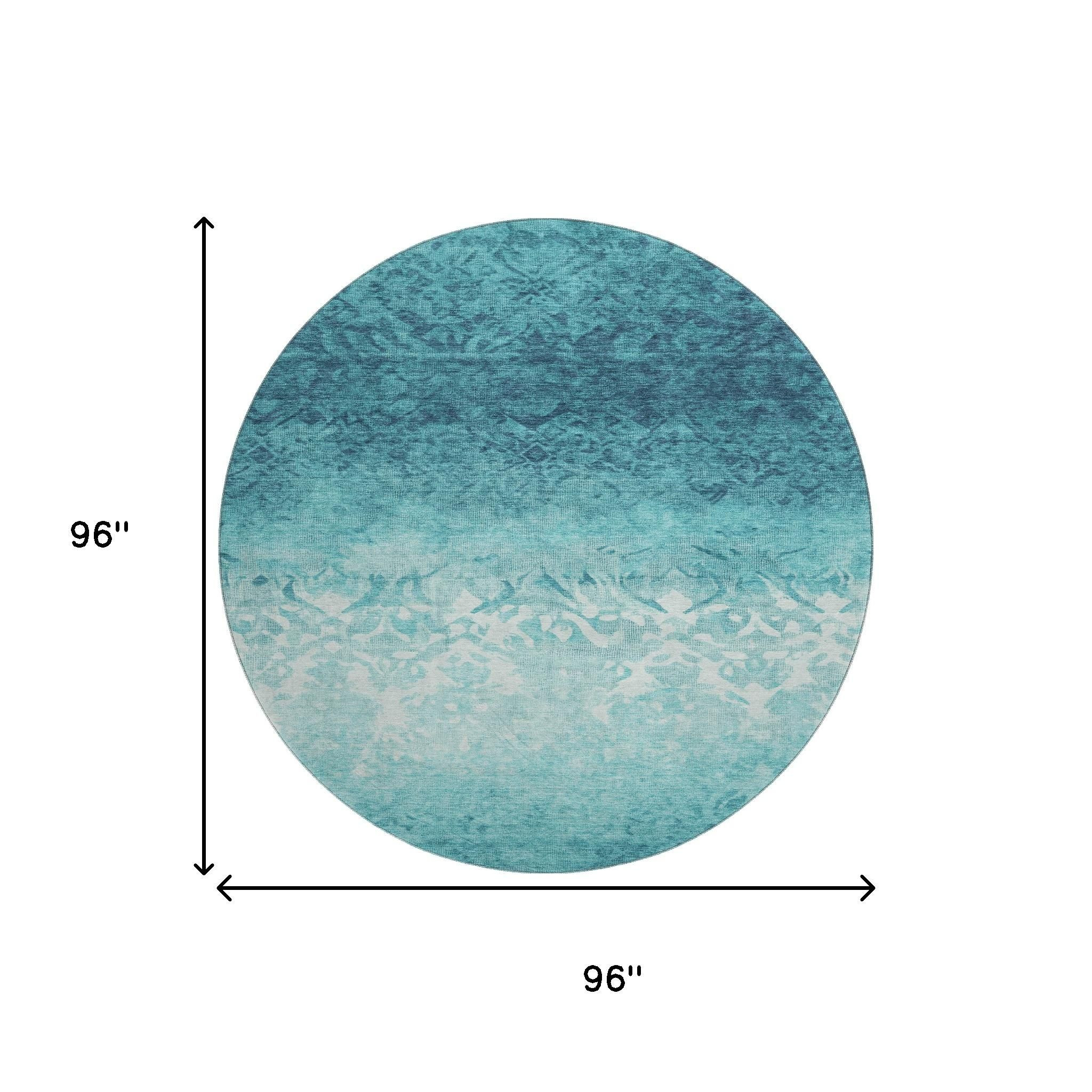 Add great coloration and comfortable texture to your space with this 8-foot teal and ivory damask washable round rug with uv protection. Ideal for spaces with kids and pets, this rug is stain resistant to help repel dirt and spilled liquids. Built to last, this rug crafted from polyester fibers is known for its durability and long lasting appeal. Rugs are a great way to showcase your style, hide imperfections, warm your home and reduce noise. This larger sized, transitional styled rug is ready to create a focal point or statement piece in your room. 96.00-inch h x 96.00-inch w x 0.39-inch d.