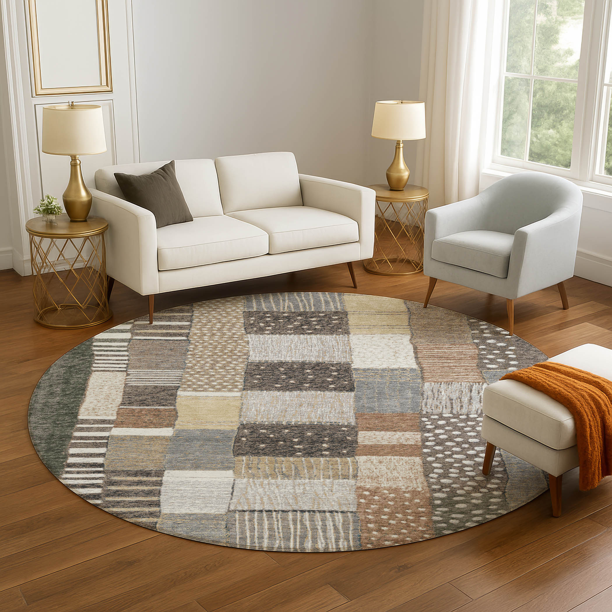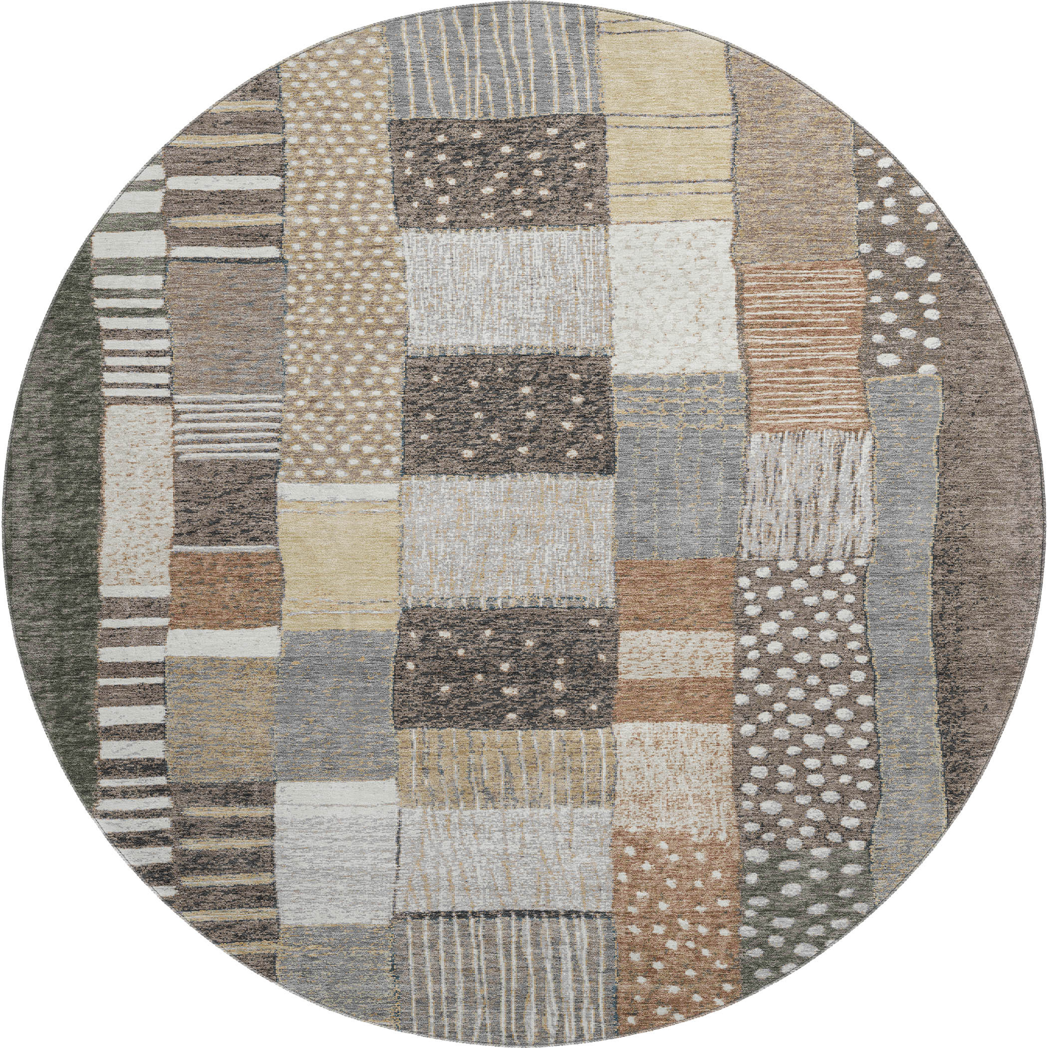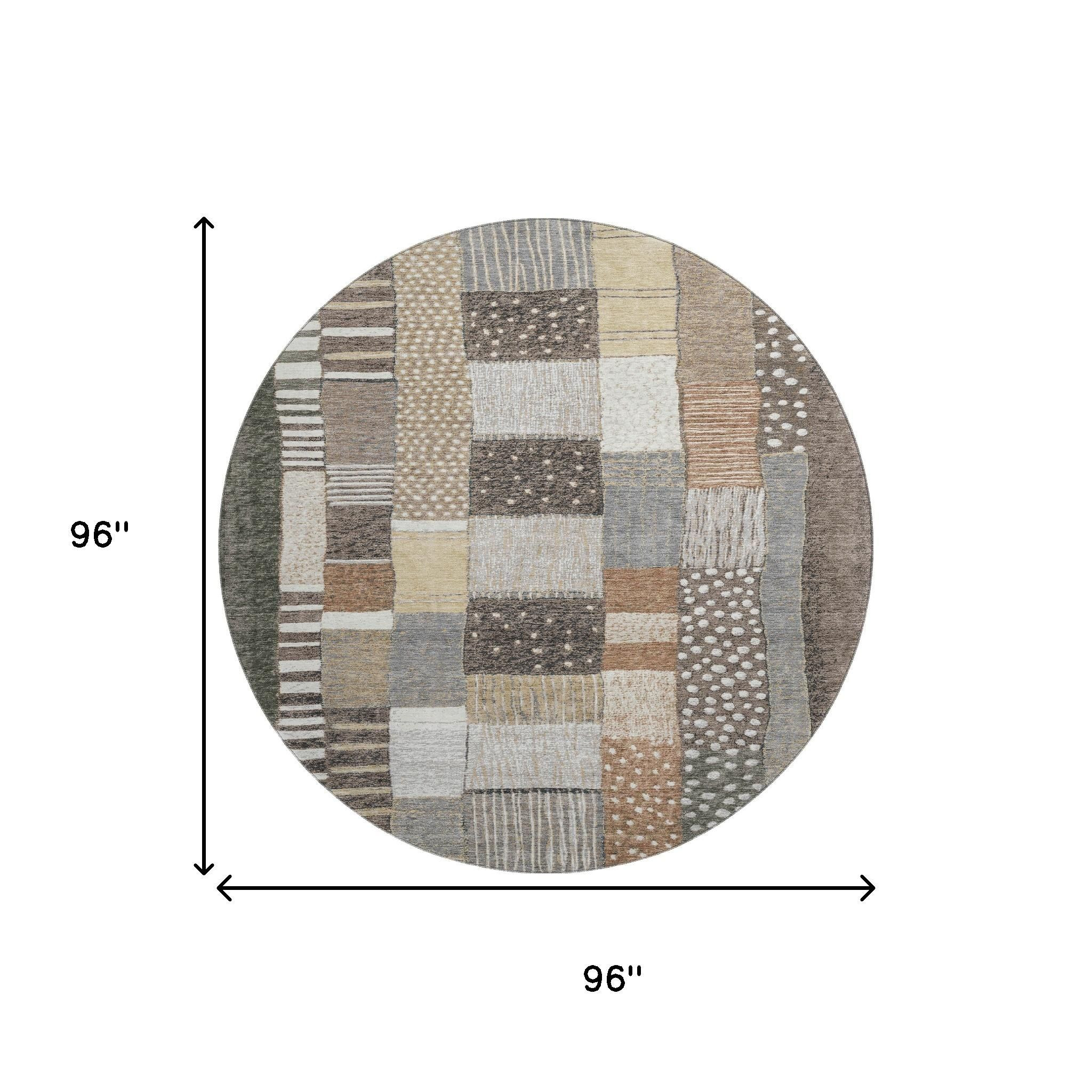 Add great coloration and comfortable texture to your space with this 8-foot brown ivory and gray geometric washable round rug with uv protection. Ideal for spaces with kids and pets, this rug is stain resistant to help repel dirt and spilled liquids. Built to last, this rug crafted from polyester fibers is known for its durability and long lasting appeal. Rugs are a great way to showcase your style, hide imperfections, warm your home and reduce noise. This larger sized, transitional styled rug is ready to create a focal point or statement piece in your room. 96.00-inch h x 96.00-inch w x 0.39-inch d.