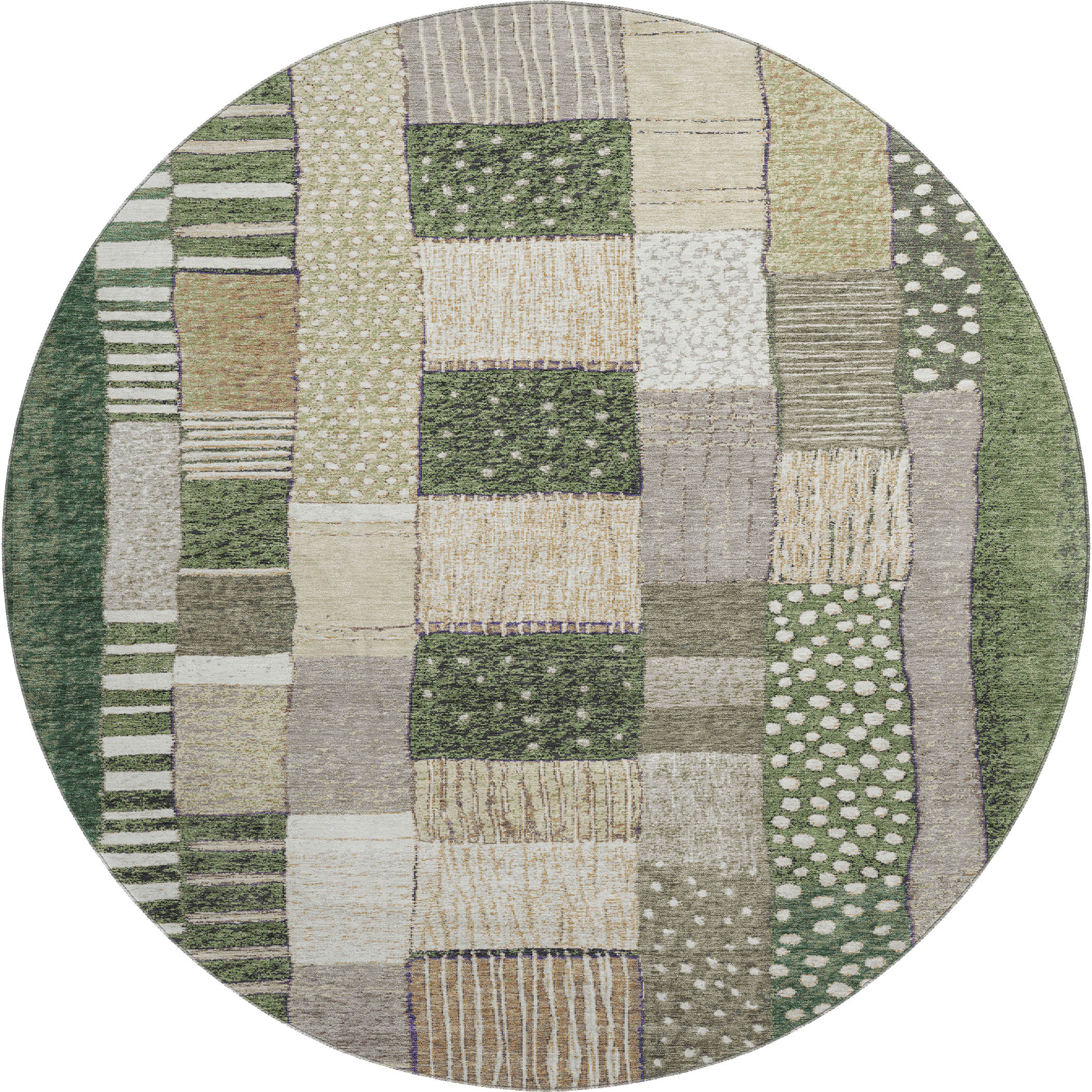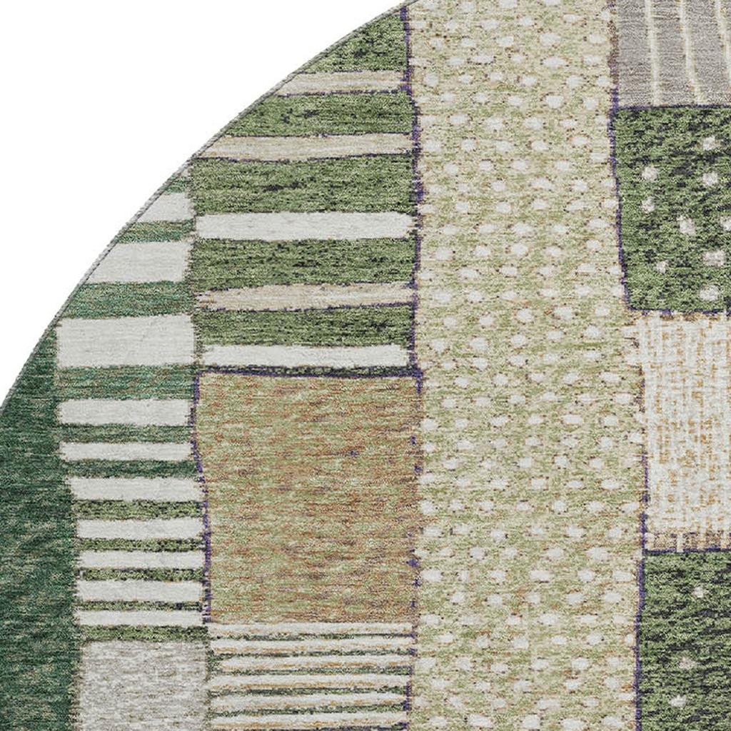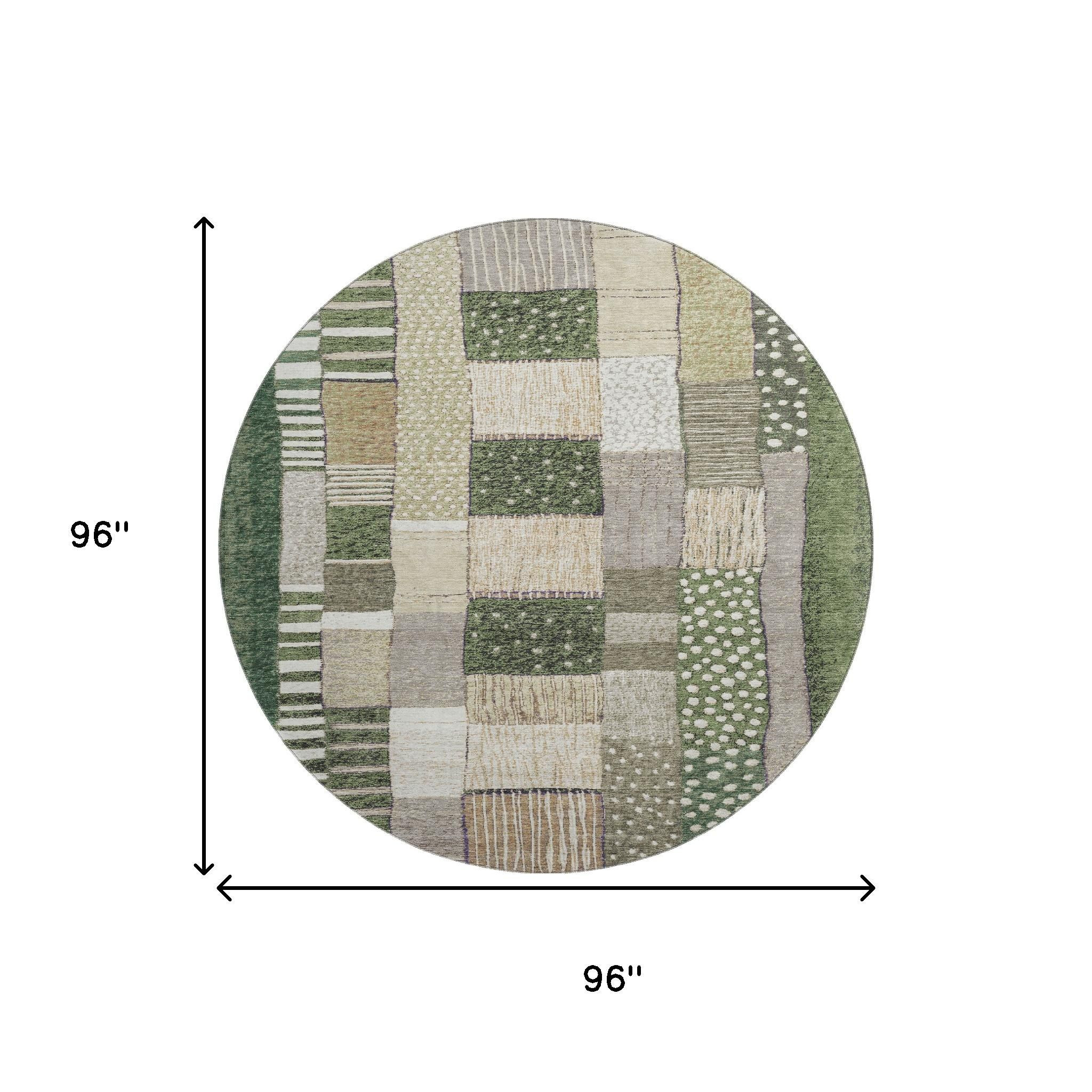 Set an inviting tone in your space with this 8-foot olive green beige and ivory geometric washable round rug with uv protection. Ideal for spaces with kids and pets, this rug is stain resistant to help repel dirt and spilled liquids. Built to last, this rug crafted from polyester fibers is known for its durability and long lasting appeal. Rugs are a great way to showcase your style, hide imperfections, warm your home and reduce noise. This larger sized, transitional styled rug is ready to create a focal point or statement piece in your room. 96.00-inch h x 96.00-inch w x 0.39-inch d.