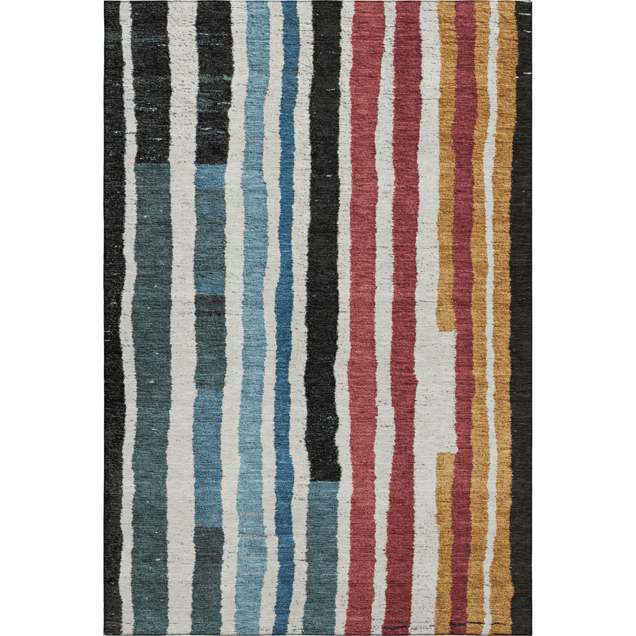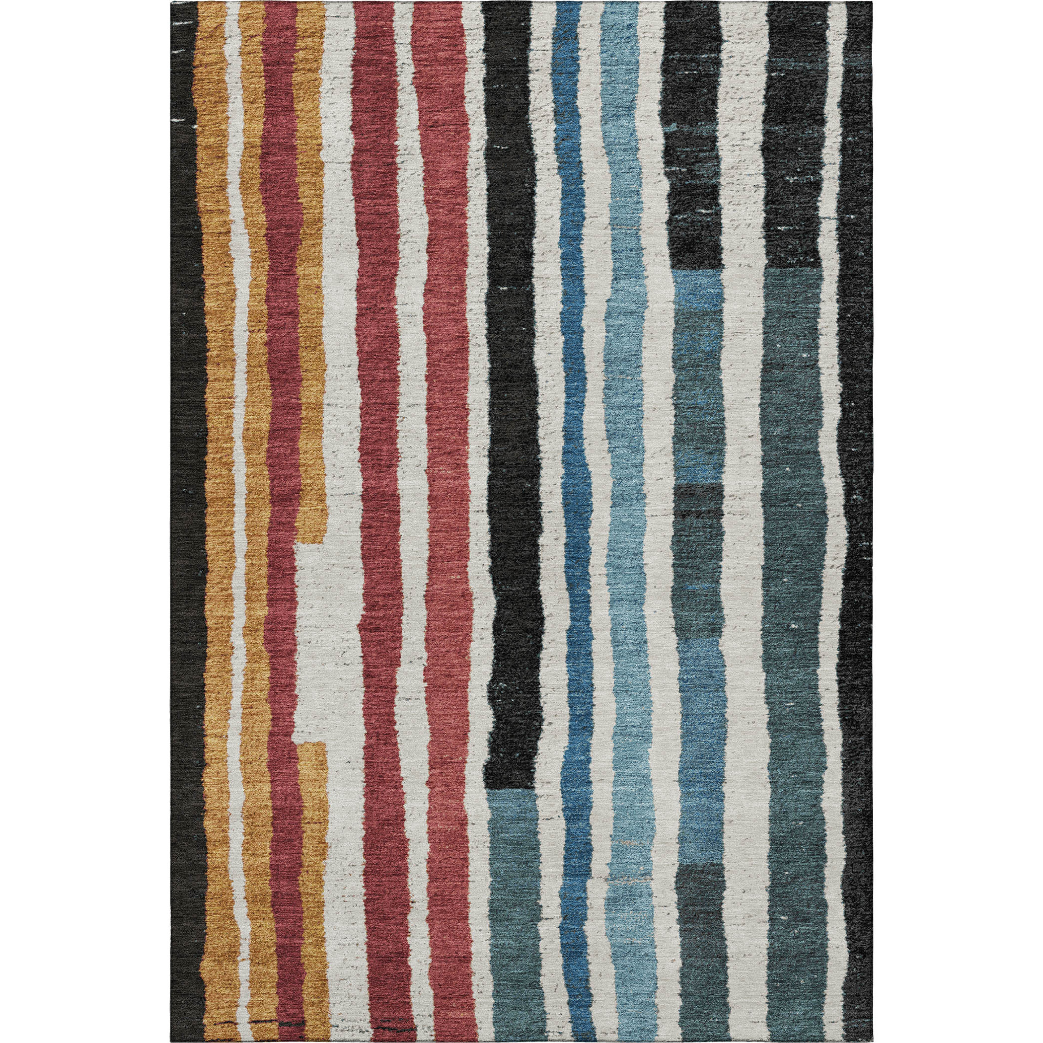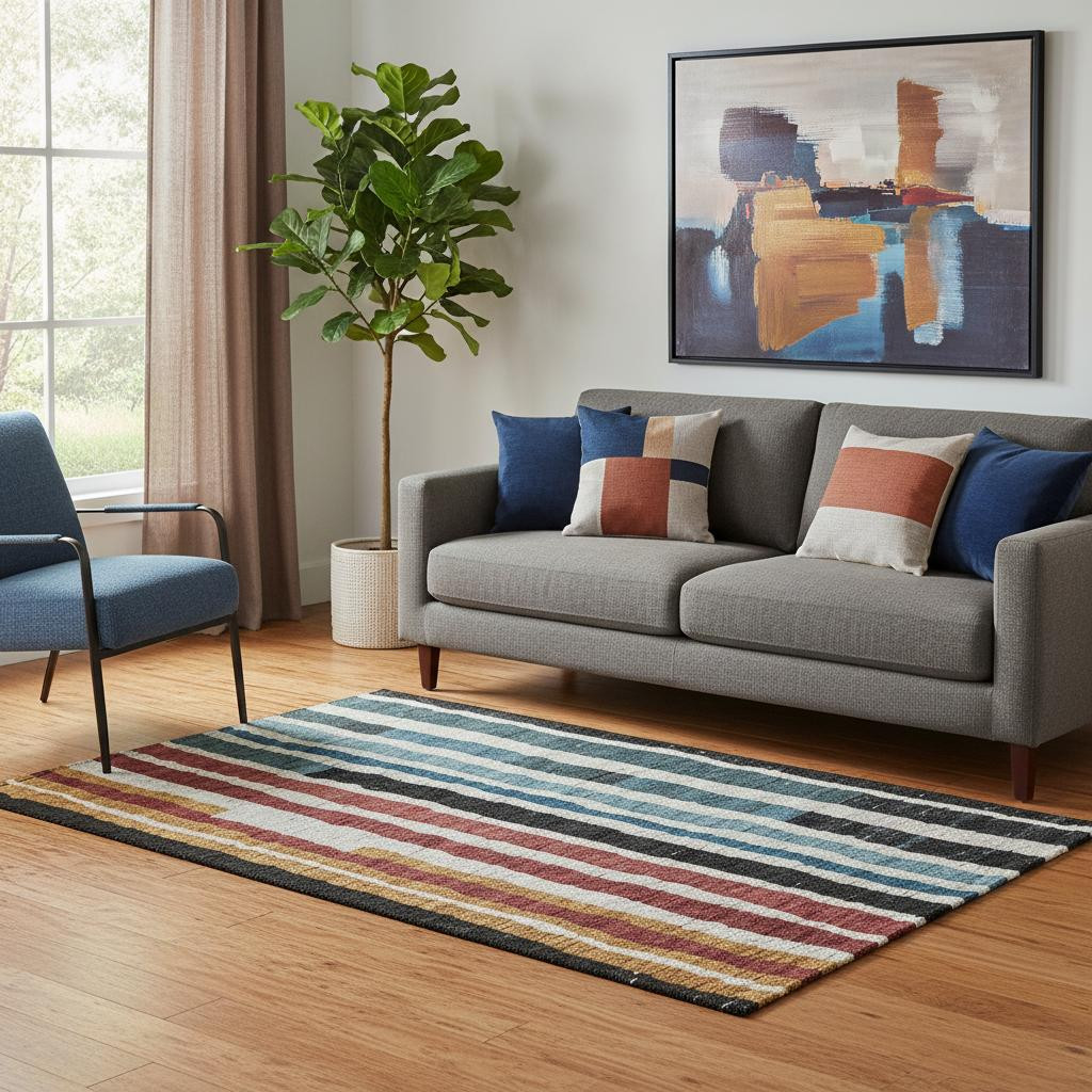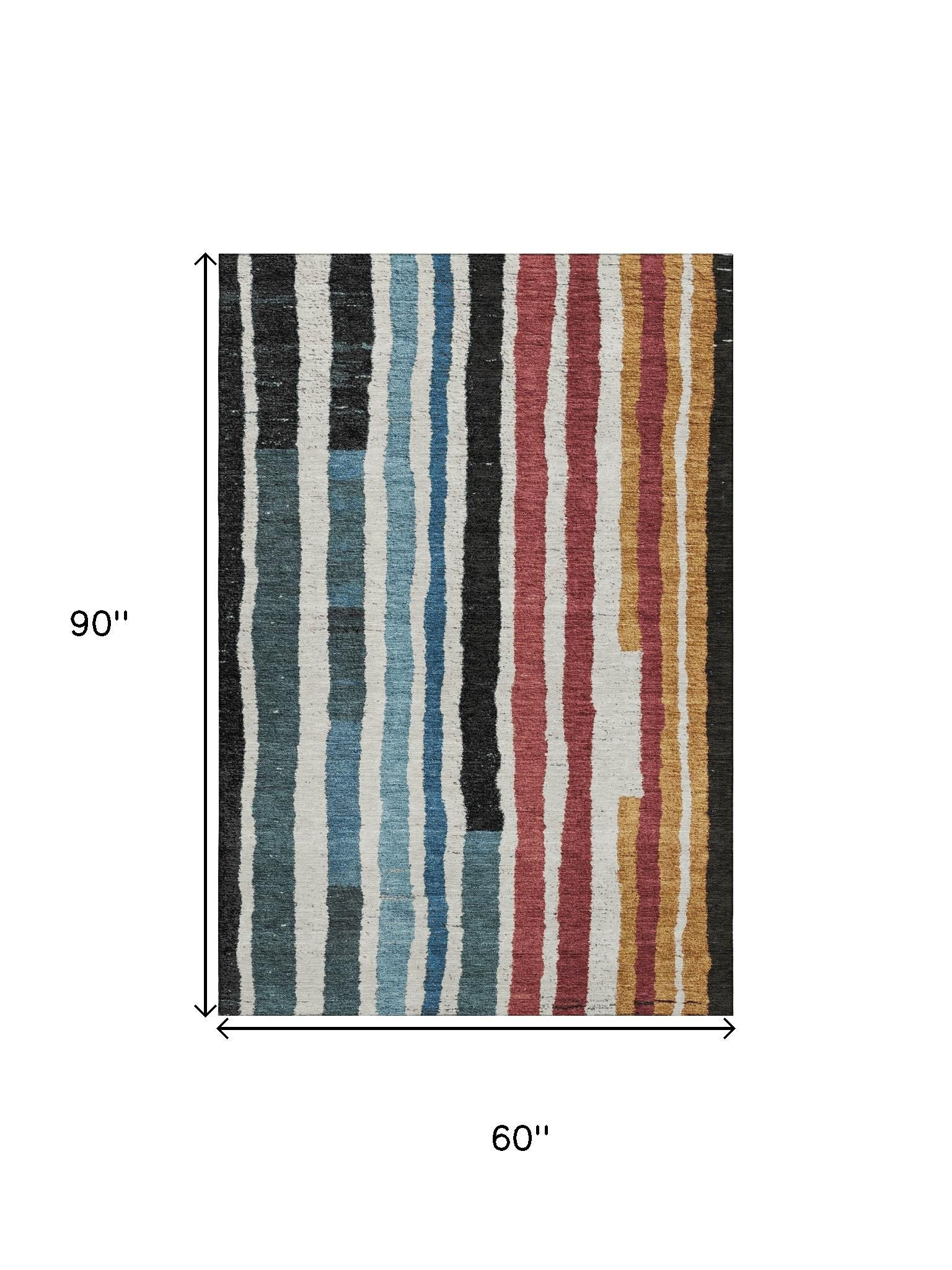 Add some artistry to your room with this 5-foot x 8-foot black blue and copper striped washable area rug with uv protection. Ideal for spaces with kids and pets, this rug is stain resistant to help repel dirt and spilled liquids. Built to last, this rug crafted from polyester fibers is known for its durability and long lasting appeal. Rugs are a great way to showcase your style, hide imperfections, warm your home and reduce noise. This larger sized, transitional styled rug is ready to create a focal point or statement piece in your room. 60.00-inch h x 90.00-inch w x 0.39-inch d.