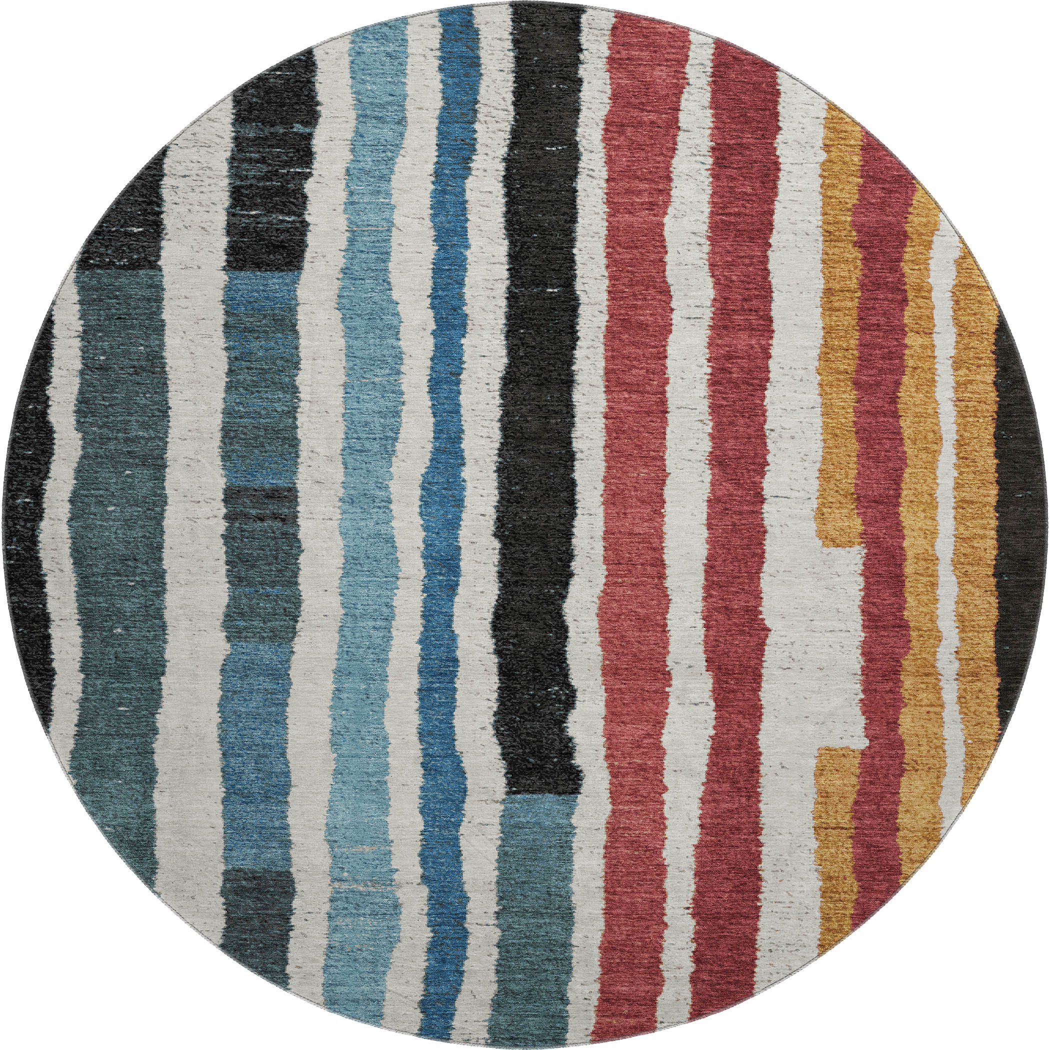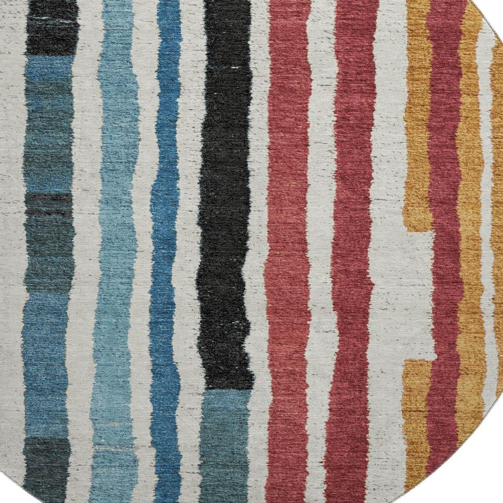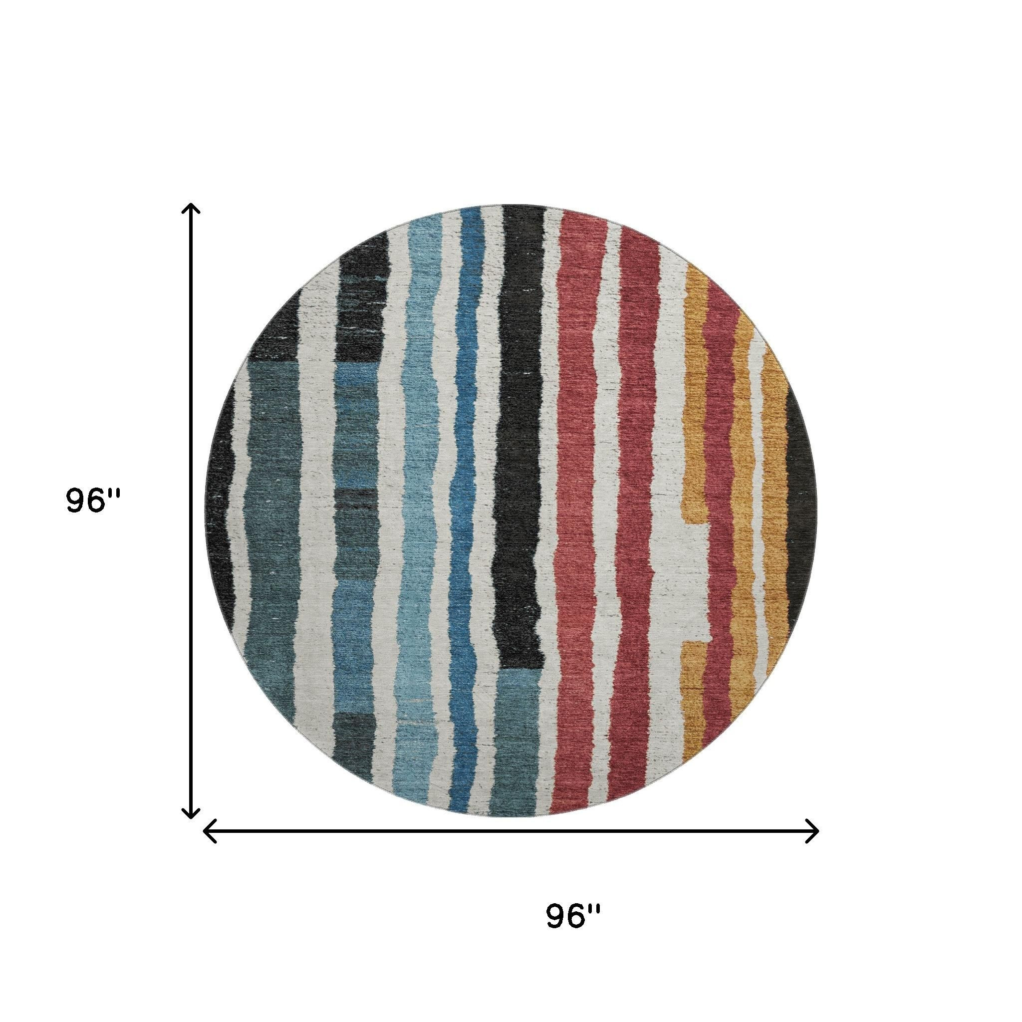 Add great coloration and comfortable texture to your space with this 8-foot black blue and copper striped washable round rug with uv protection. Ideal for spaces with kids and pets, this rug is stain resistant to help repel dirt and spilled liquids. Built to last, this rug crafted from polyester fibers is known for its durability and long lasting appeal. Rugs are a great way to showcase your style, hide imperfections, warm your home and reduce noise. This larger sized, transitional styled rug is ready to create a focal point or statement piece in your room. 96.00-inch h x 96.00-inch w x 0.39-inch d.