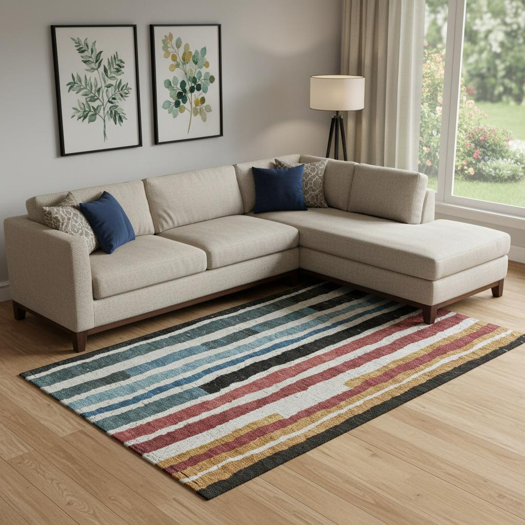 Set an inviting tone in your space with this 9-foot x 12-foot black blue and copper striped washable area rug with uv protection. Ideal for spaces with kids and pets, this rug is stain resistant to help repel dirt and spilled liquids. Built to last, this rug crafted from polyester fibers is known for its durability and long lasting appeal. Rugs are a great way to showcase your style, hide imperfections, warm your home and reduce noise. This larger sized, transitional styled rug is ready to create a focal point or statement piece in your room. 108.00-inch h x 144.00-inch w x 0.39-inch d.