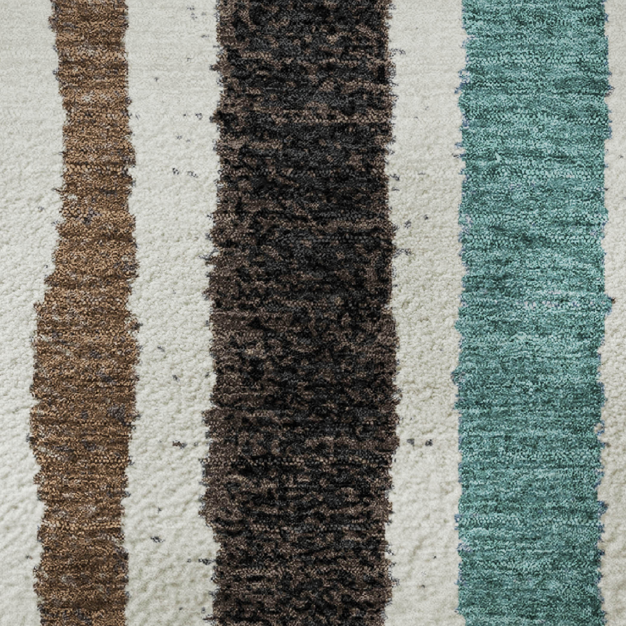 Add some artistry to your room with this 5-foot x 8-foot brown teal and ivory striped washable area rug with uv protection. Ideal for spaces with kids and pets, this rug is stain resistant to help repel dirt and spilled liquids. Built to last, this rug crafted from polyester fibers is known for its durability and long lasting appeal. Rugs are a great way to showcase your style, hide imperfections, warm your home and reduce noise. This larger sized, transitional styled rug is ready to create a focal point or statement piece in your room. 60.00-inch h x 90.00-inch w x 0.39-inch d.