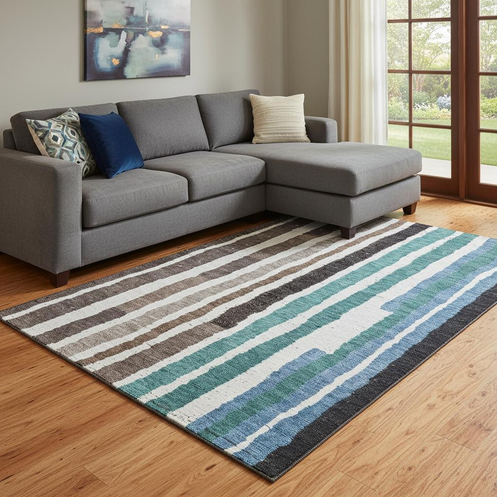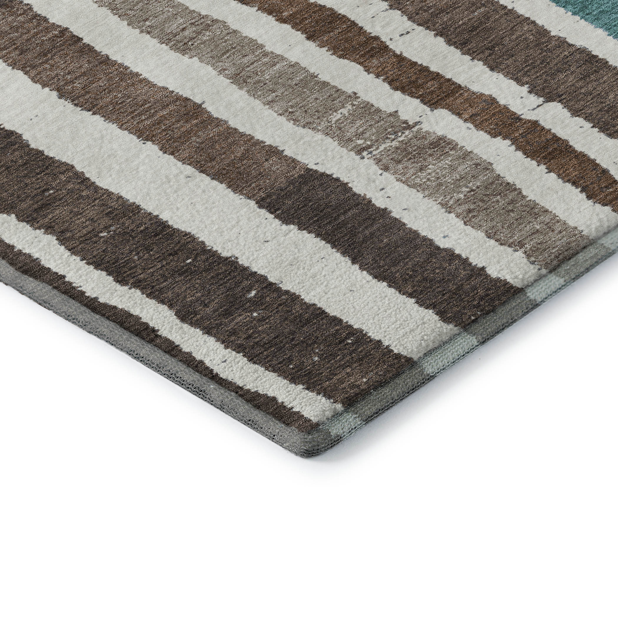 Add great coloration and comfortable texture to your space with this 8-foot x 10-foot brown teal and ivory striped washable area rug with uv protection. Ideal for spaces with kids and pets, this rug is stain resistant to help repel dirt and spilled liquids. Built to last, this rug crafted from polyester fibers is known for its durability and long lasting appeal. Rugs are a great way to showcase your style, hide imperfections, warm your home and reduce noise. This larger sized, transitional styled rug is ready to create a focal point or statement piece in your room. 96.00-inch h x 120.00-inch w x 0.39-inch d.