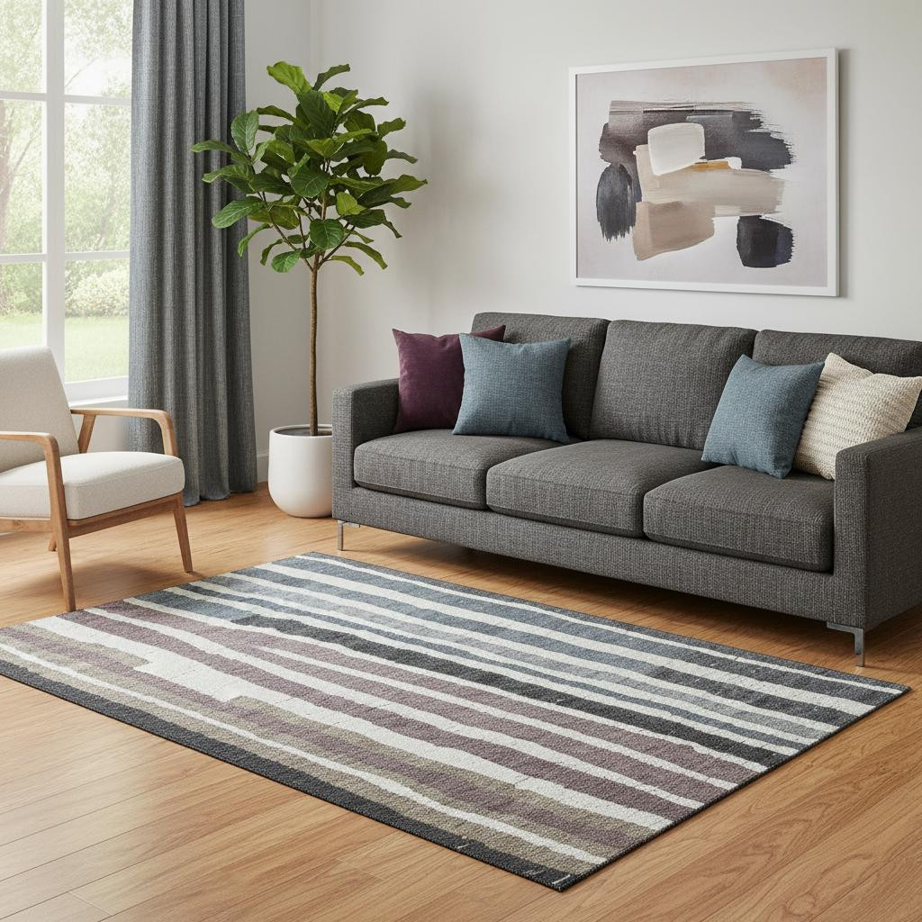 This 5-foot x 8-foot denim blue ivory and taupe striped washable area rug with uv protection, is a great way to add warmth to a room. Ideal for spaces with kids and pets, this rug is stain resistant to help repel dirt and spilled liquids. Built to last, this rug crafted from polyester fibers is known for its durability and long lasting appeal. Rugs are a great way to showcase your style, hide imperfections, warm your home and reduce noise. This larger sized, transitional styled rug is ready to create a focal point or statement piece in your room. 60.00-inch h x 90.00-inch w x 0.39-inch d.