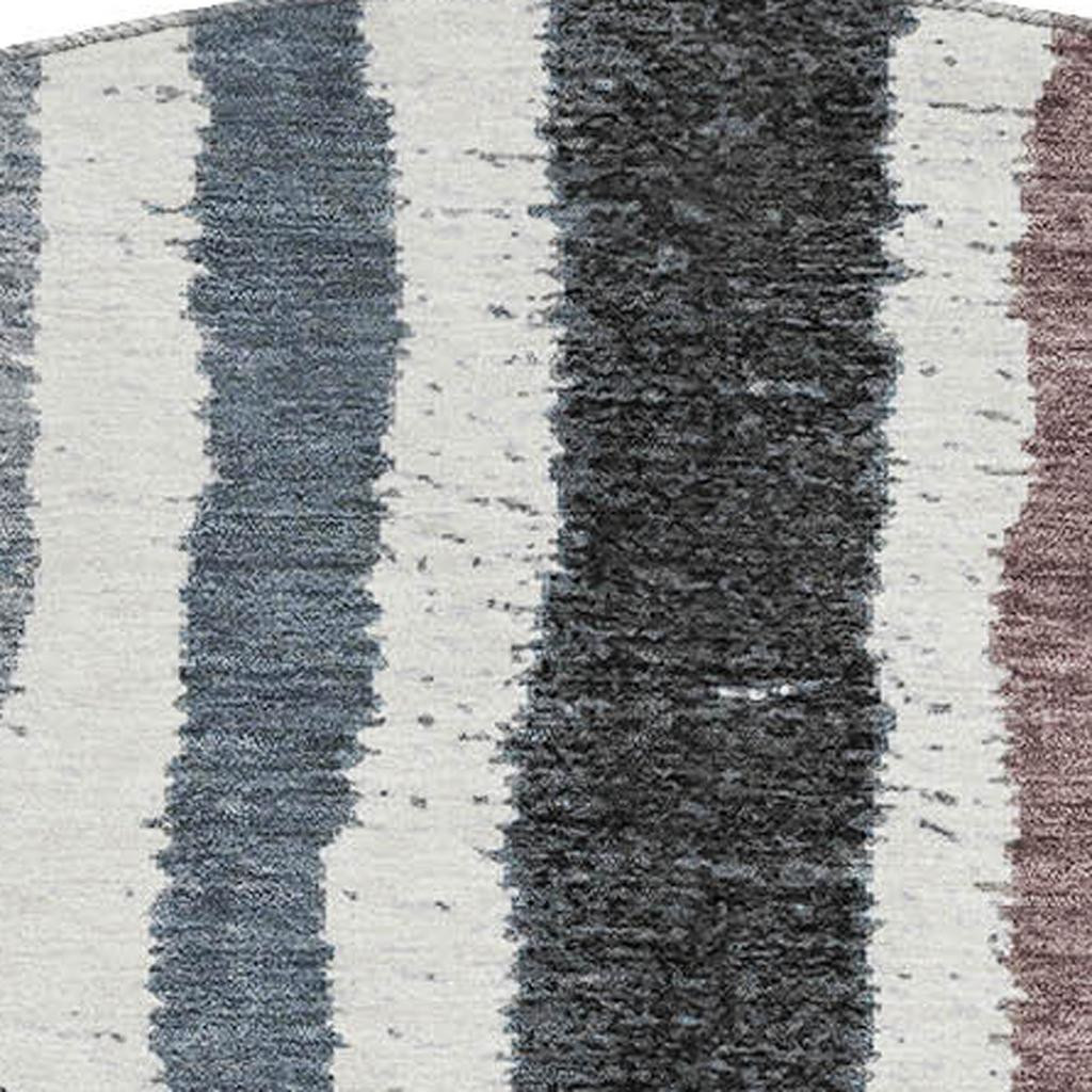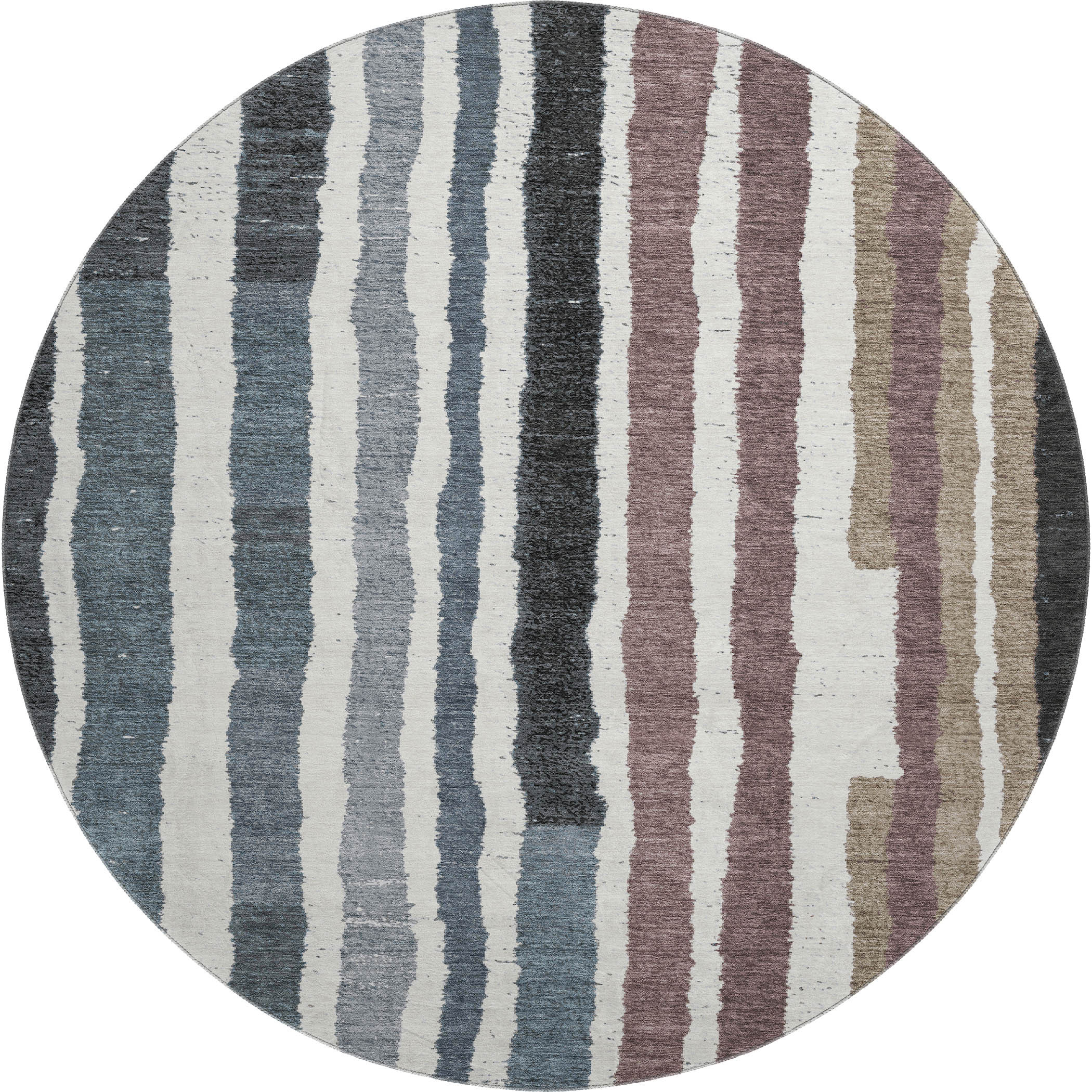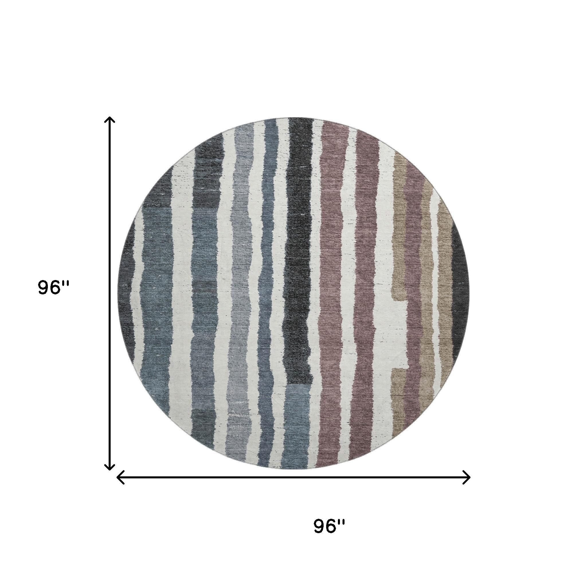 Set an inviting tone in your space with this 8-foot denim blue ivory and taupe striped washable round rug with uv protection. Ideal for spaces with kids and pets, this rug is stain resistant to help repel dirt and spilled liquids. Built to last, this rug crafted from polyester fibers is known for its durability and long lasting appeal. Rugs are a great way to showcase your style, hide imperfections, warm your home and reduce noise. This larger sized, transitional styled rug is ready to create a focal point or statement piece in your room. 96.00-inch h x 96.00-inch w x 0.39-inch d.