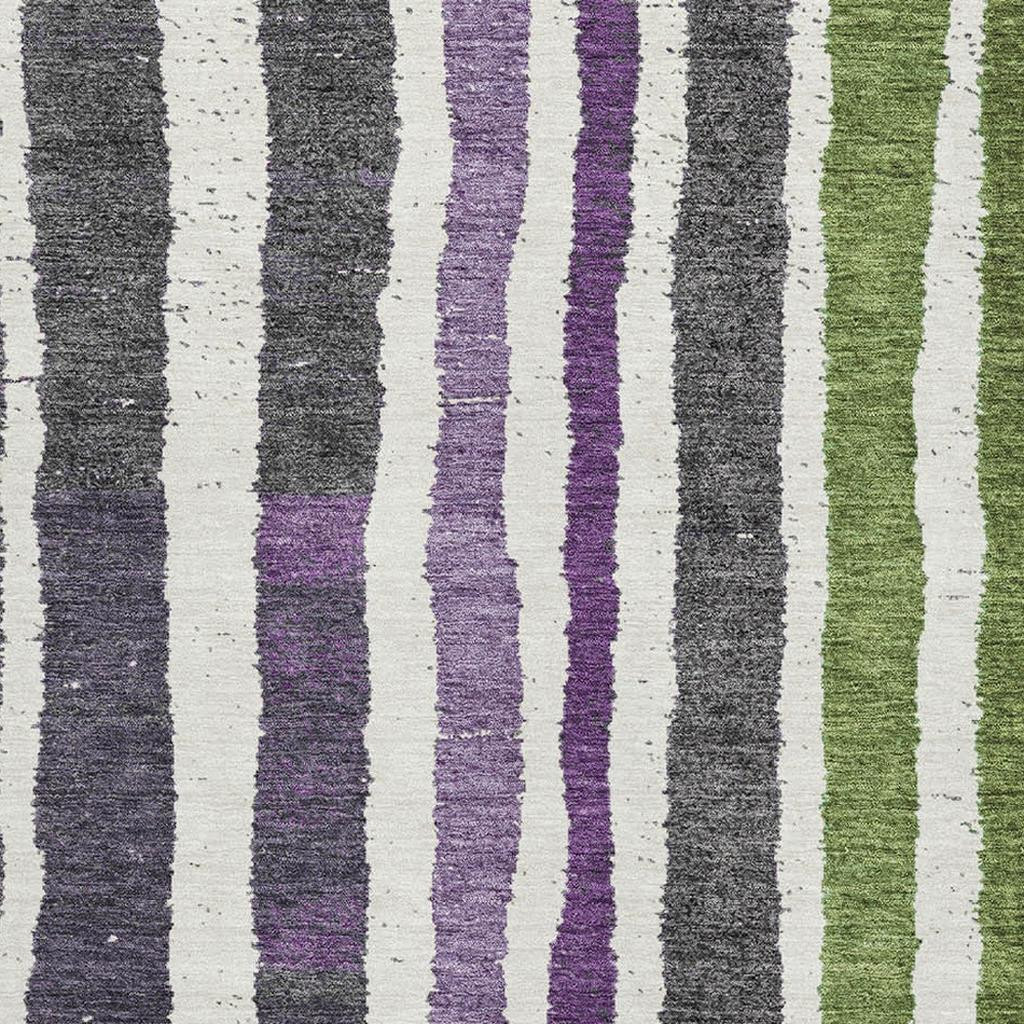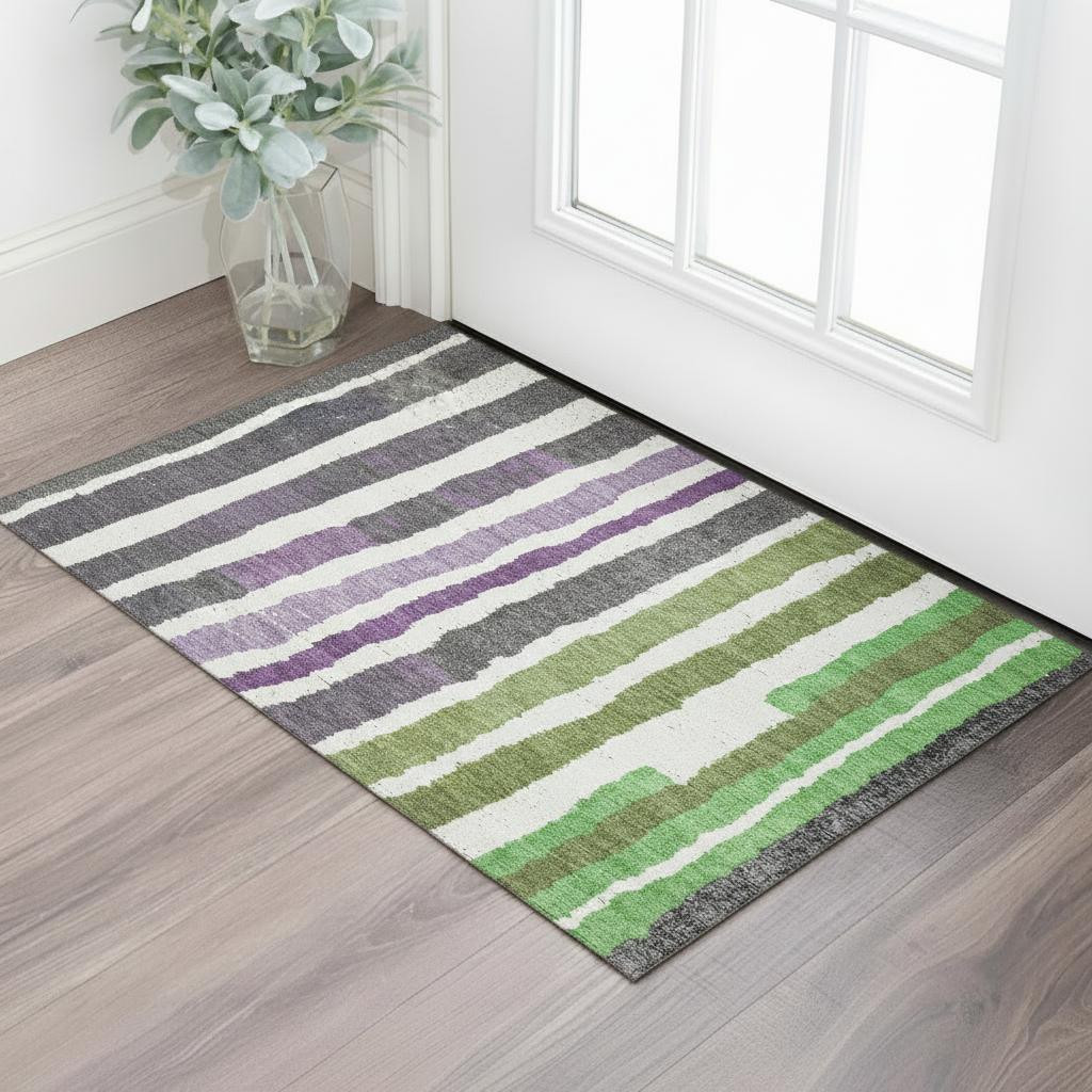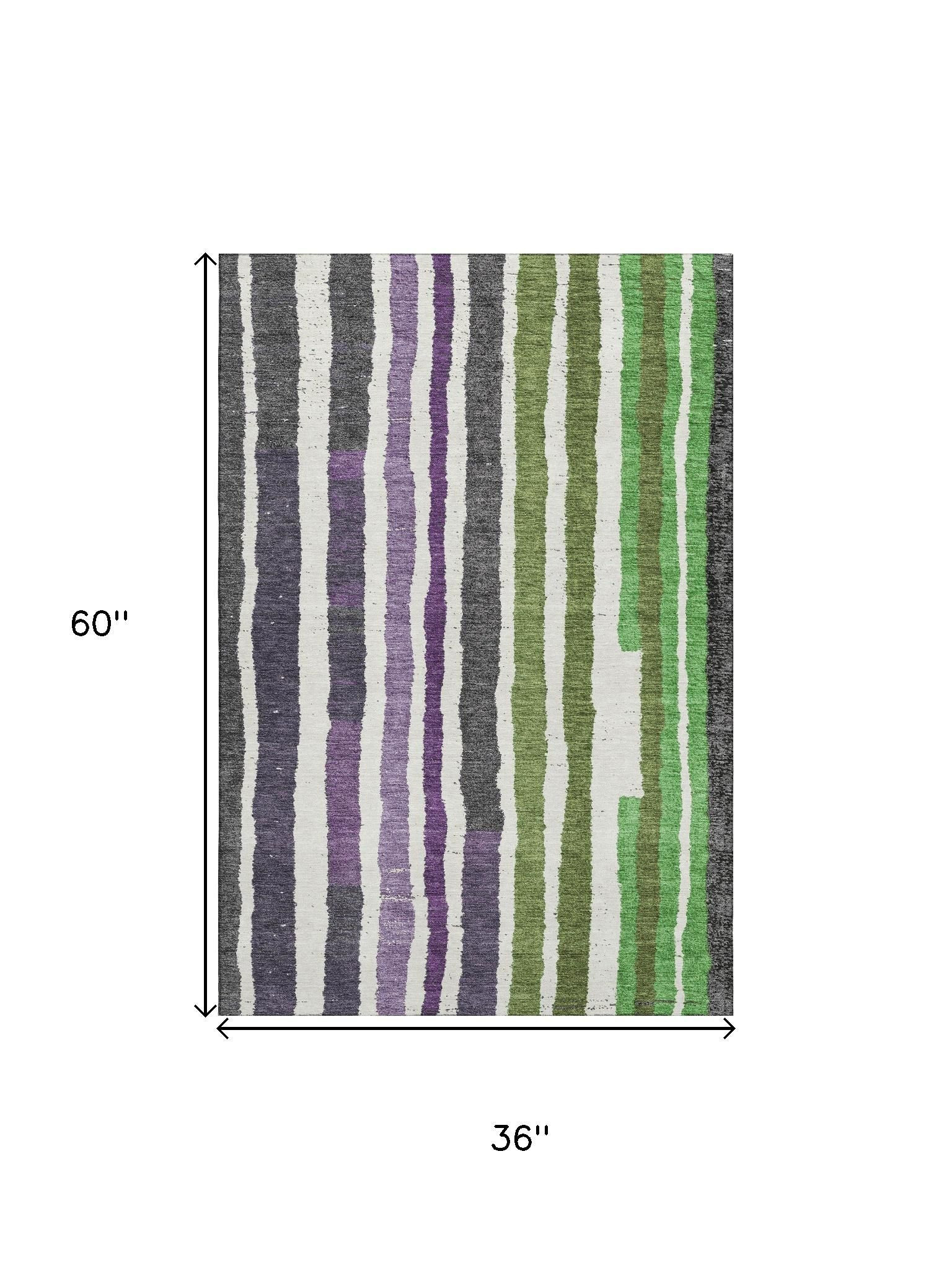 Add great coloration and comfortable texture to your space with this 3-foot x 5-foot gray purple and green striped washable area rug with uv protection. Ideal for spaces with kids and pets, this rug is stain resistant to help repel dirt and spilled liquids. Built to last, this rug crafted from polyester fibers is known for its durability and long lasting appeal. Rugs are a great way to showcase your style, hide imperfections, warm your home and reduce noise. This smaller sized, transitional styled rug is just what you need for your walkway, bedside, in front of door, cabinet, refrigerator, or chair. 36.00-inch h x 60.00-inch w x 0.39-inch d.