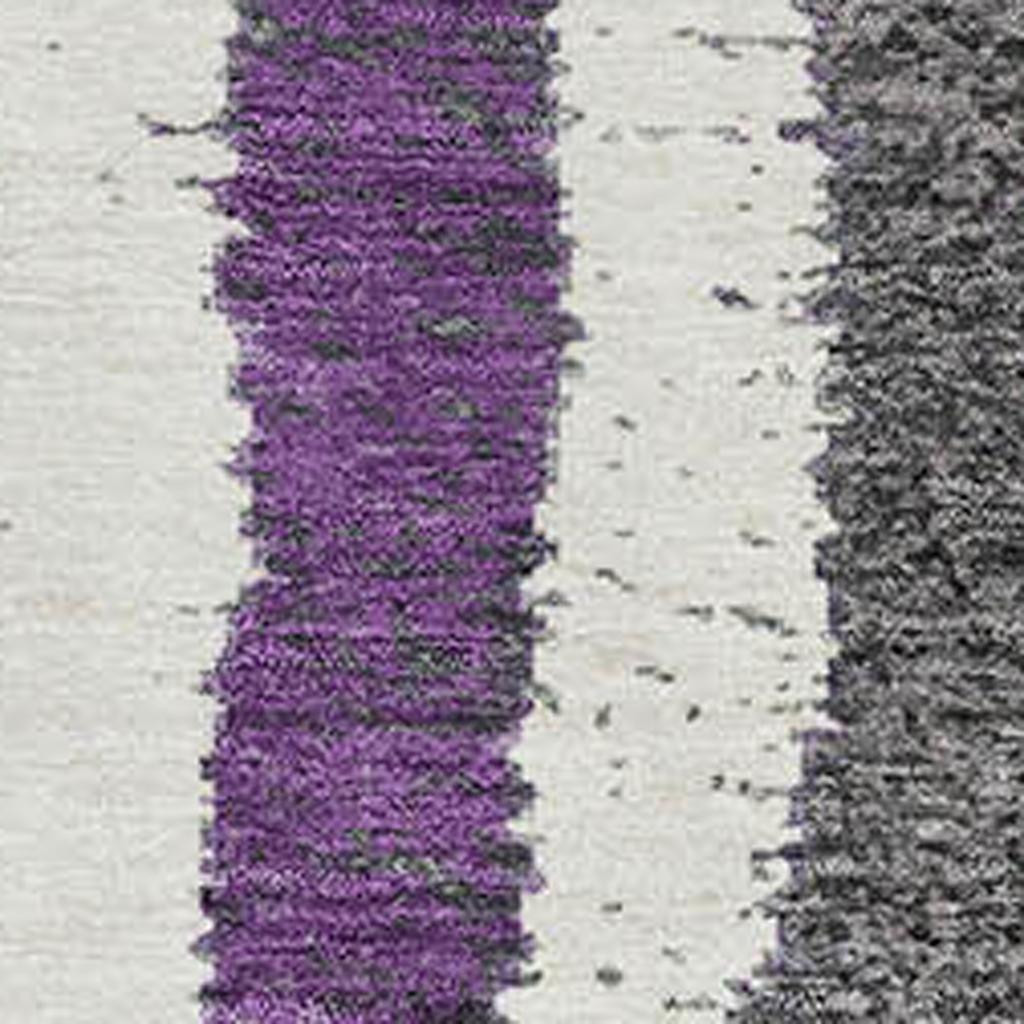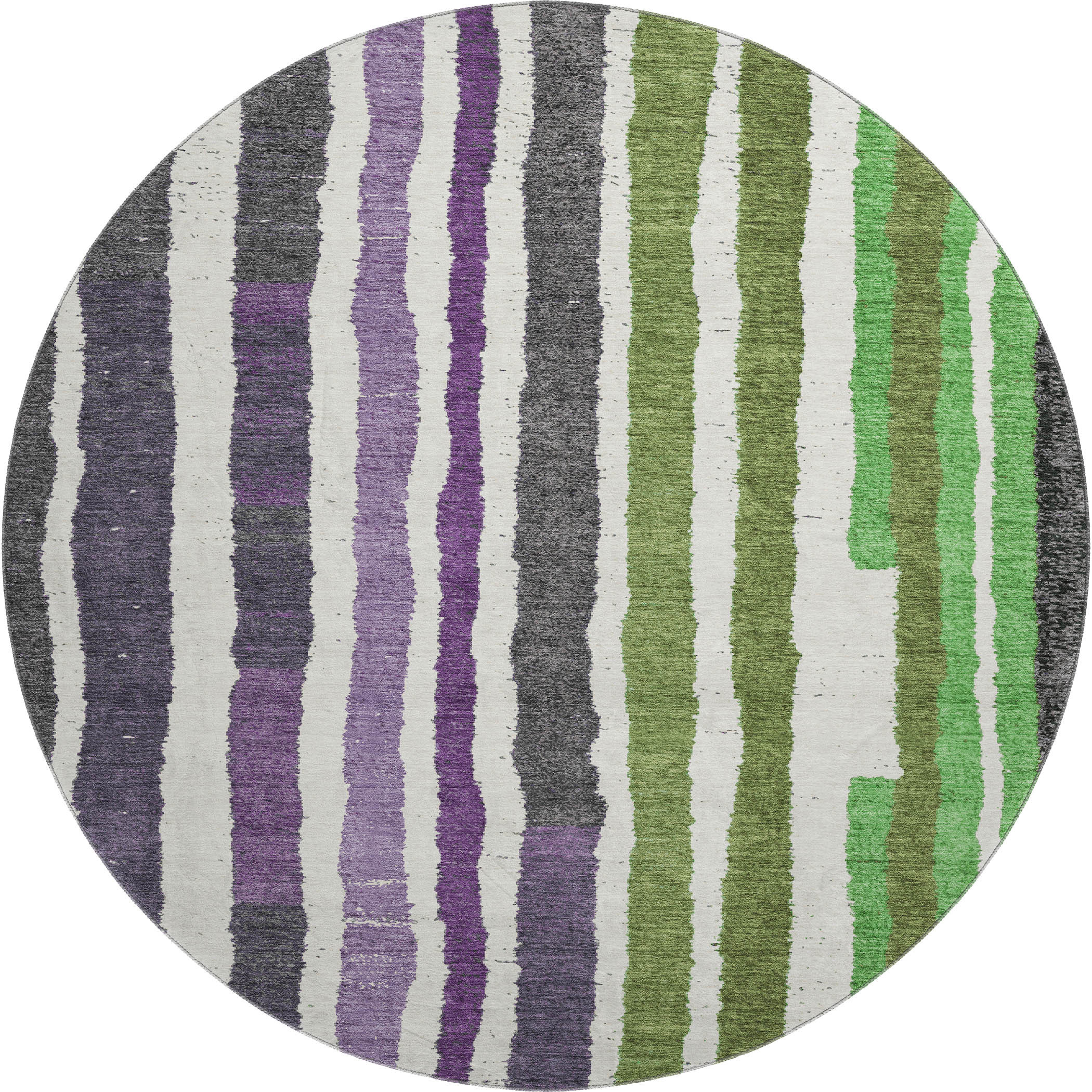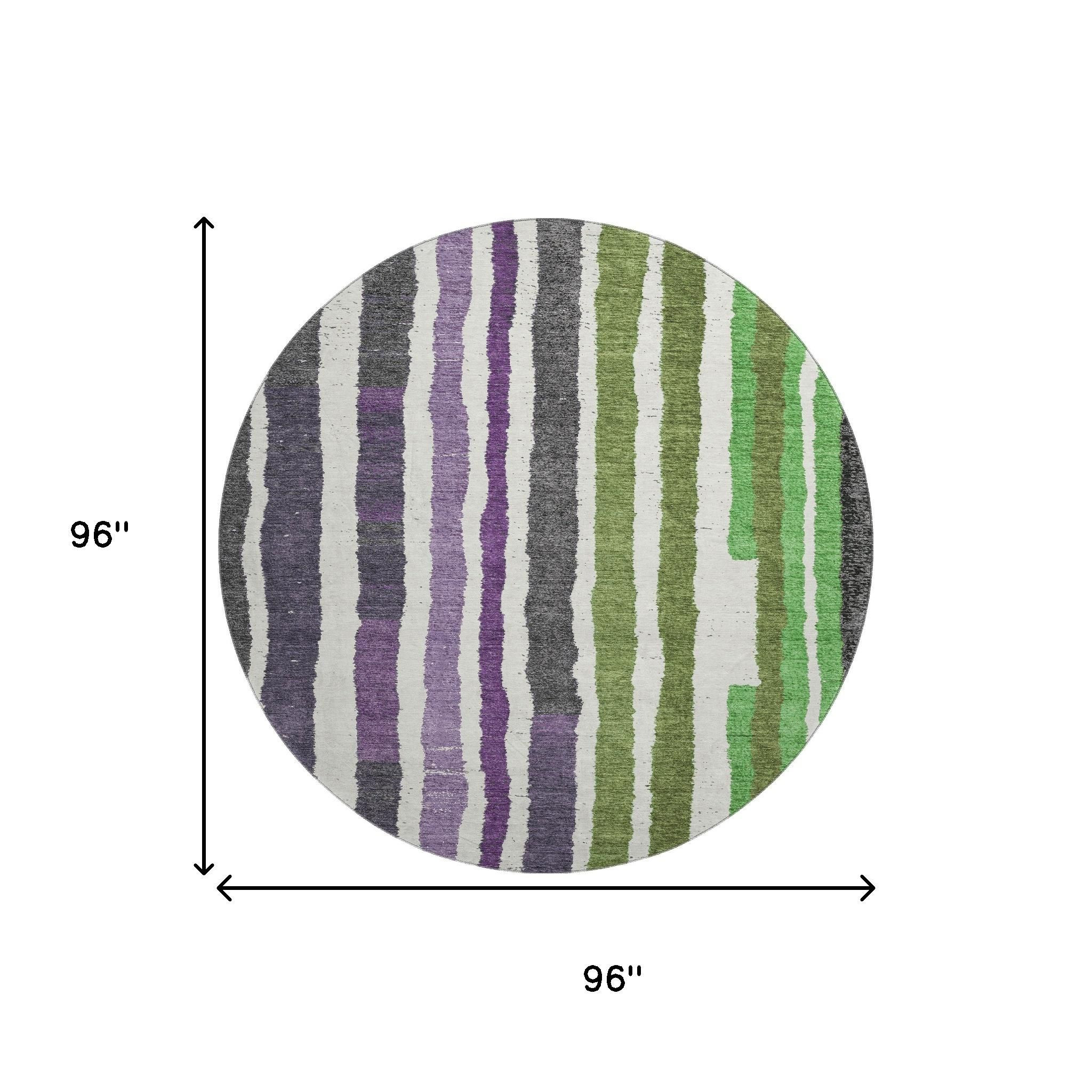 Set an inviting tone in your space with this 8-foot gray purple and green striped washable round rug with uv protection. Ideal for spaces with kids and pets, this rug is stain resistant to help repel dirt and spilled liquids. Built to last, this rug crafted from polyester fibers is known for its durability and long lasting appeal. Rugs are a great way to showcase your style, hide imperfections, warm your home and reduce noise. This larger sized, transitional styled rug is ready to create a focal point or statement piece in your room. 96.00-inch h x 96.00-inch w x 0.39-inch d.
