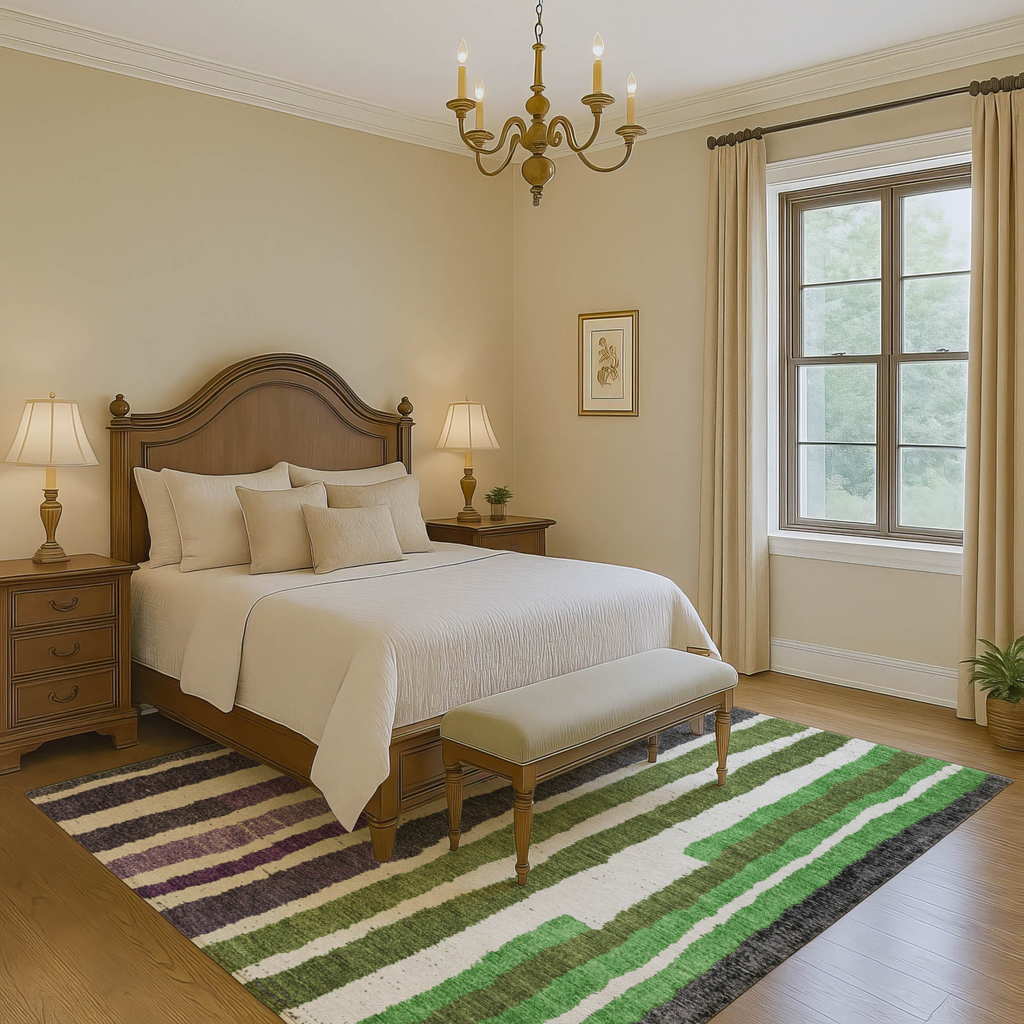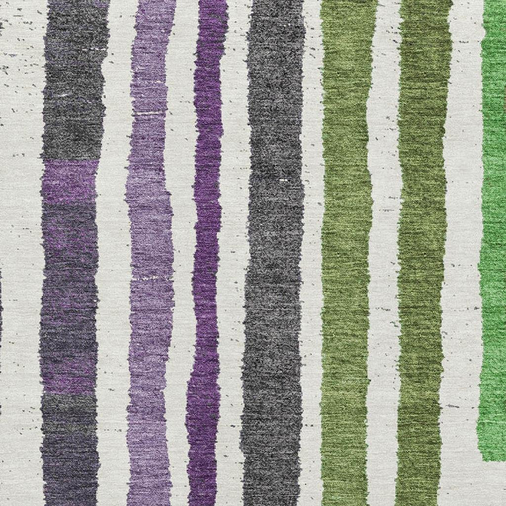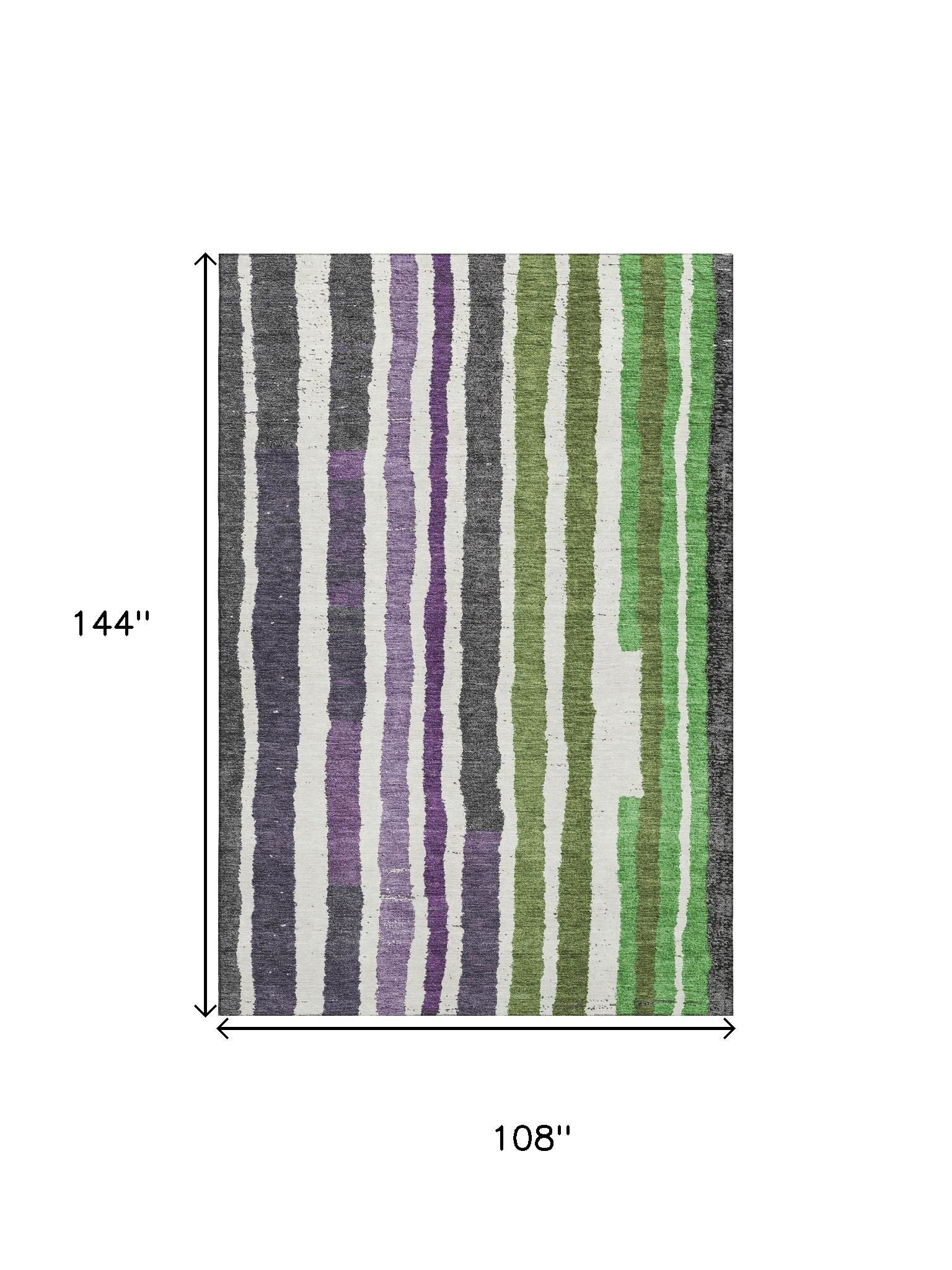 Set an inviting tone in your space with this 9-foot x 12-foot gray purple and green striped washable area rug with uv protection. Ideal for spaces with kids and pets, this rug is stain resistant to help repel dirt and spilled liquids. Built to last, this rug crafted from polyester fibers is known for its durability and long lasting appeal. Rugs are a great way to showcase your style, hide imperfections, warm your home and reduce noise. This larger sized, transitional styled rug is ready to create a focal point or statement piece in your room. 108.00-inch h x 144.00-inch w x 0.39-inch d.