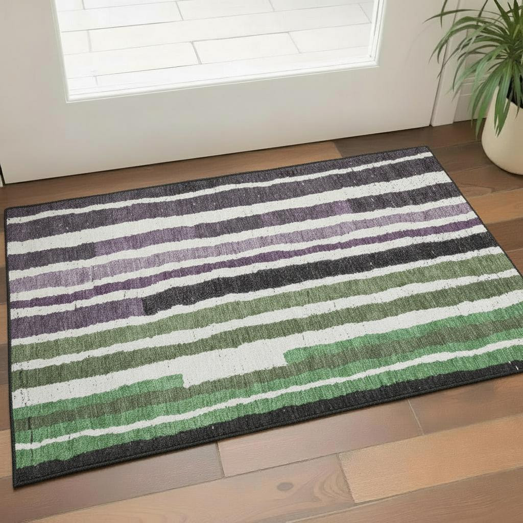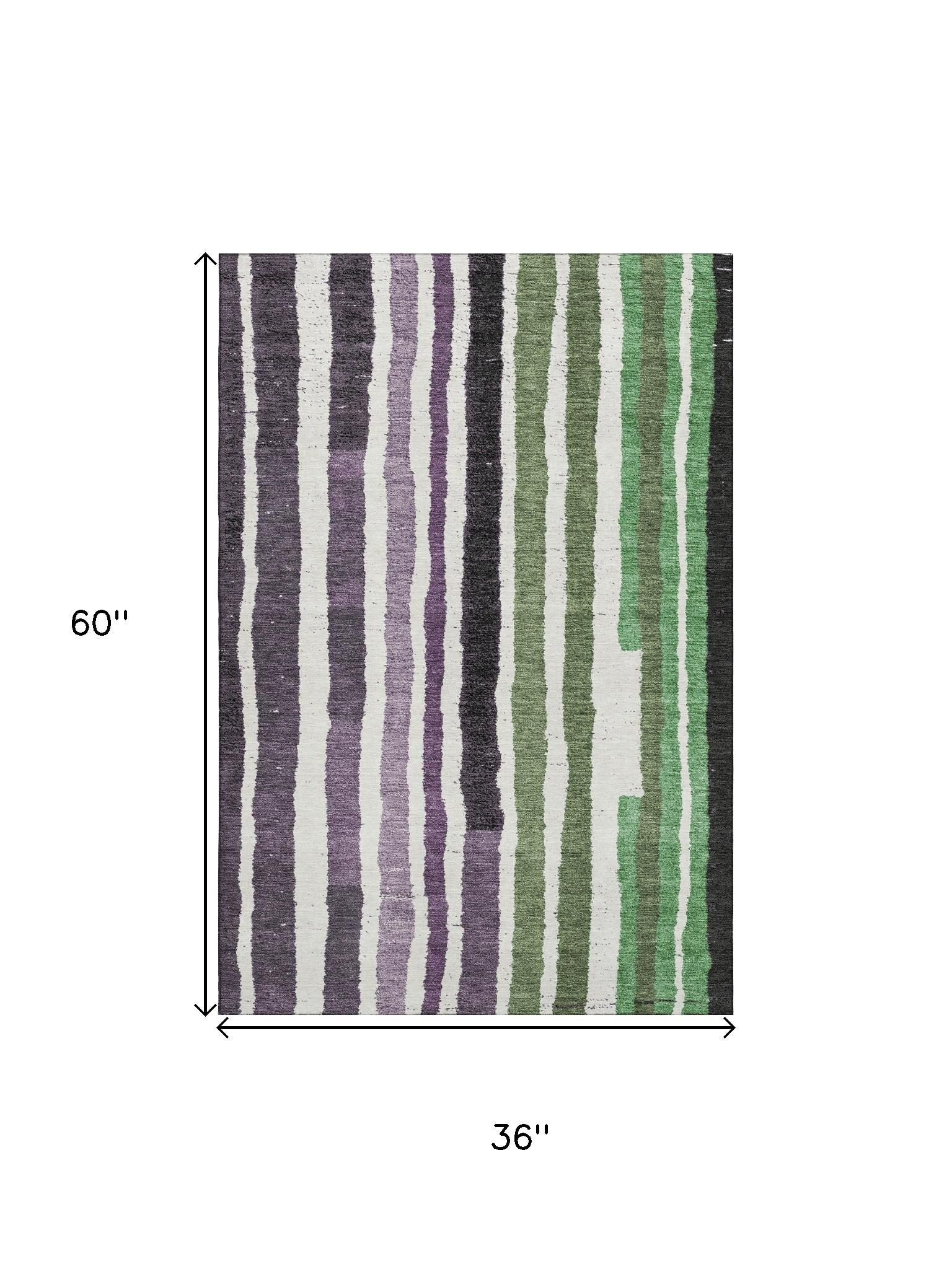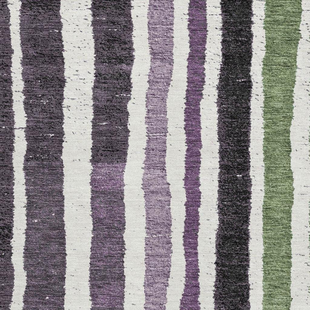 Add some artistry to your room with this 3-foot x 5-foot purple green and ivory striped washable area rug with uv protection. Ideal for spaces with kids and pets, this rug is stain resistant to help repel dirt and spilled liquids. Built to last, this rug crafted from polyester fibers is known for its durability and long lasting appeal. Rugs are a great way to showcase your style, hide imperfections, warm your home and reduce noise. This smaller sized, transitional styled rug is just what you need for your walkway, bedside, in front of door, cabinet, refrigerator, or chair. 36.00-inch h x 60.00-inch w x 0.39-inch d.