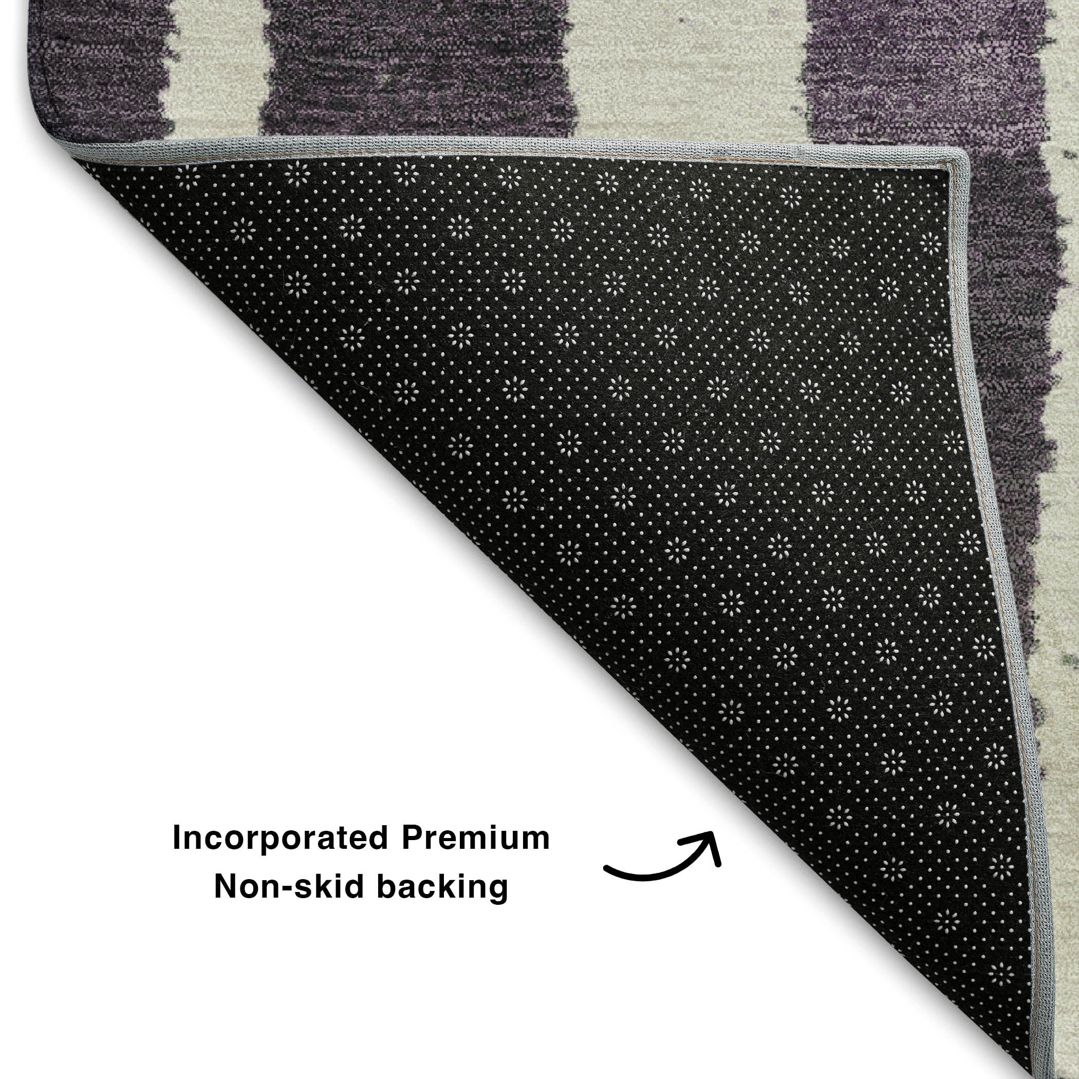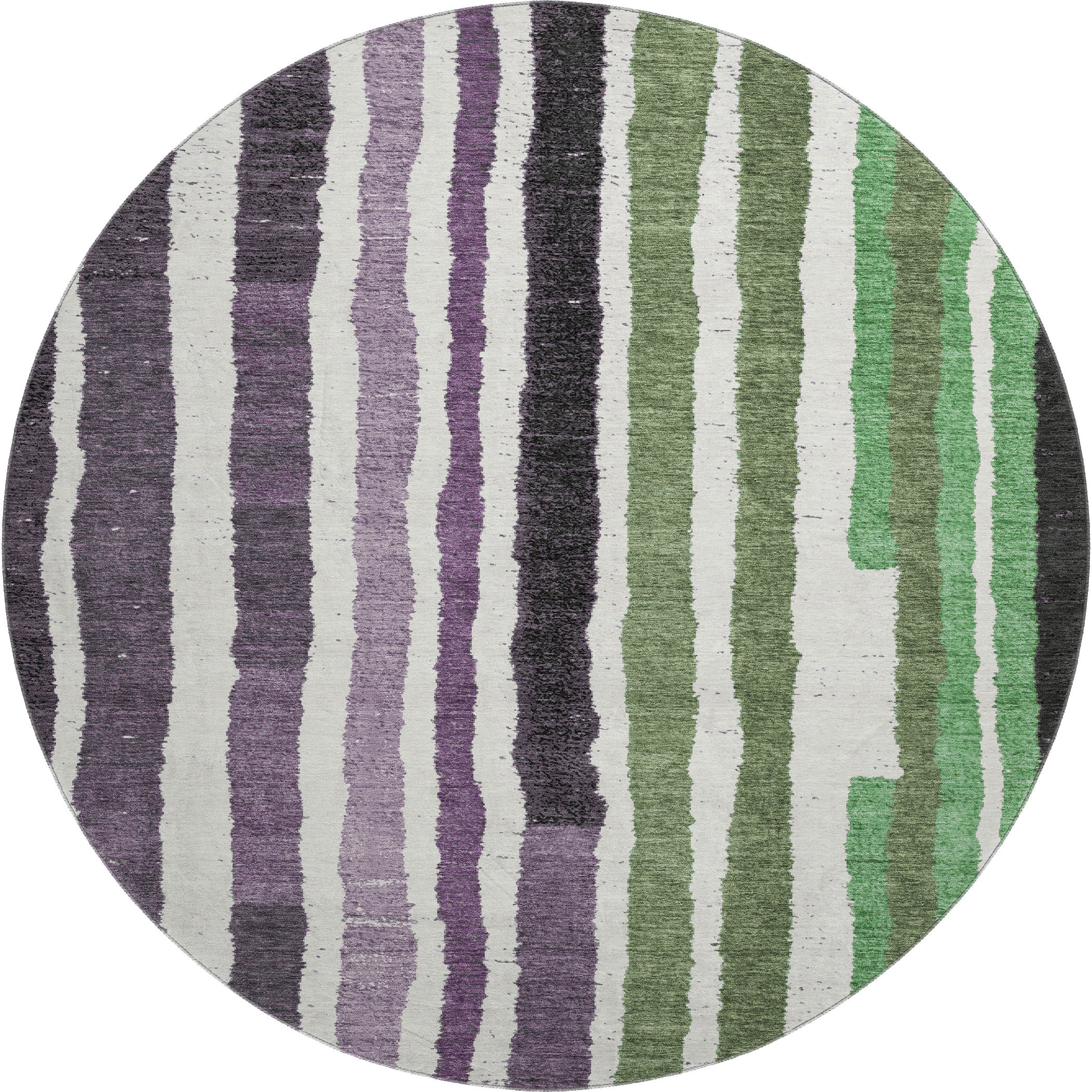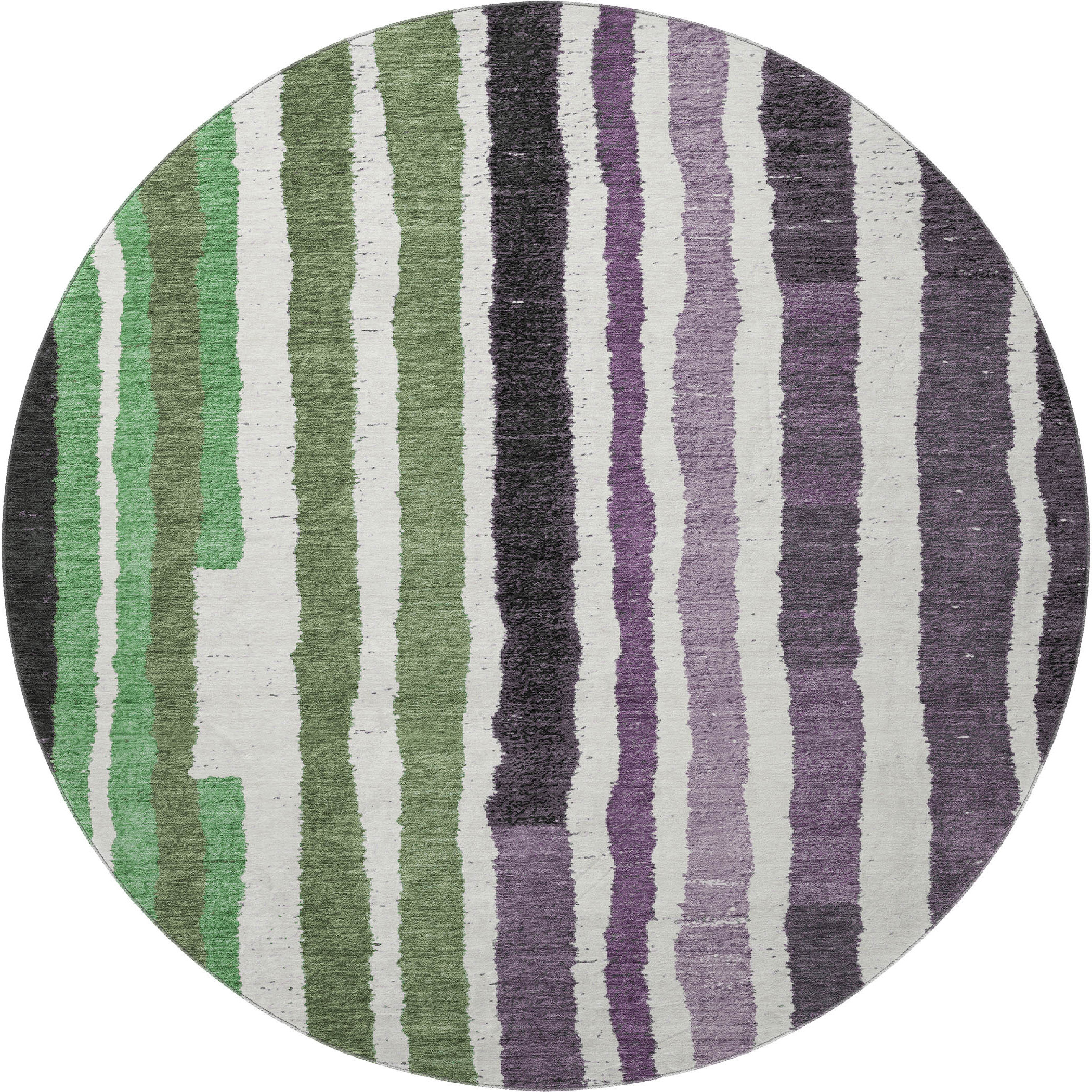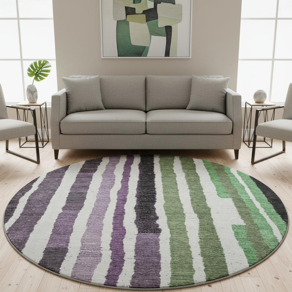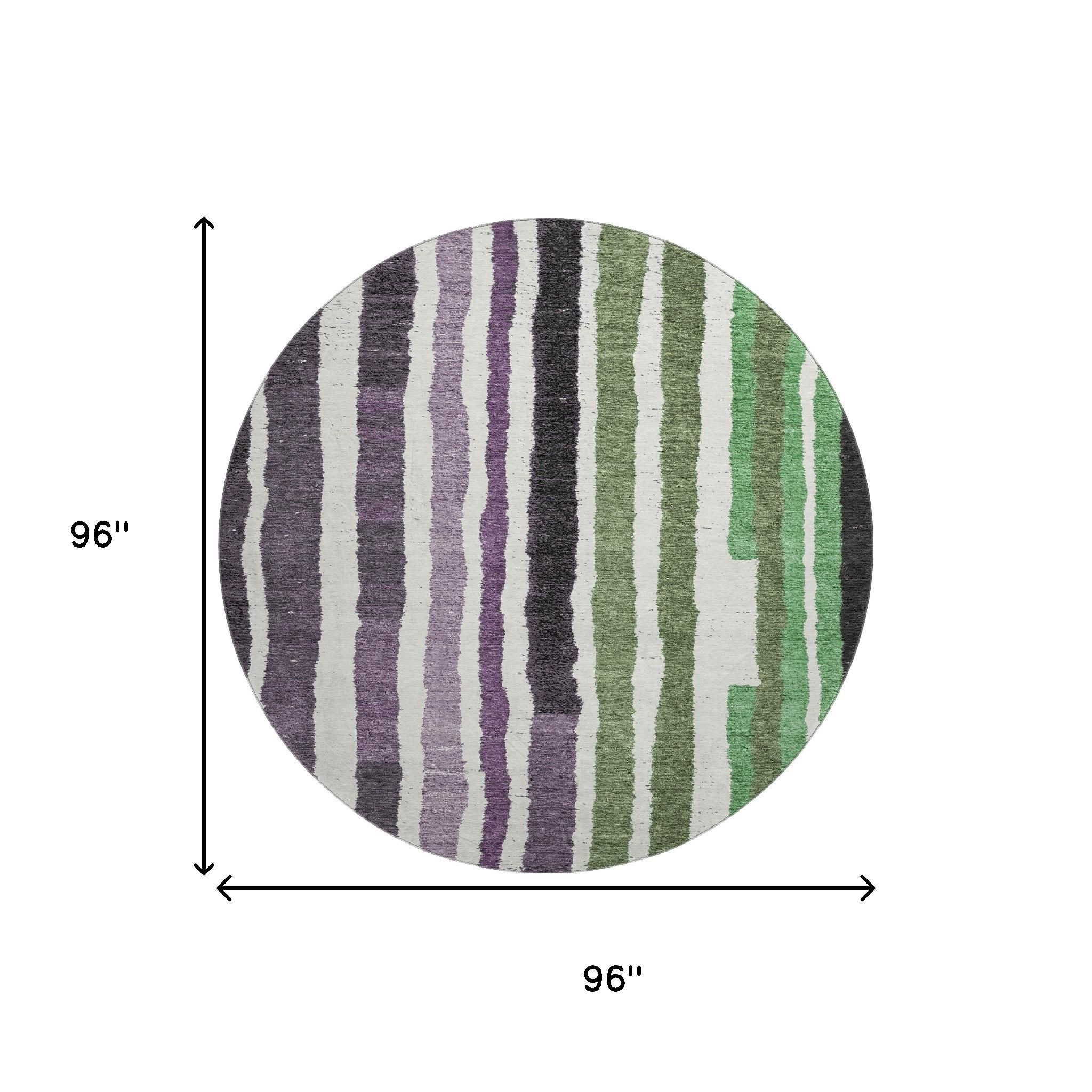 Add great coloration and comfortable texture to your space with this 8-foot purple green and ivory striped washable round rug with uv protection. Ideal for spaces with kids and pets, this rug is stain resistant to help repel dirt and spilled liquids. Built to last, this rug crafted from polyester fibers is known for its durability and long lasting appeal. Rugs are a great way to showcase your style, hide imperfections, warm your home and reduce noise. This larger sized, transitional styled rug is ready to create a focal point or statement piece in your room. 96.00-inch h x 96.00-inch w x 0.39-inch d.