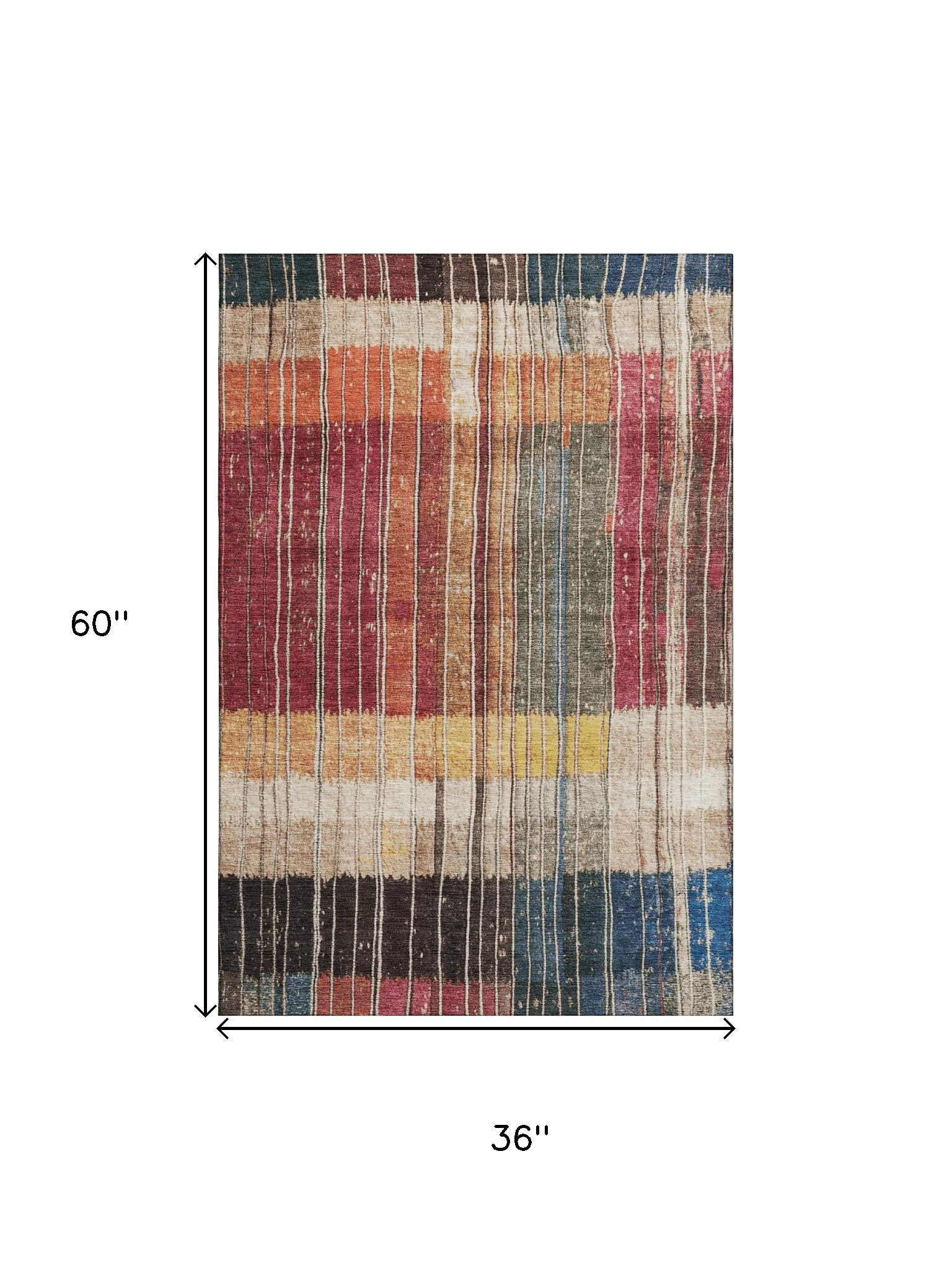 This 3-foot x 5-foot beige red and blue striped washable area rug with uv protection, is a great way to add warmth to a room. Ideal for spaces with kids and pets, this rug is stain resistant to help repel dirt and spilled liquids. Built to last, this rug crafted from polyester fibers is known for its durability and long lasting appeal. Rugs are a great way to showcase your style, hide imperfections, warm your home and reduce noise. This smaller sized, transitional styled rug is just what you need for your walkway, bedside, in front of door, cabinet, refrigerator, or chair. 36.00-inch h x 60.00-inch w x 0.39-inch d.