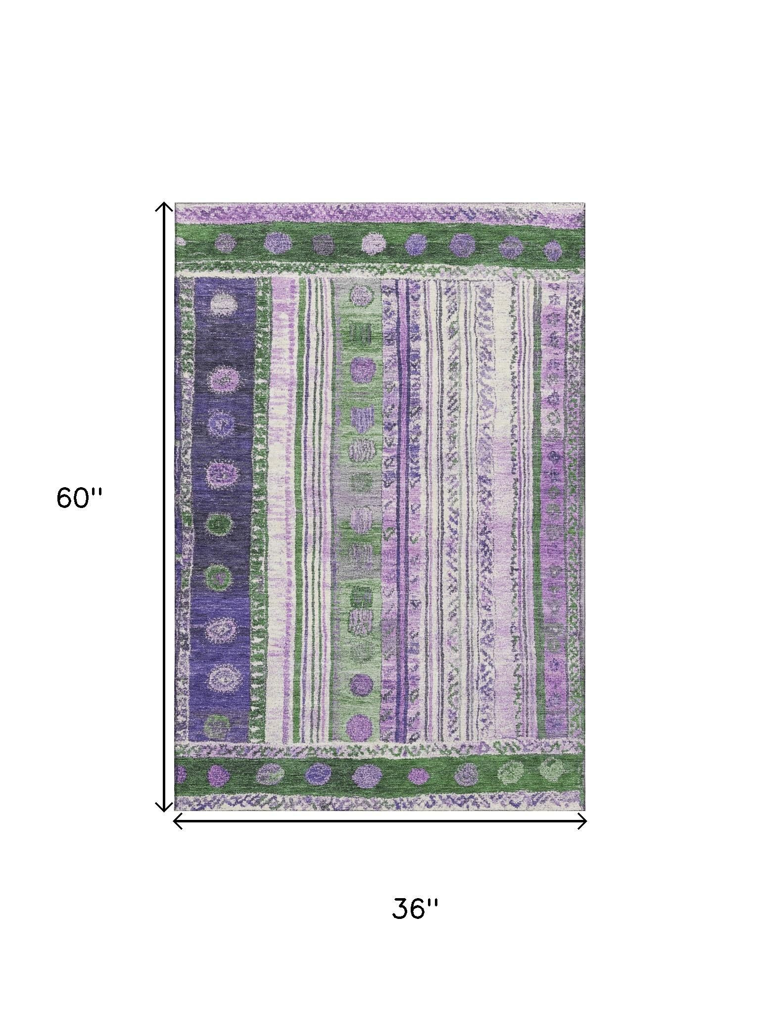 Set an inviting tone in your space with this 3-foot x 5-foot green purple and ivory striped washable area rug with uv protection. Ideal for spaces with kids and pets, this rug is stain resistant to help repel dirt and spilled liquids. Built to last, this rug crafted from polyester fibers is known for its durability and long lasting appeal. Rugs are a great way to showcase your style, hide imperfections, warm your home and reduce noise. This smaller sized, transitional styled rug is just what you need for your walkway, bedside, in front of door, cabinet, refrigerator, or chair. 36.00-inch h x 60.00-inch w x 0.39-inch d.