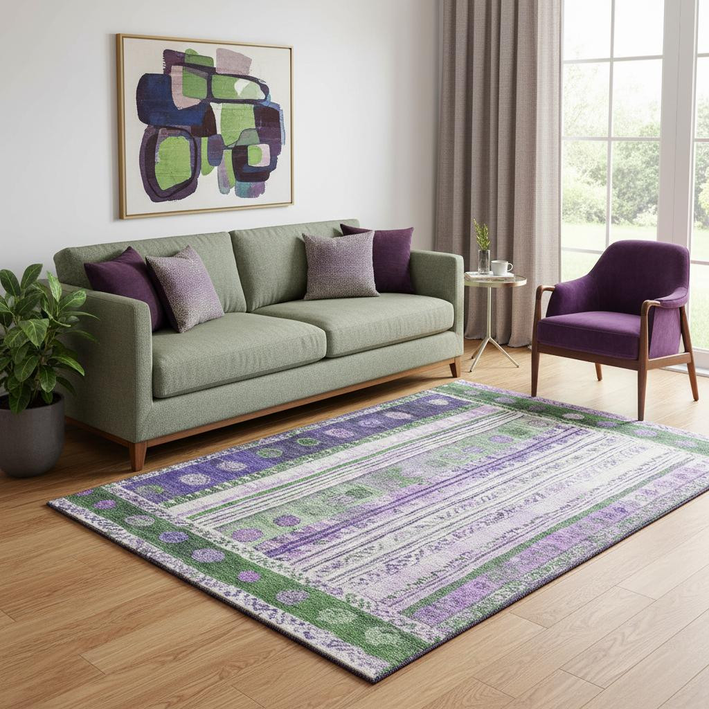 Add some artistry to your room with this 5-foot x 8-foot green purple and ivory striped washable area rug with uv protection. Ideal for spaces with kids and pets, this rug is stain resistant to help repel dirt and spilled liquids. Built to last, this rug crafted from polyester fibers is known for its durability and long lasting appeal. Rugs are a great way to showcase your style, hide imperfections, warm your home and reduce noise. This larger sized, transitional styled rug is ready to create a focal point or statement piece in your room. 60.00-inch h x 90.00-inch w x 0.39-inch d.