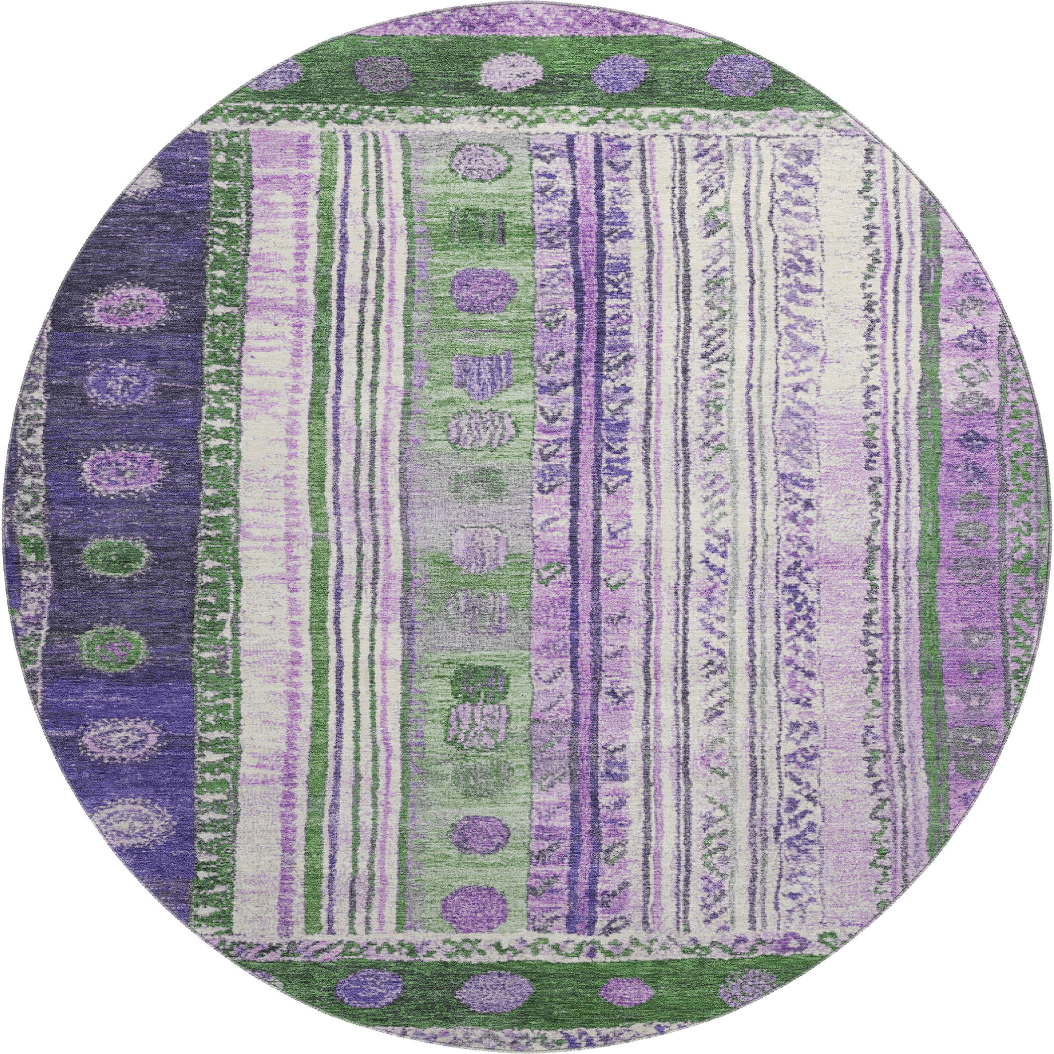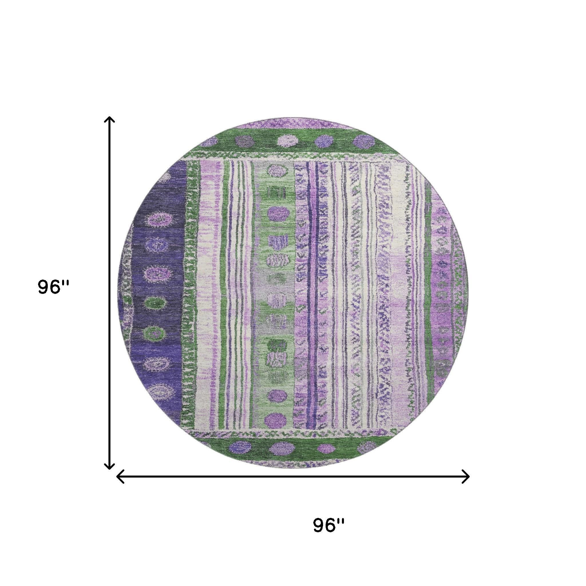 Add some artistry to your room with this 8-foot green purple and ivory striped washable round rug with uv protection. Ideal for spaces with kids and pets, this rug is stain resistant to help repel dirt and spilled liquids. Built to last, this rug crafted from polyester fibers is known for its durability and long lasting appeal. Rugs are a great way to showcase your style, hide imperfections, warm your home and reduce noise. This larger sized, transitional styled rug is ready to create a focal point or statement piece in your room. 96.00-inch h x 96.00-inch w x 0.39-inch d.