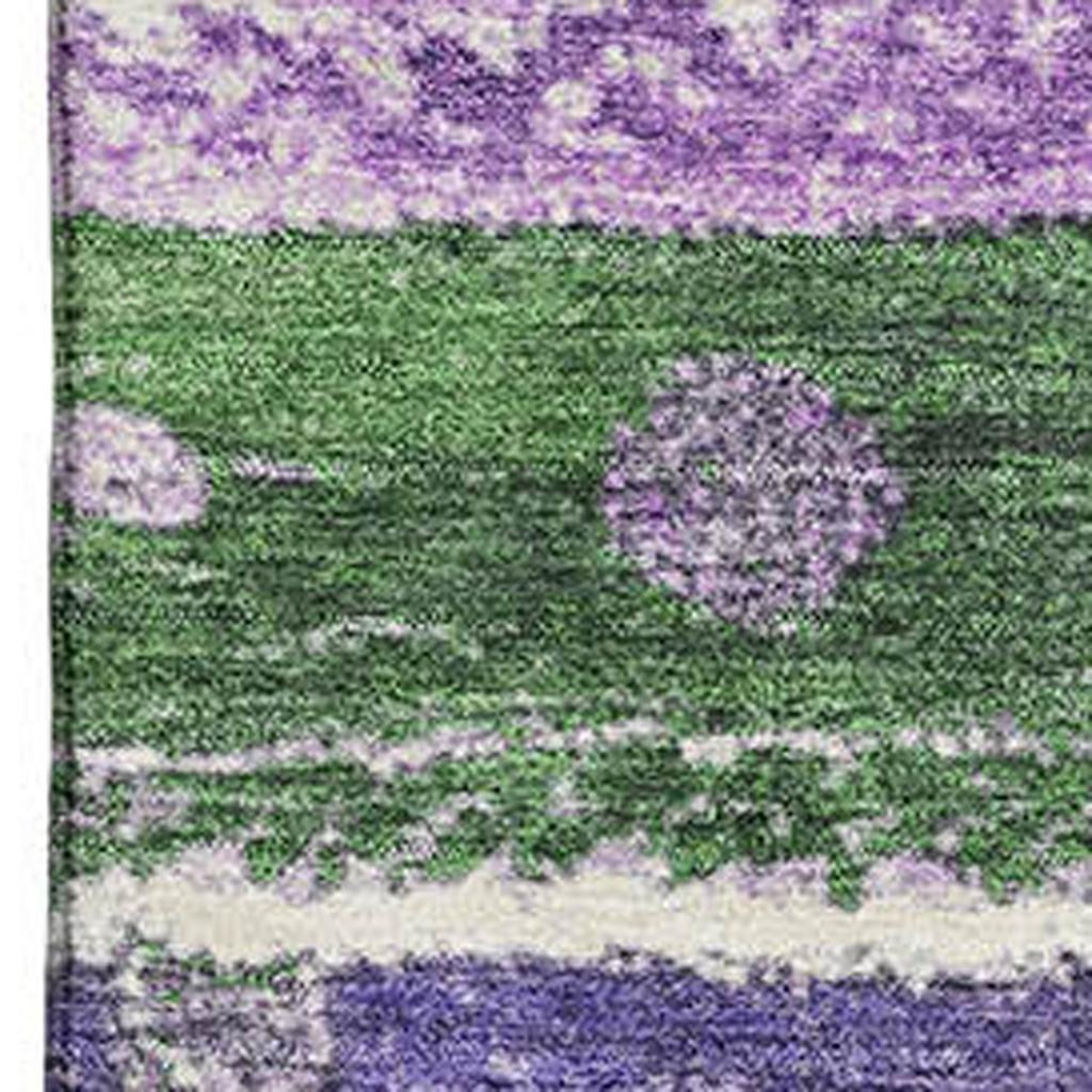 This 8-foot x 10-foot green purple and ivory striped washable area rug with uv protection, is a great way to add warmth to a room. Ideal for spaces with kids and pets, this rug is stain resistant to help repel dirt and spilled liquids. Built to last, this rug crafted from polyester fibers is known for its durability and long lasting appeal. Rugs are a great way to showcase your style, hide imperfections, warm your home and reduce noise. This larger sized, transitional styled rug is ready to create a focal point or statement piece in your room. 96.00-inch h x 120.00-inch w x 0.39-inch d.
