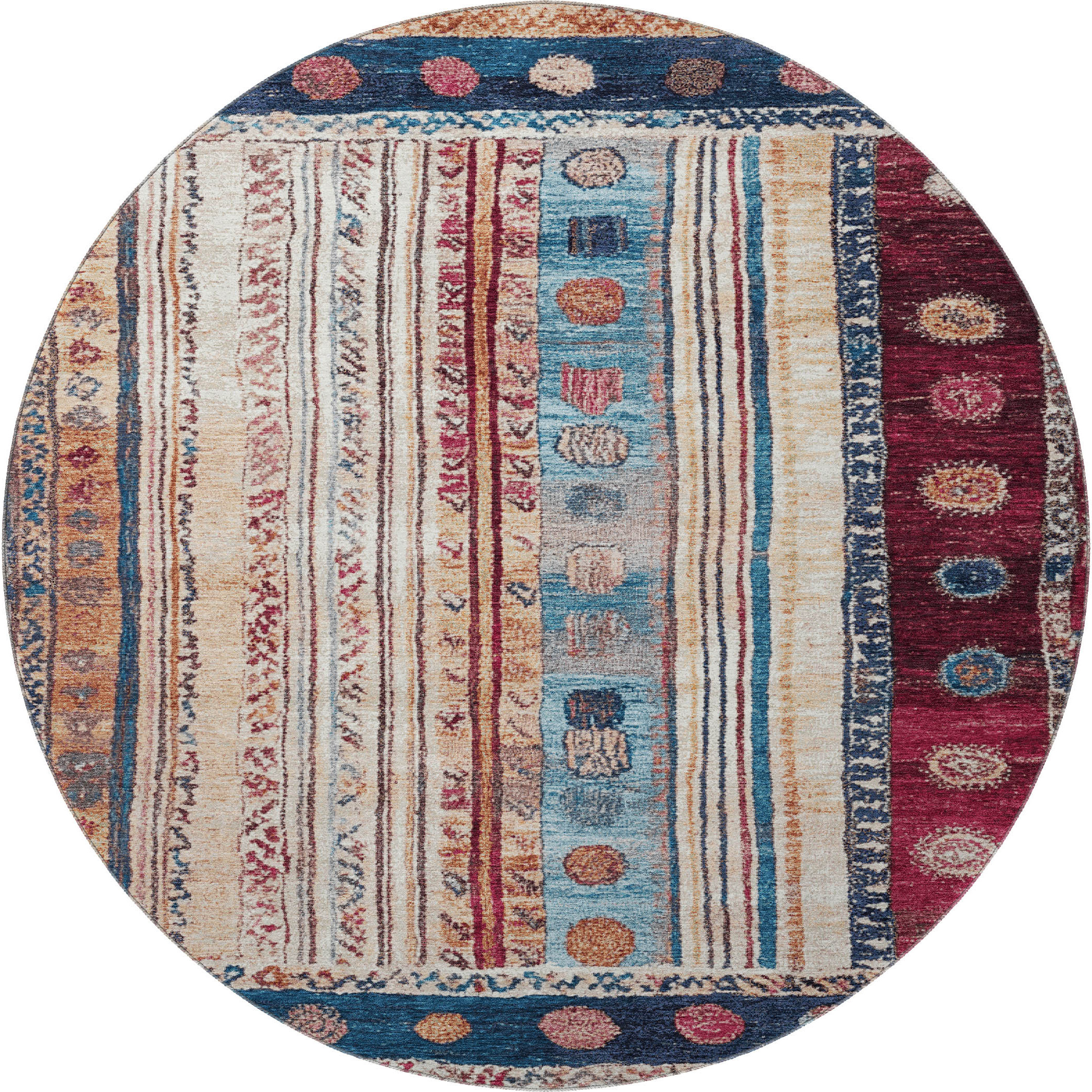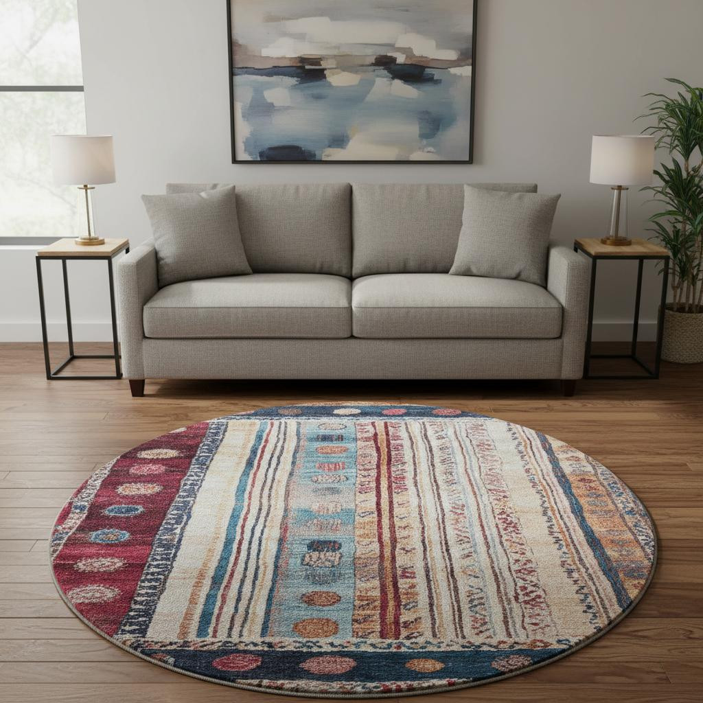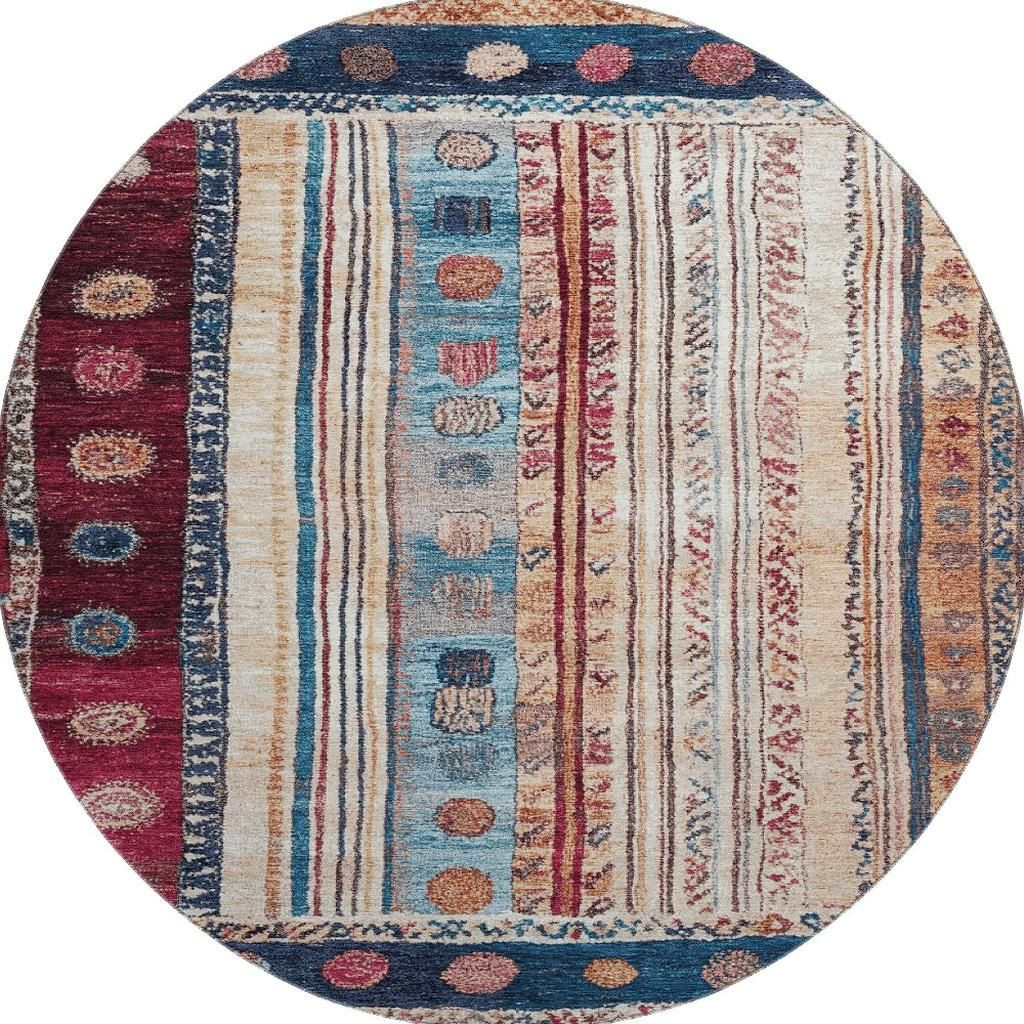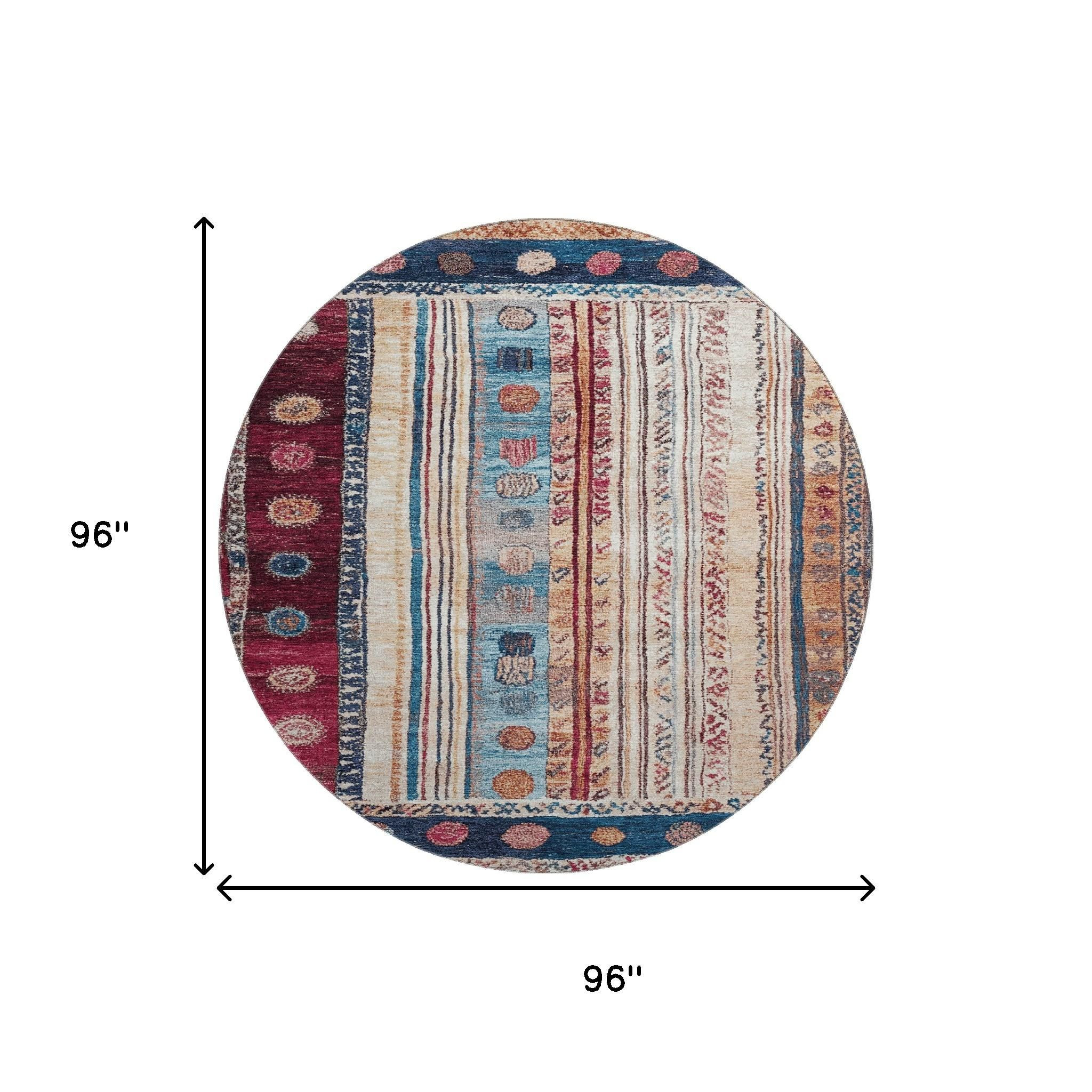 Set an inviting tone in your space with this 8-foot navy blue merlot and ivory striped washable round rug with uv protection. Ideal for spaces with kids and pets, this rug is stain resistant to help repel dirt and spilled liquids. Built to last, this rug crafted from polyester fibers is known for its durability and long lasting appeal. Rugs are a great way to showcase your style, hide imperfections, warm your home and reduce noise. This larger sized, transitional styled rug is ready to create a focal point or statement piece in your room. 96.00-inch h x 96.00-inch w x 0.39-inch d.