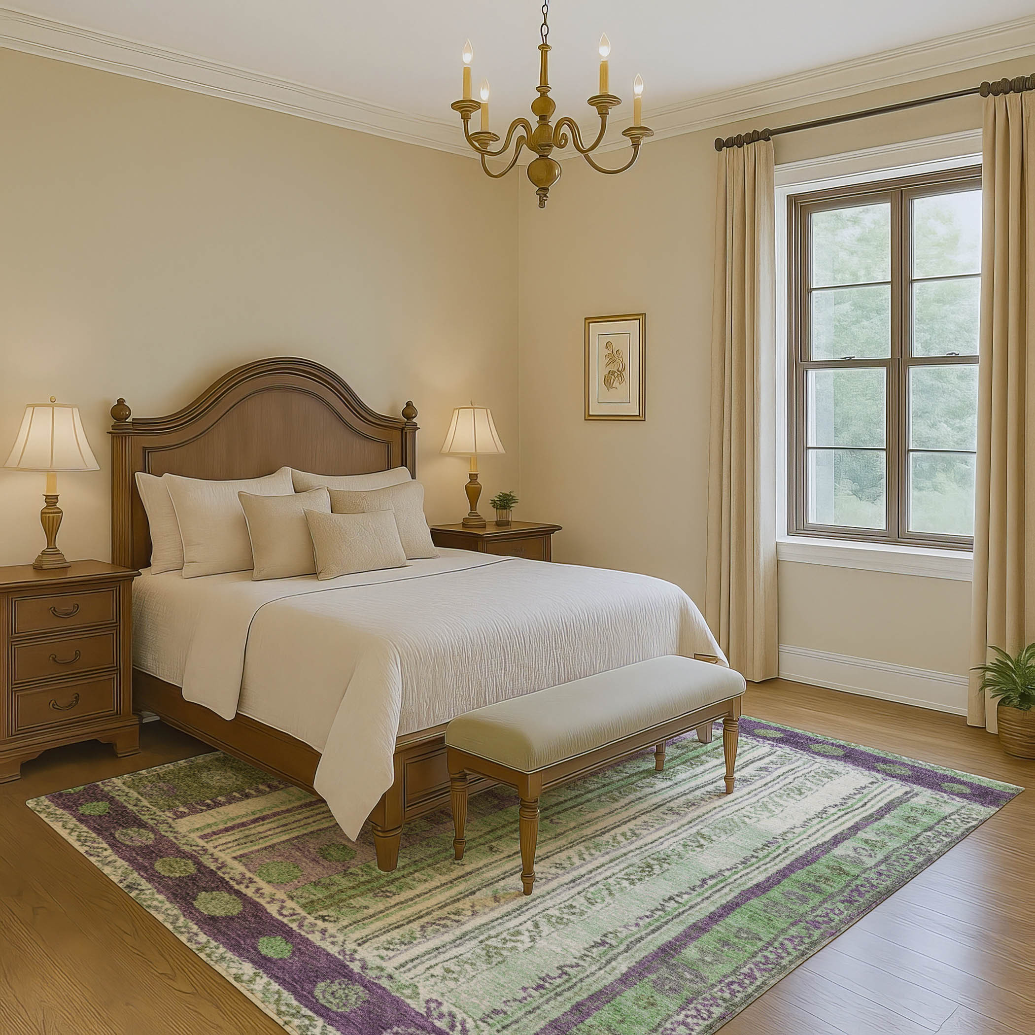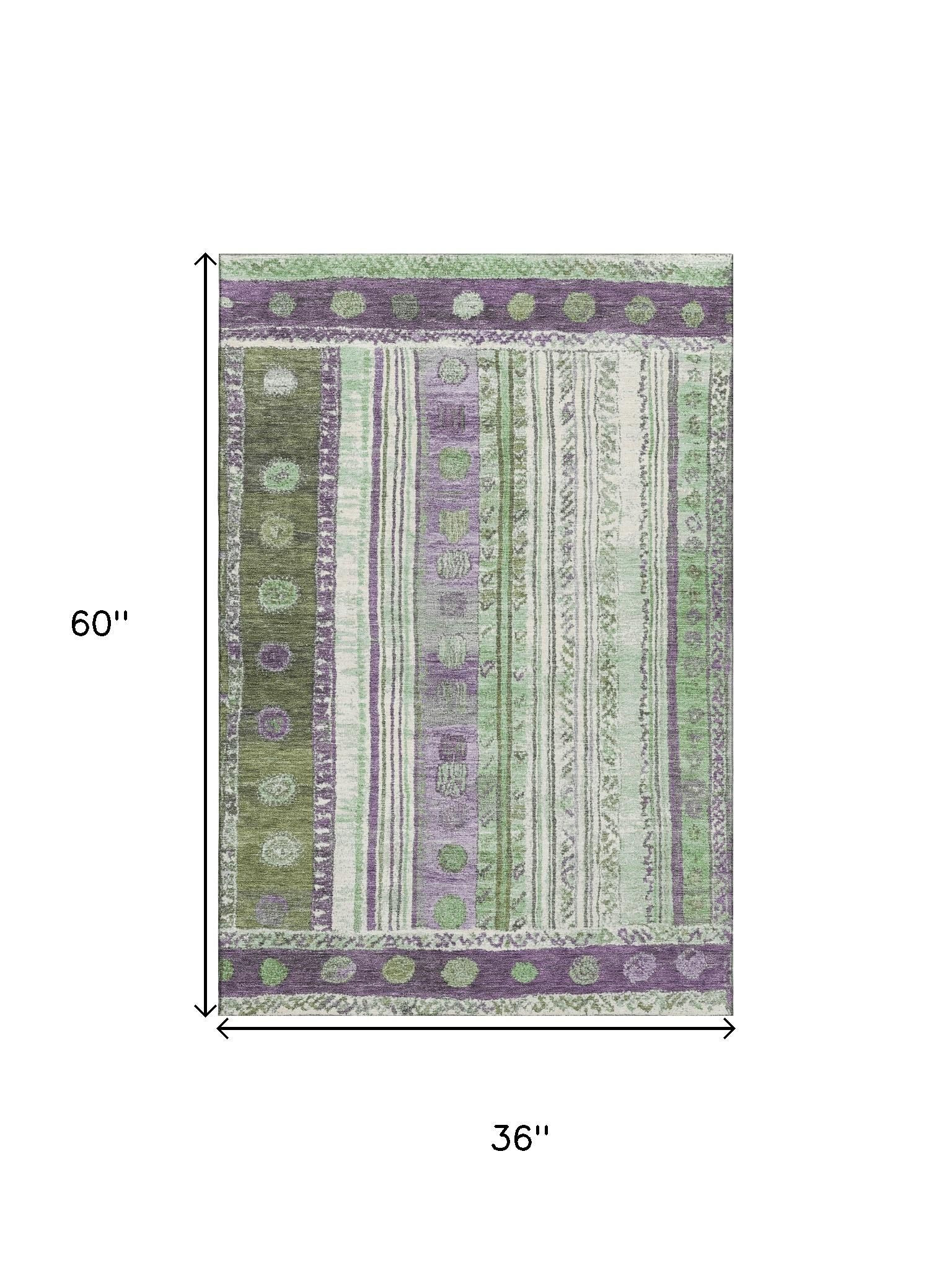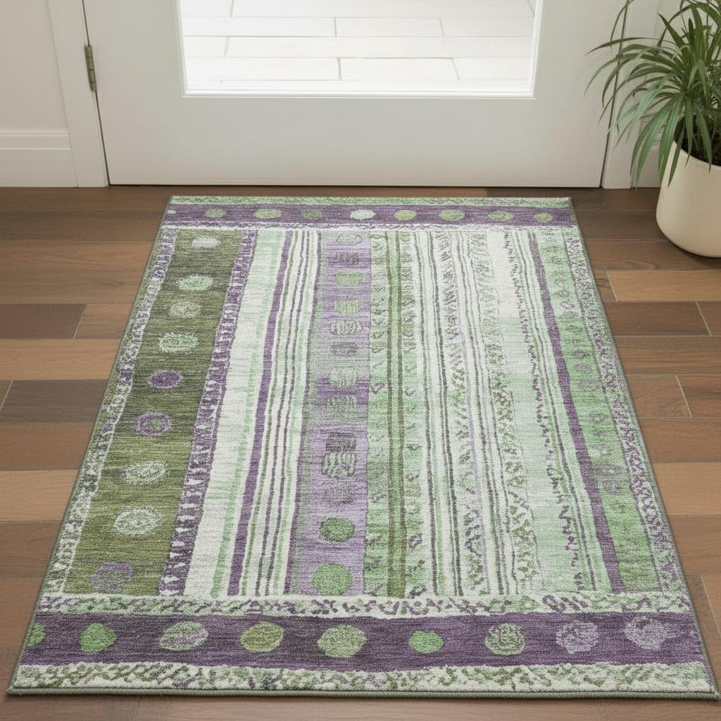 Set an inviting tone in your space with this 3-foot x 5-foot purple green and ivory striped washable area rug with uv protection. Ideal for spaces with kids and pets, this rug is stain resistant to help repel dirt and spilled liquids. Built to last, this rug crafted from polyester fibers is known for its durability and long lasting appeal. Rugs are a great way to showcase your style, hide imperfections, warm your home and reduce noise. This smaller sized, transitional styled rug is just what you need for your walkway, bedside, in front of door, cabinet, refrigerator, or chair. 36.00-inch h x 60.00-inch w x 0.39-inch d.