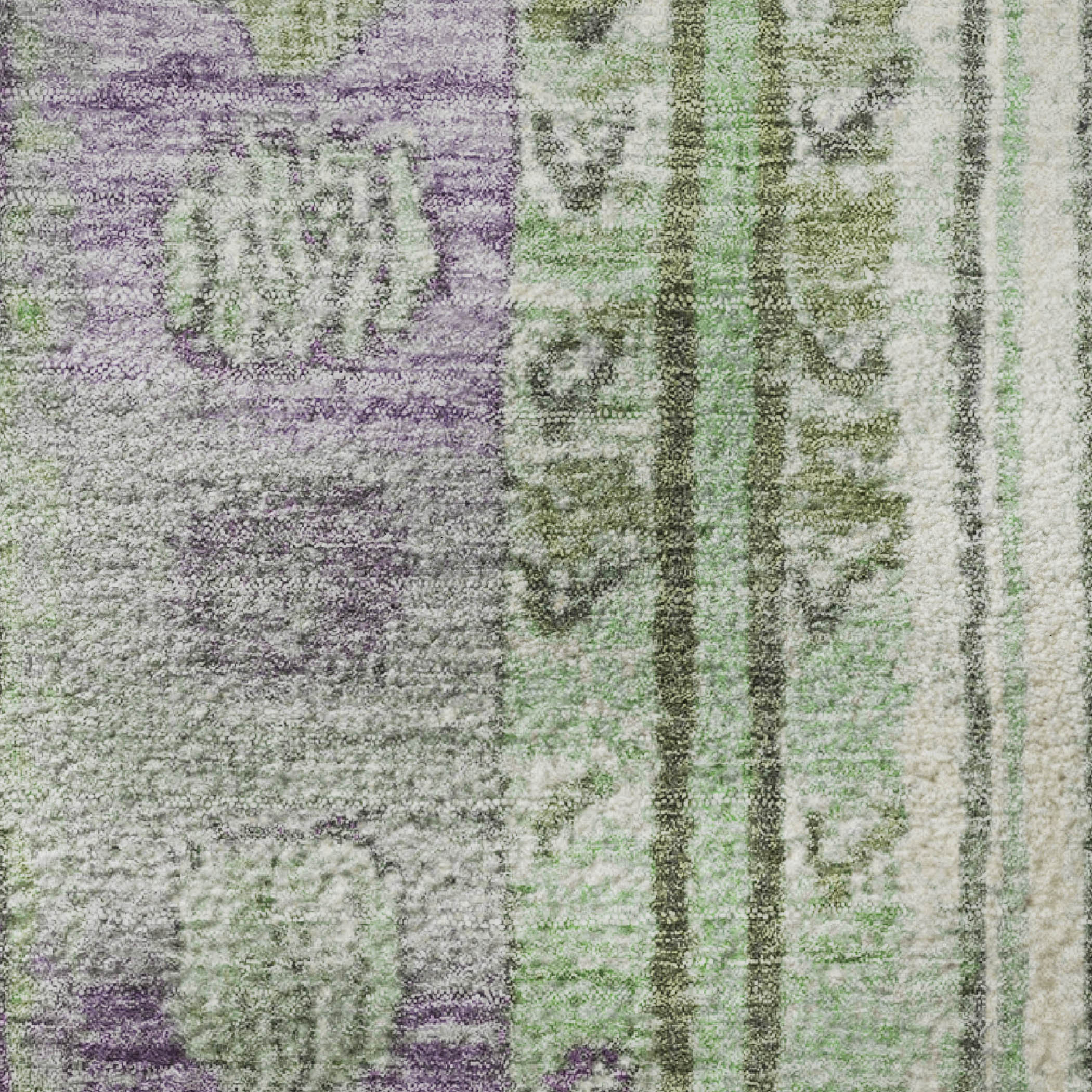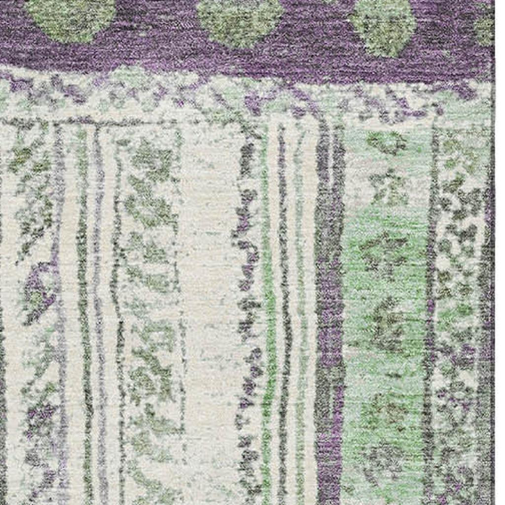 Set an inviting tone in your space with this 5-foot x 8-foot purple green and ivory striped washable area rug with uv protection. Ideal for spaces with kids and pets, this rug is stain resistant to help repel dirt and spilled liquids. Built to last, this rug crafted from polyester fibers is known for its durability and long lasting appeal. Rugs are a great way to showcase your style, hide imperfections, warm your home and reduce noise. This larger sized, transitional styled rug is ready to create a focal point or statement piece in your room. 60.00-inch h x 90.00-inch w x 0.39-inch d.