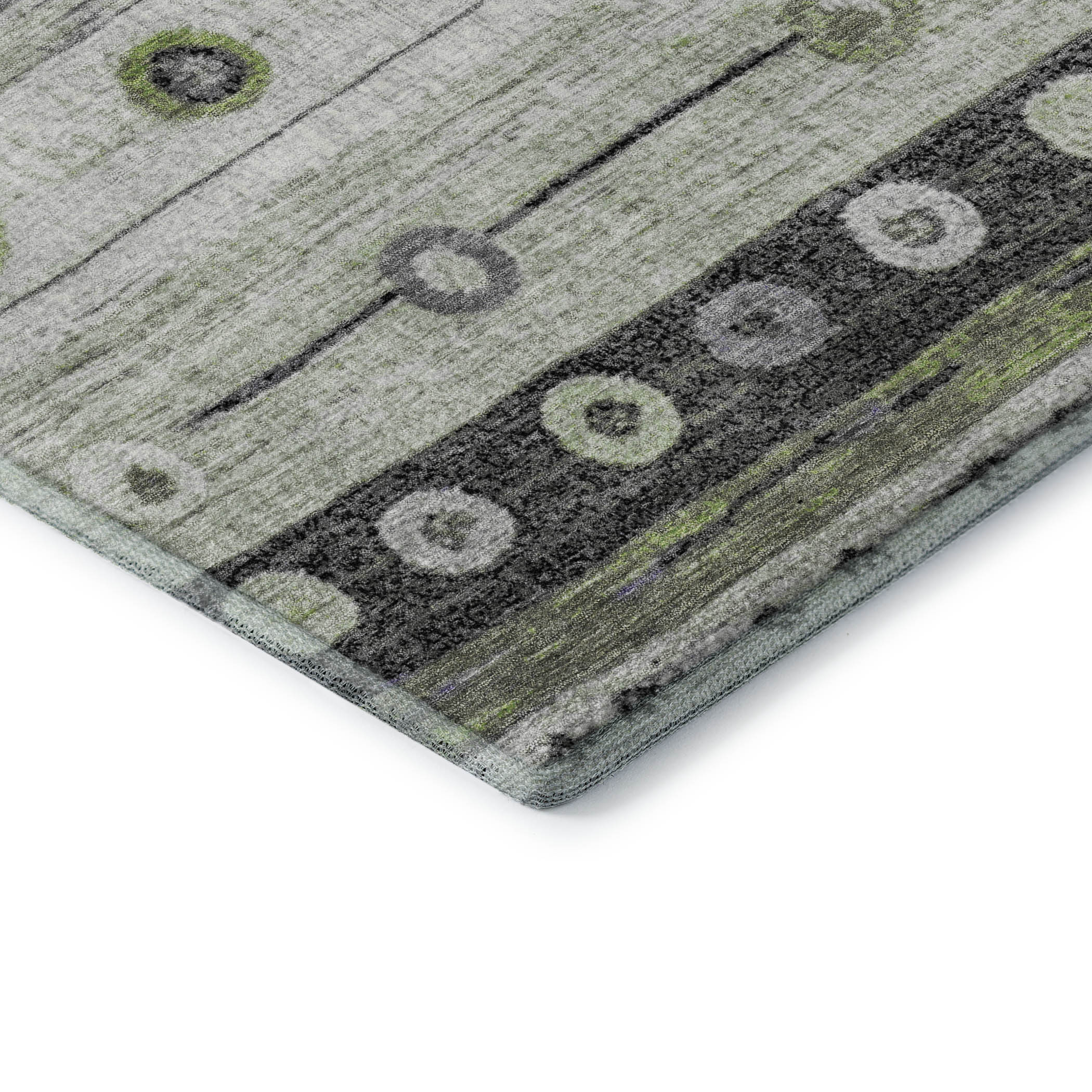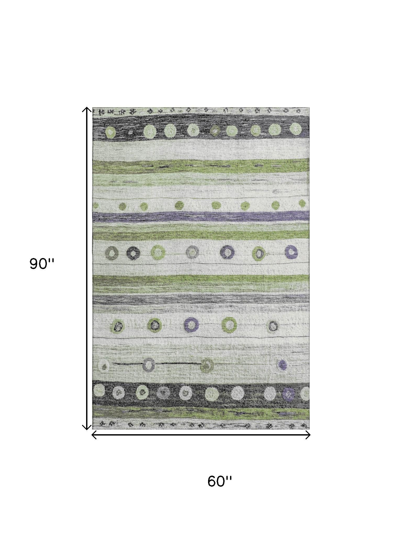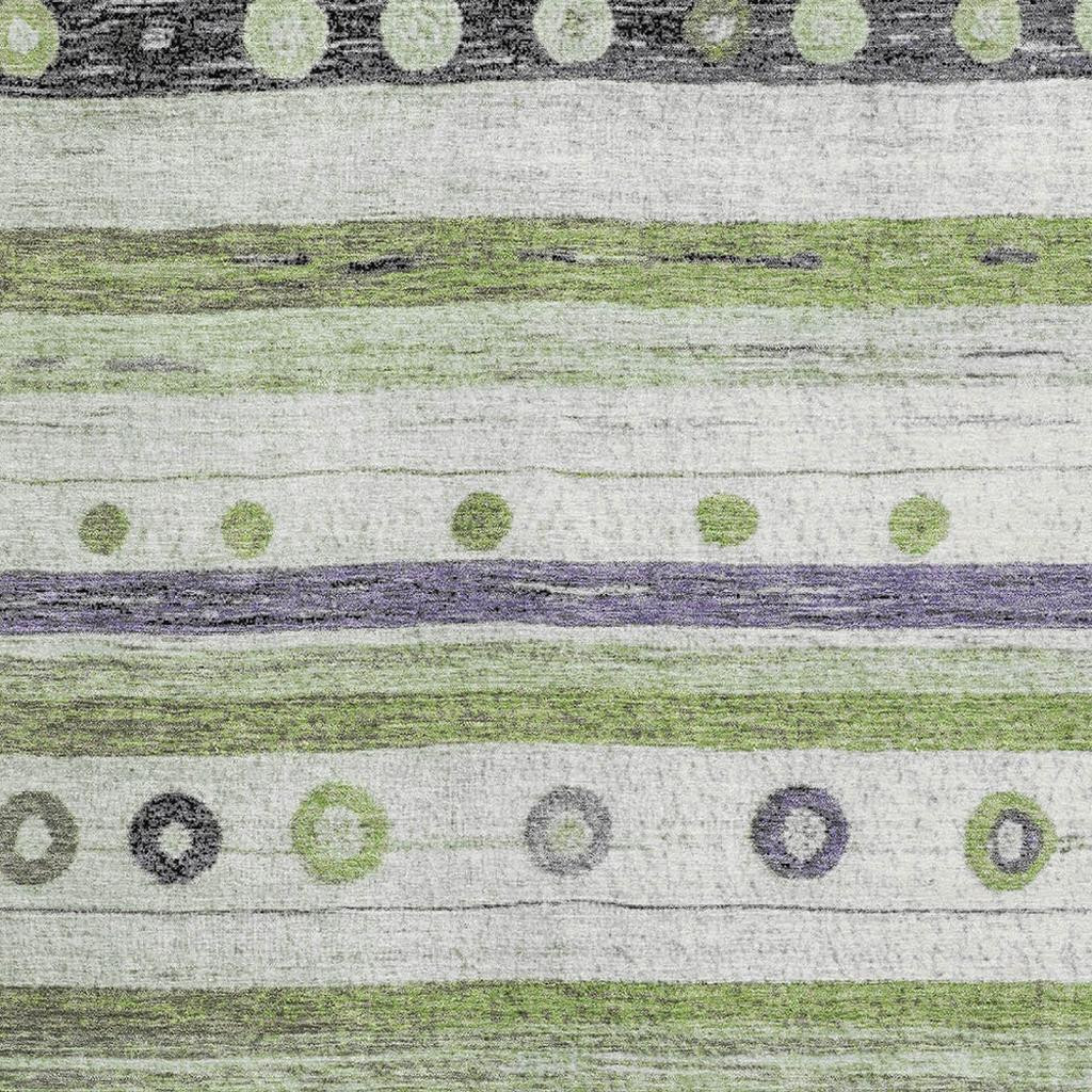 Set an inviting tone in your space with this 5-foot x 8-foot artichoke green purple and ivory striped washable area rug with uv protection. Ideal for spaces with kids and pets, this rug is stain resistant to help repel dirt and spilled liquids. Built to last, this rug crafted from polyester fibers is known for its durability and long lasting appeal. Rugs are a great way to showcase your style, hide imperfections, warm your home and reduce noise. This larger sized, transitional styled rug is ready to create a focal point or statement piece in your room. 60.00-inch h x 90.00-inch w x 0.39-inch d.