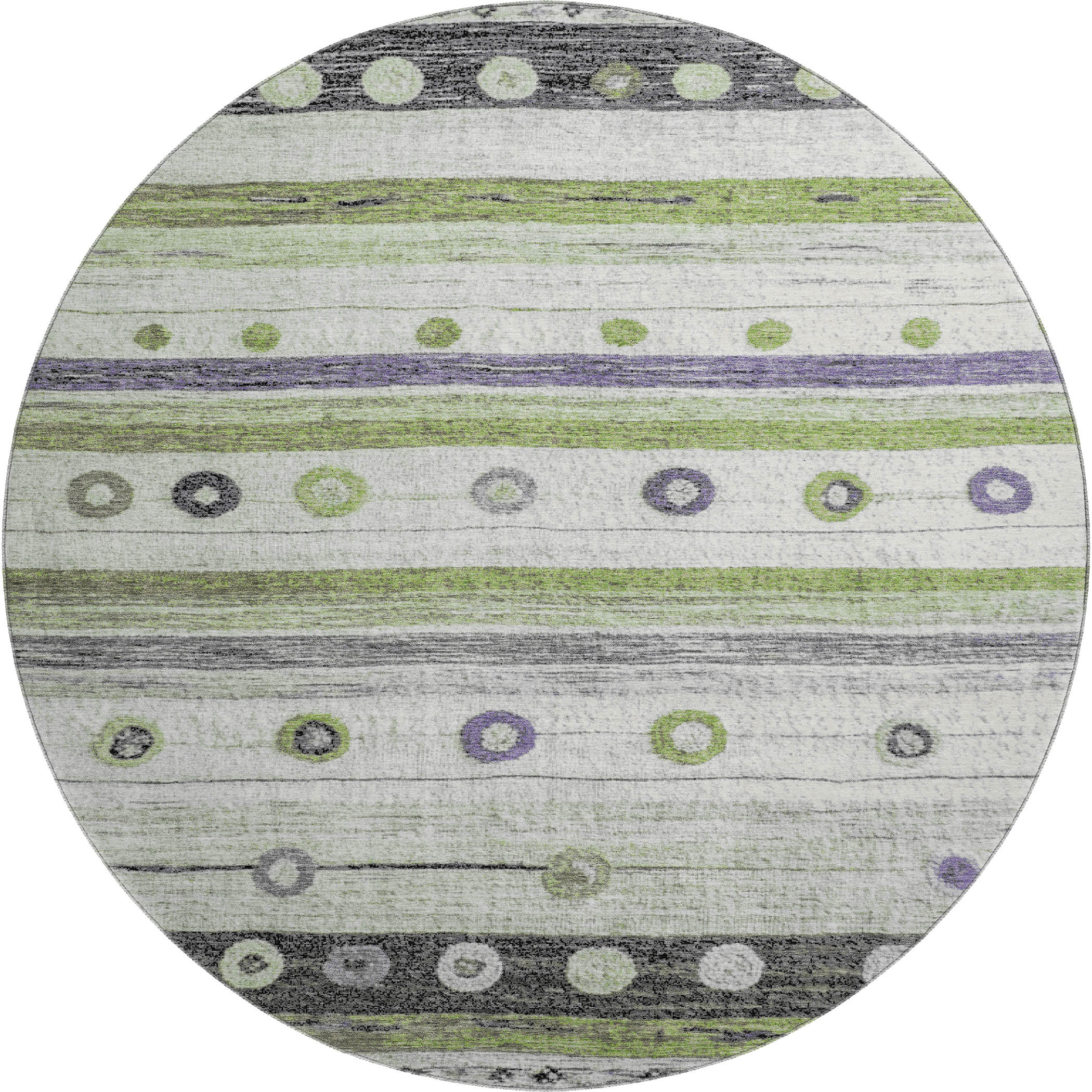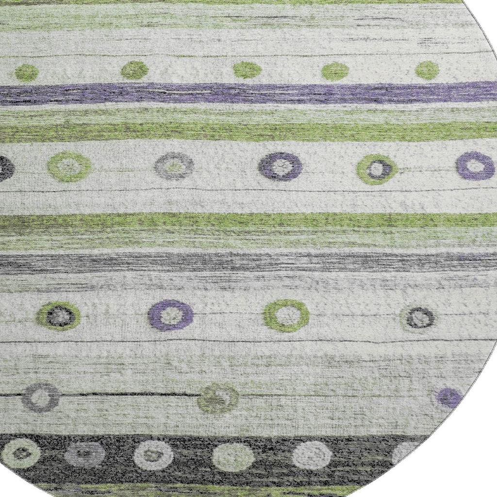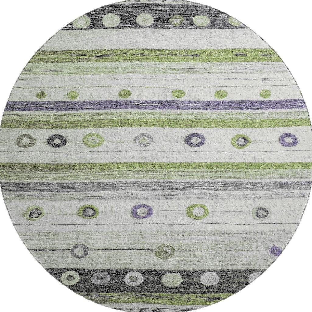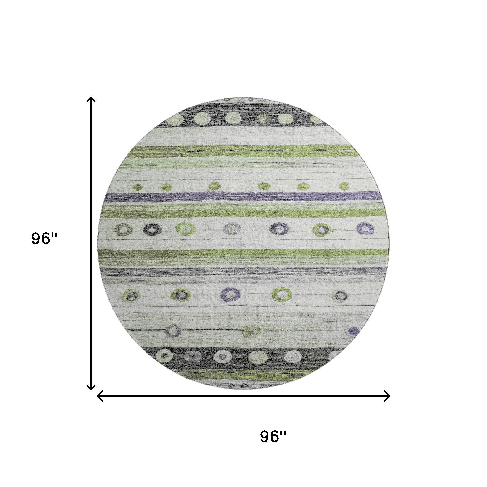 Add some artistry to your room with this 8-foot artichoke green purple and ivory striped washable round rug with uv protection. Ideal for spaces with kids and pets, this rug is stain resistant to help repel dirt and spilled liquids. Built to last, this rug crafted from polyester fibers is known for its durability and long lasting appeal. Rugs are a great way to showcase your style, hide imperfections, warm your home and reduce noise. This larger sized, transitional styled rug is ready to create a focal point or statement piece in your room. 96.00-inch h x 96.00-inch w x 0.39-inch d.