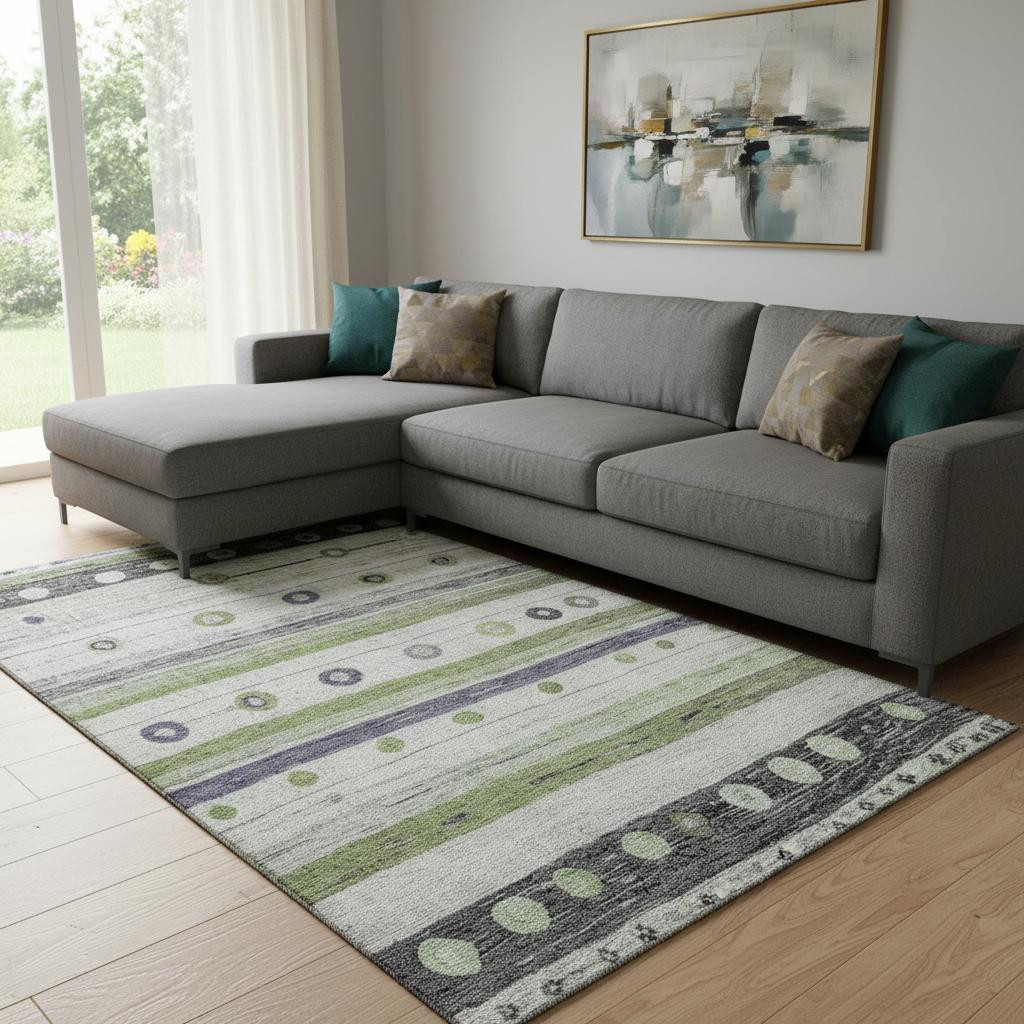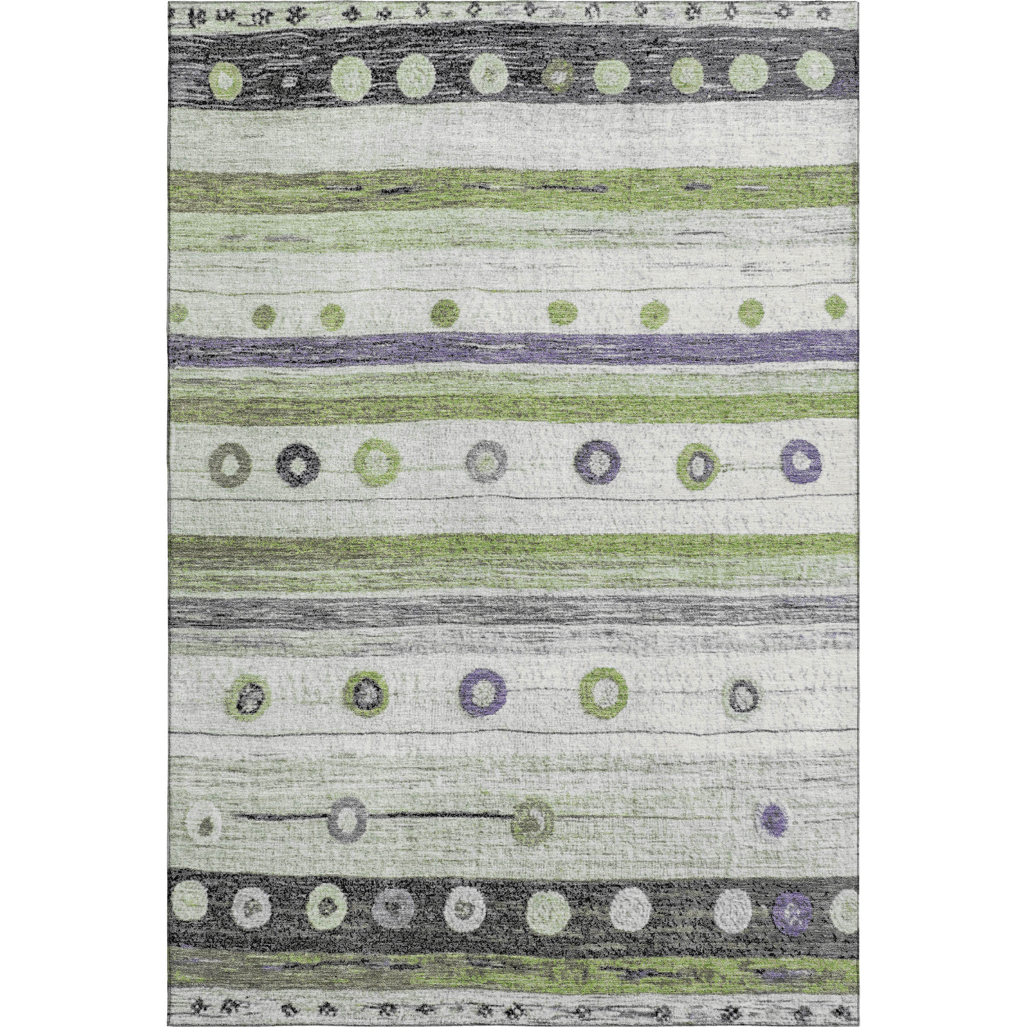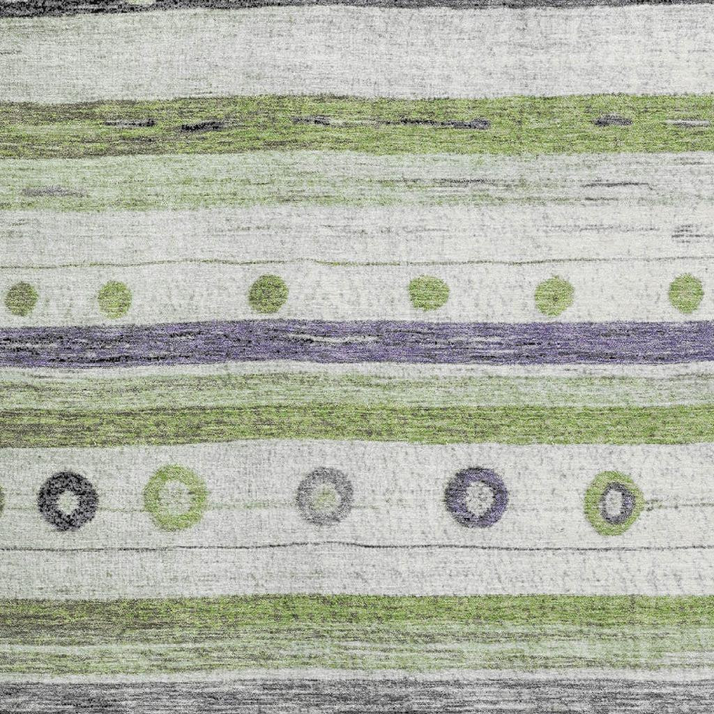 This 8-foot x 10-foot artichoke green purple and ivory striped washable area rug with uv protection, is a great way to add warmth to a room. Ideal for spaces with kids and pets, this rug is stain resistant to help repel dirt and spilled liquids. Built to last, this rug crafted from polyester fibers is known for its durability and long lasting appeal. Rugs are a great way to showcase your style, hide imperfections, warm your home and reduce noise. This larger sized, transitional styled rug is ready to create a focal point or statement piece in your room. 96.00-inch h x 120.00-inch w x 0.39-inch d.